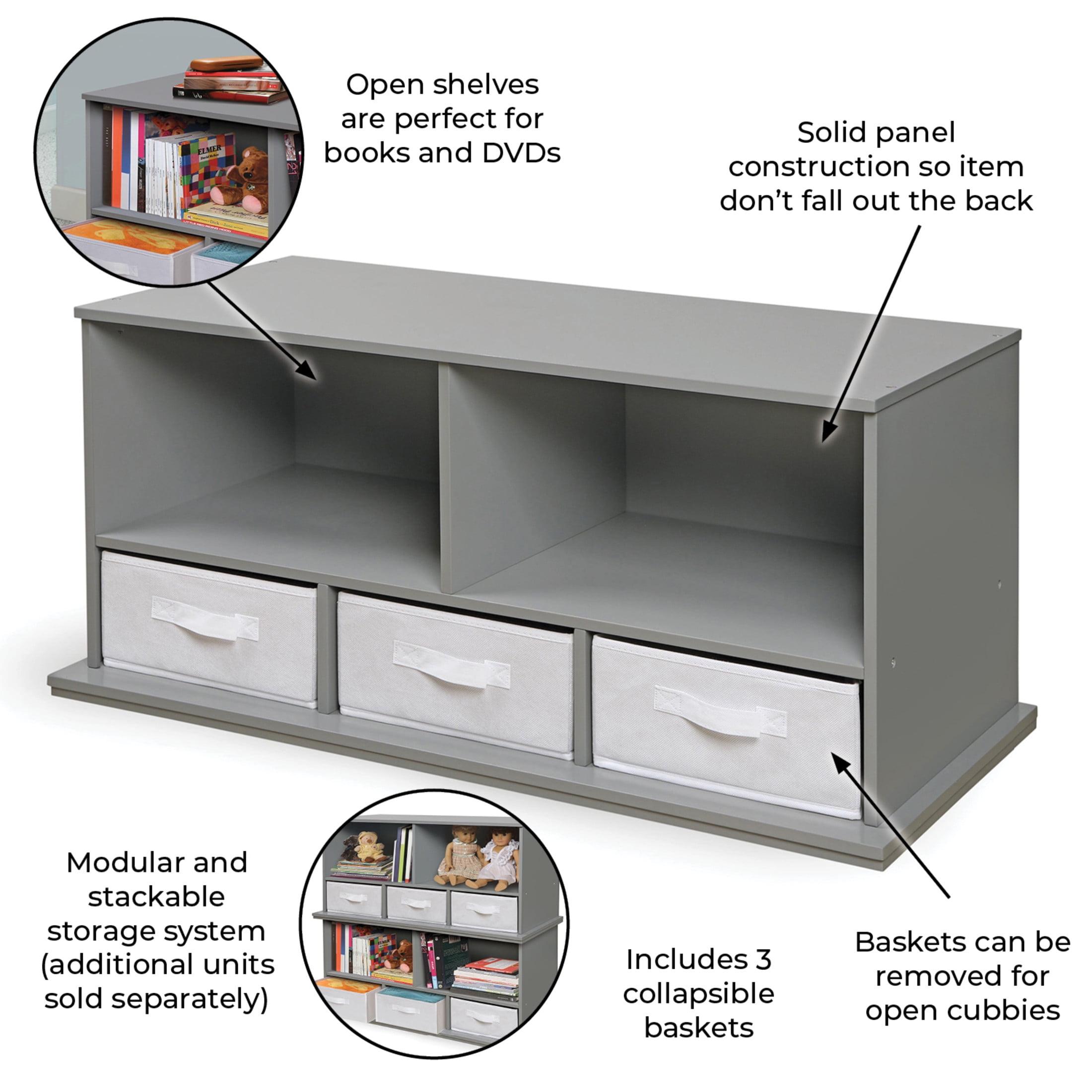 Sturdy, modular, and expandable storage great for sorting and organizing toys, crafts, and more Compatible with Badger Basket Two Bin, Three Bin, and Shelf Storage units (each sold separately in a range of colors) Solid panel construction Easily sort and separate your stuff using the two open shelves and three removable baskets Wipe clean as needed and dry thoroughly Overall unit measures approximately 37 inches L x 16.5 inches W x 17.25 inches H Made of engineered wood with non-toxic painted finish Manufacturer’s 30 Day Limited Warranty