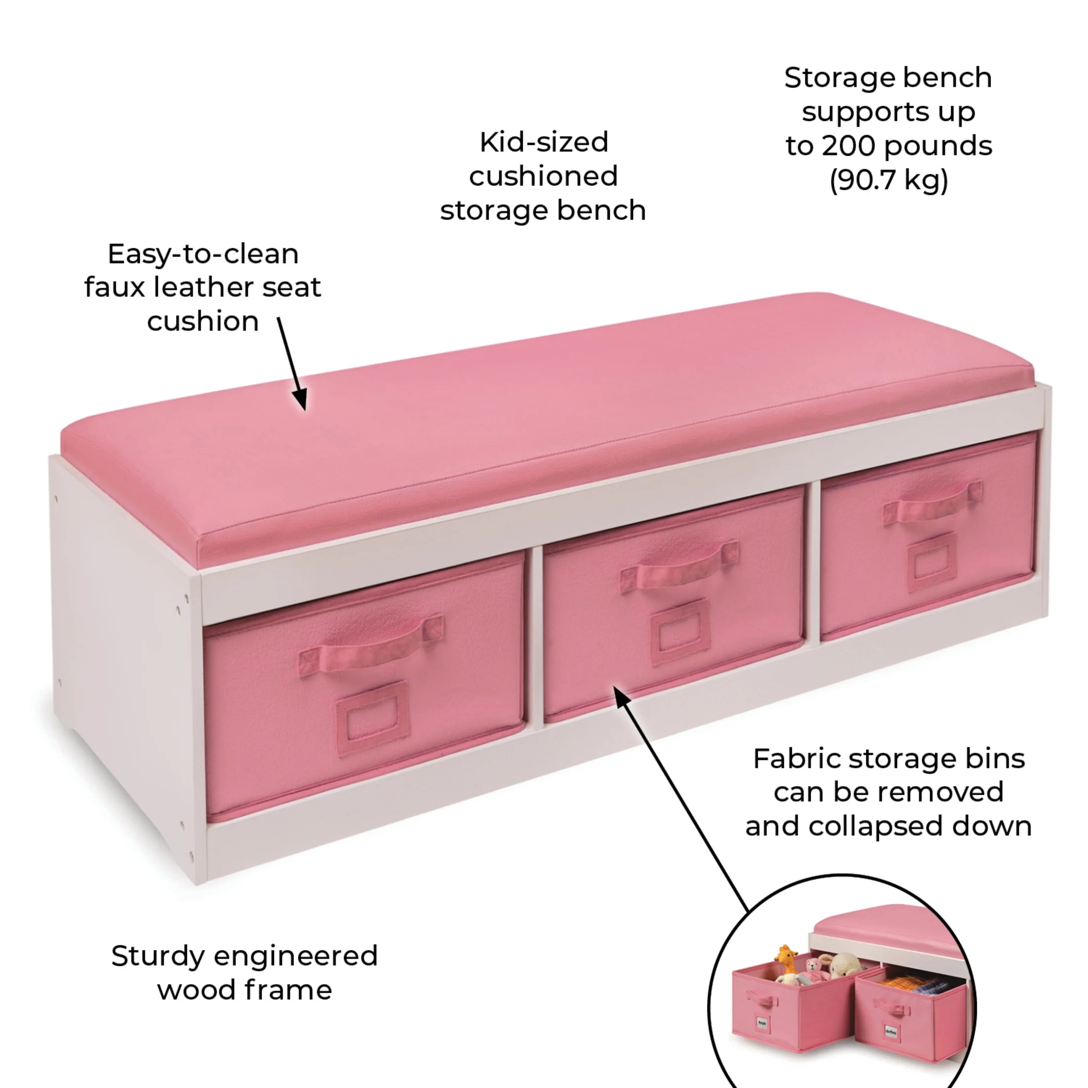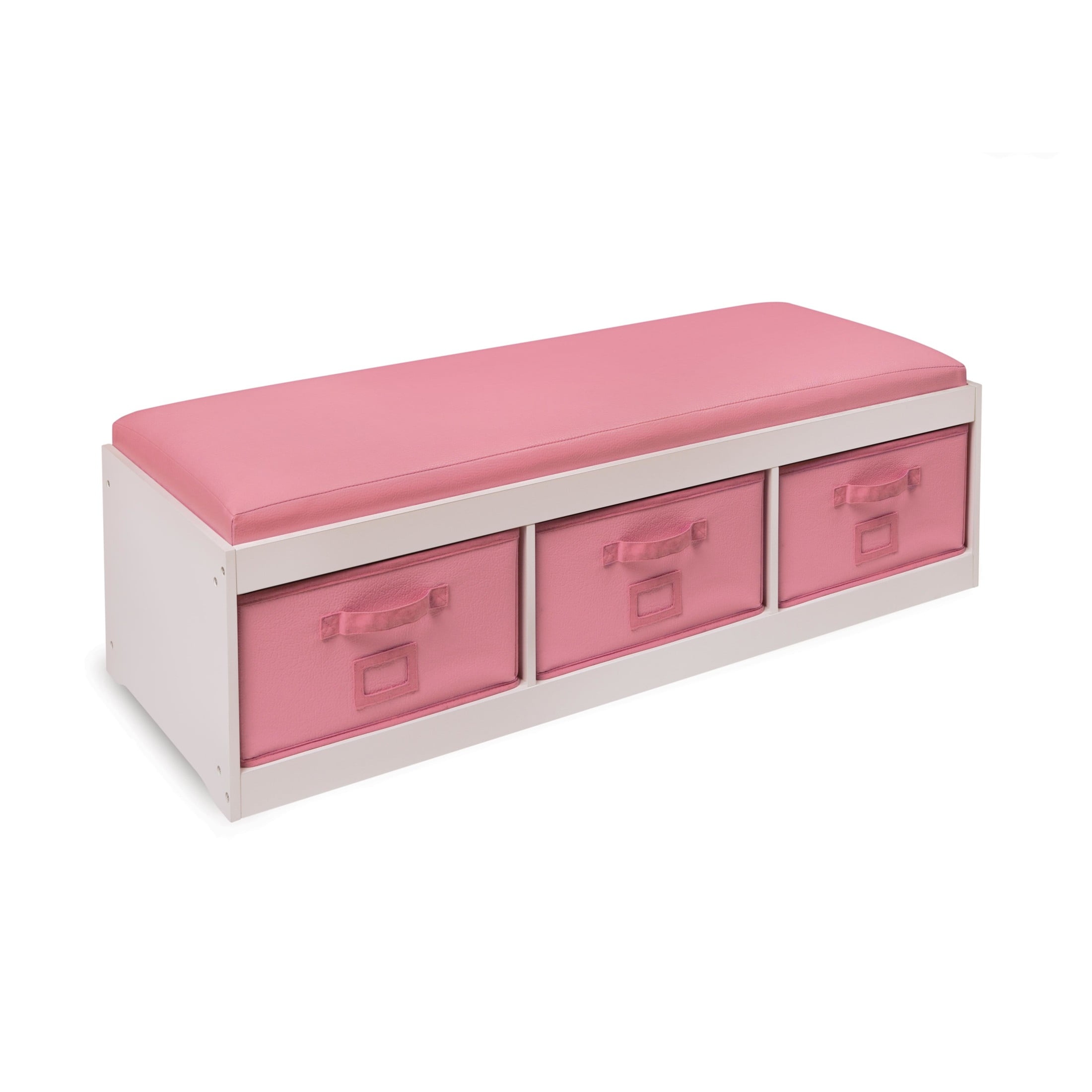 Badger Basket Children’s Wooden 17.3 gal Toy Storage Bench with Cushion and Fabric Bins, White & Pink