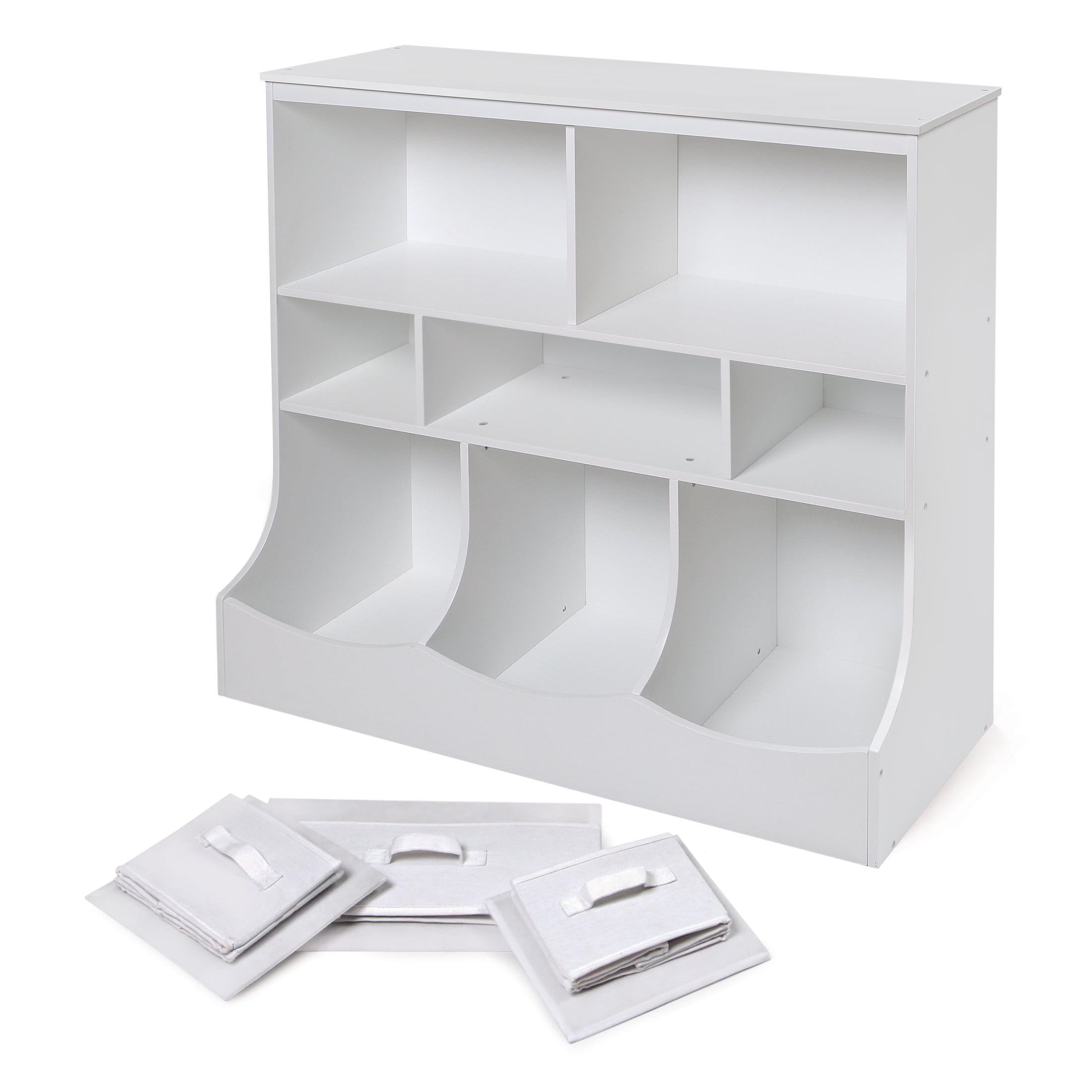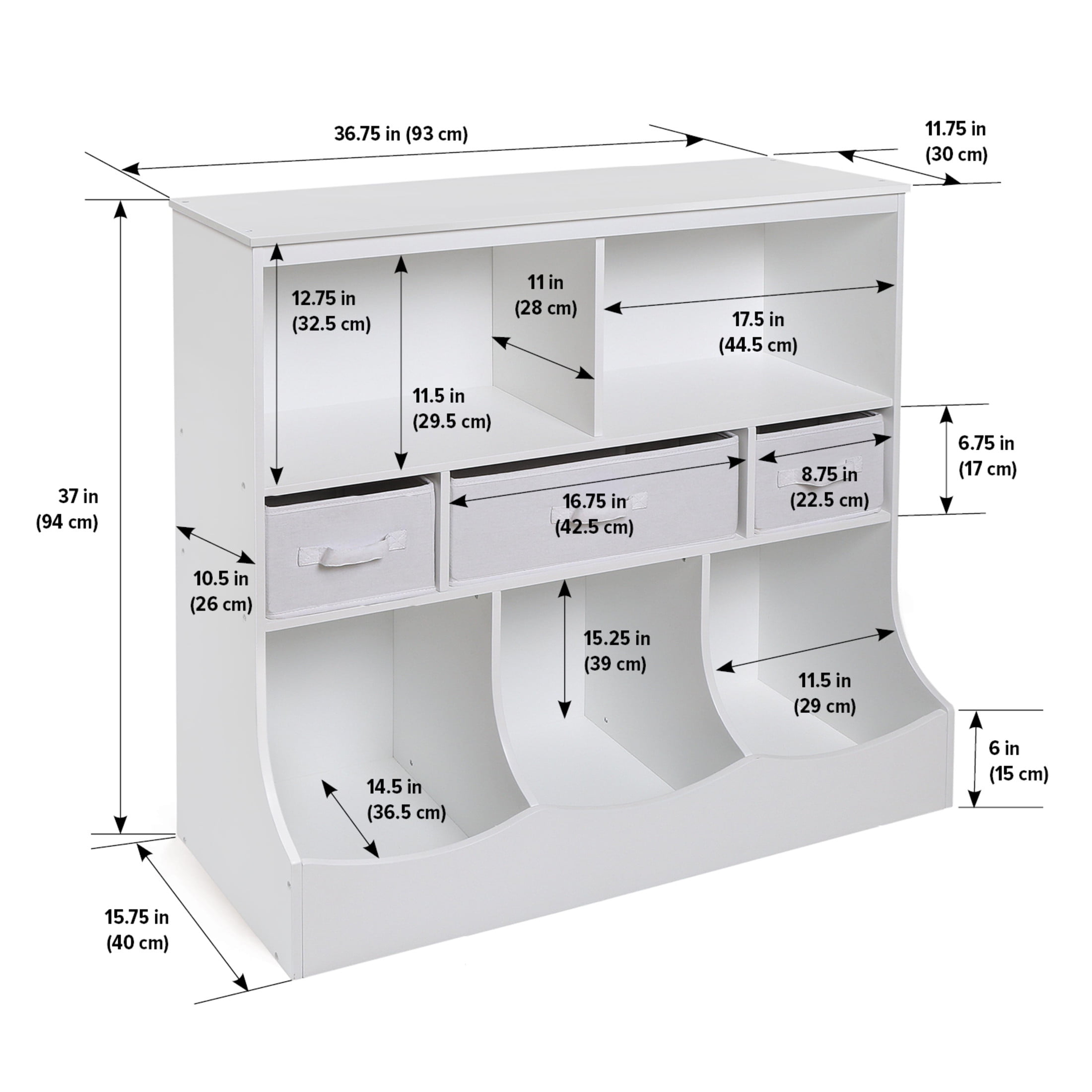 All-in-one combination storage unit features a shelf, baskets, and storage bins Features two open shelves, three baskets, and three open bins Ideal for kid’s toys such as action figures, building blocks, plush animals and more Perfect for playrooms, bedrooms, living rooms, and basements Teaches children to sort, categorize, and tidy up Baskets are fully removable if you want open compartments instead Easy to clean solid panel construction so nothing is lost out the back or sides Overall size 36.75 inches L x 15.75 inches W (11.75 inches at the top) x 37 inches H Top surface offers an additional place to place your keys or display photos and trophies Made with LDF and MDF and non-woven fabric Wipe clean with a damp cloth and mild detergent and dry thoroughly (baskets may be spot cleaned) 8.6 cubic feet storage capacity 100 pound weight capacity Adult assembly required Manufacturer’s 30 Day Limited Warranty