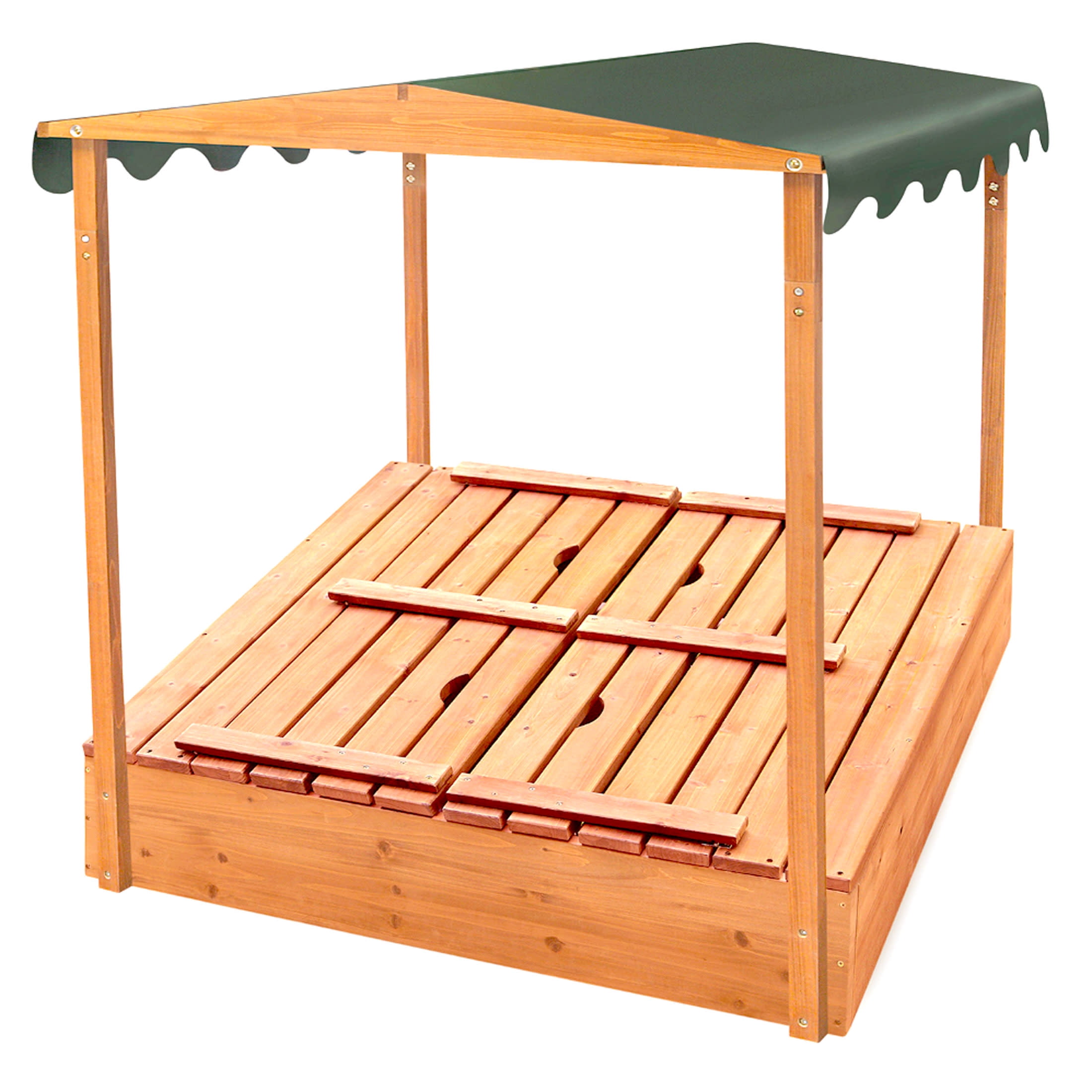 Badger Basket Covered Convertible Cedar Sandbox with Canopy and Two Bench Seats features two comfortable benches, canopy top for shade, and measures 46.5 inches L x 46.5 inches W x 9.5 inches H (57 inches to top of canopy) Benches fold flat to cover the sand when play time is done Hand grips make it easy to fold and unfold Bottomless construction helps with drainage and allows you to adjust sand depth Made with heat-treated, stained cedar wood and rust-resistant hardware Each bench can support up to 200 pounds Holds approximately 750 pounds of sand to fill it 6 inches deep (sand not included) Manufacturer’s 30 Day Limited Warranty