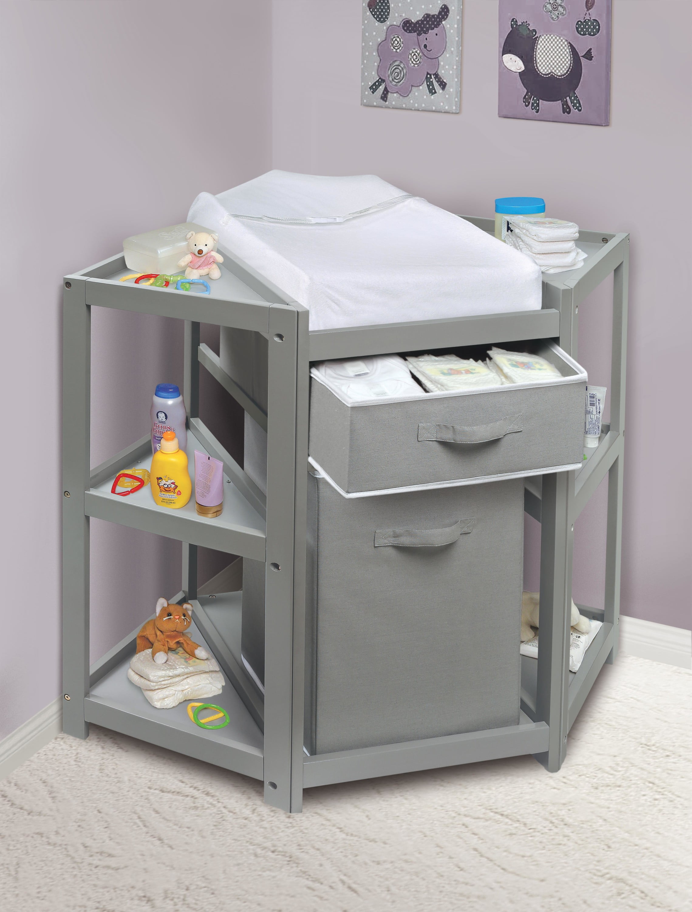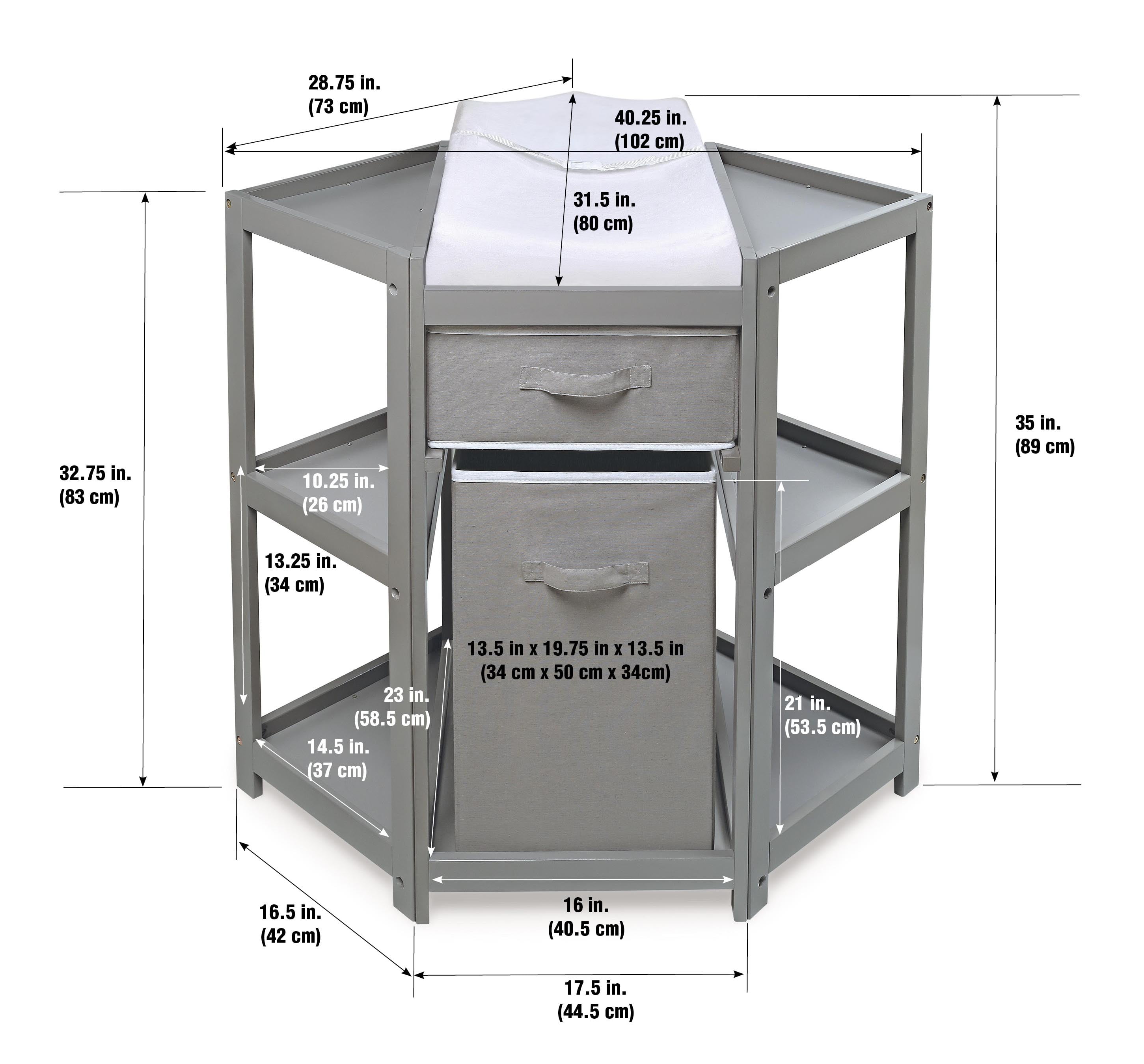 Transform a corner of your baby’s nursery into a deluxe dressing and diapering station Includes a laundry hamper and a storage basket for diapers and changing supplies Change your baby’s diaper with feet pointing towards you Comes complete with a foam changing pad, fabric pad cover, and safety belt Wipe and spot clean as needed Measures approximately 35 inches H, 31.5 inches from the back corner to the front edge, and 40.25 inches W from corner to corner For children weighing up to 30 pounds Manufacturer’s 30 Day Limited Warranty