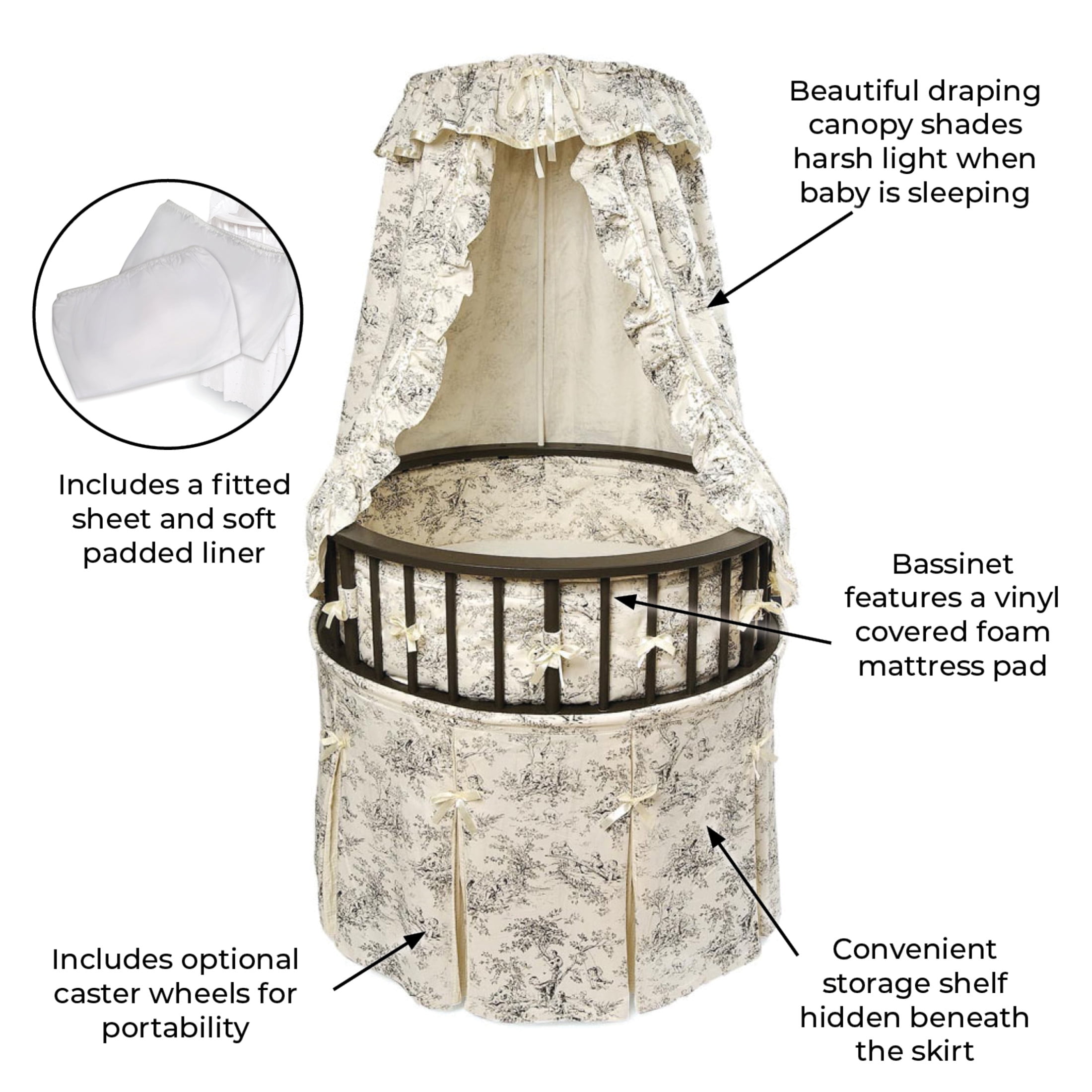 Complete bassinet with machine washable bedding (skirt, liner, fitted sheet, canopy, foam pad) Convenient storage shelf hidden beneath the skirt Includes caster wheels Drape canopy shades the 29.5 inch W x 8.5 inch H interior where Baby sleeps Bassinet frame is made with wood, MDF, metal, and plastic Overall size 32 inches in diameter x 49 inches H For use up to 20 lbs, 3-4 months, or until Baby can push up, roll over, or sit unassisted (whichever limit comes first) This product is designed with a firm, flat sleeping surface that meets the Consumer Product Safety Commission’s recommendations for safe sleep.