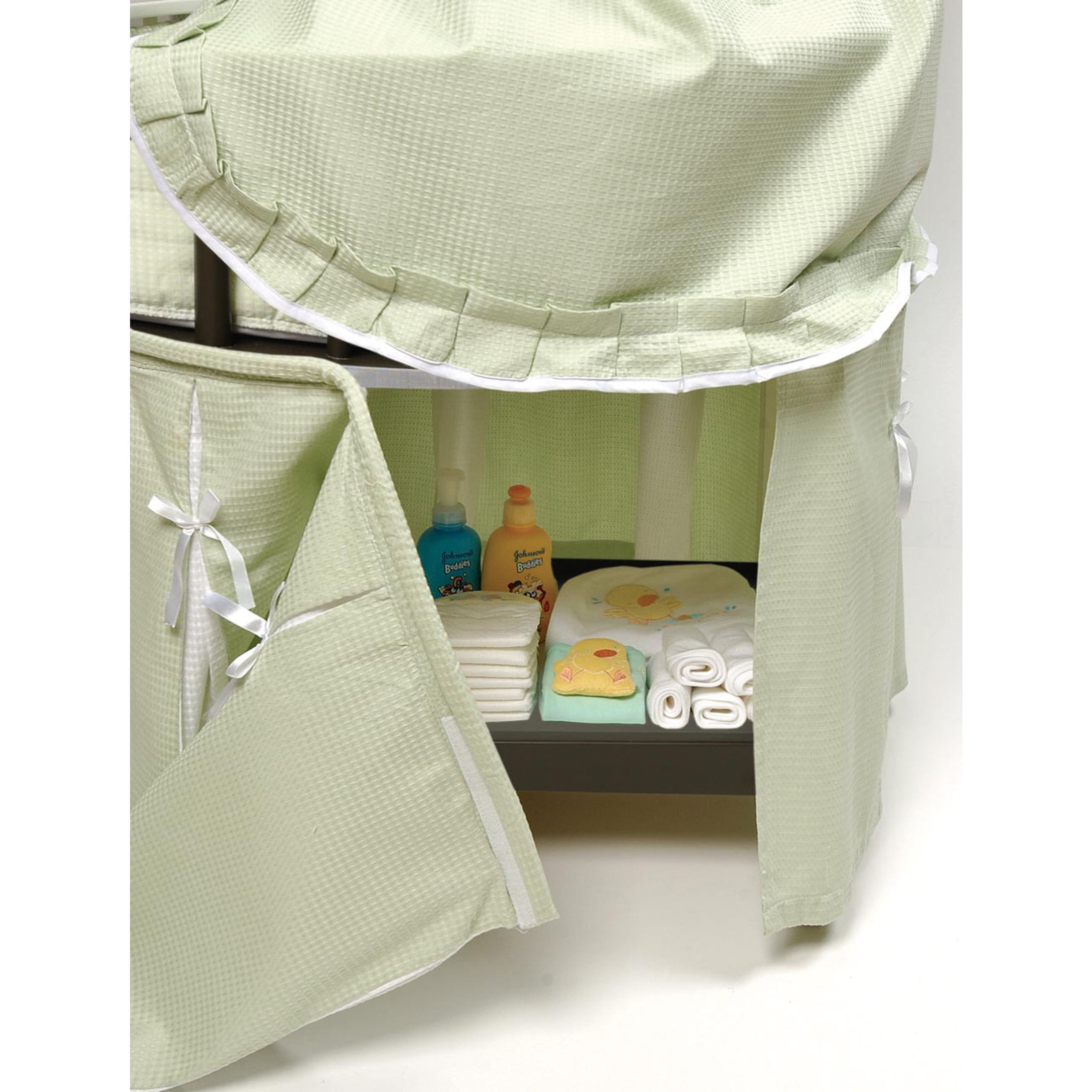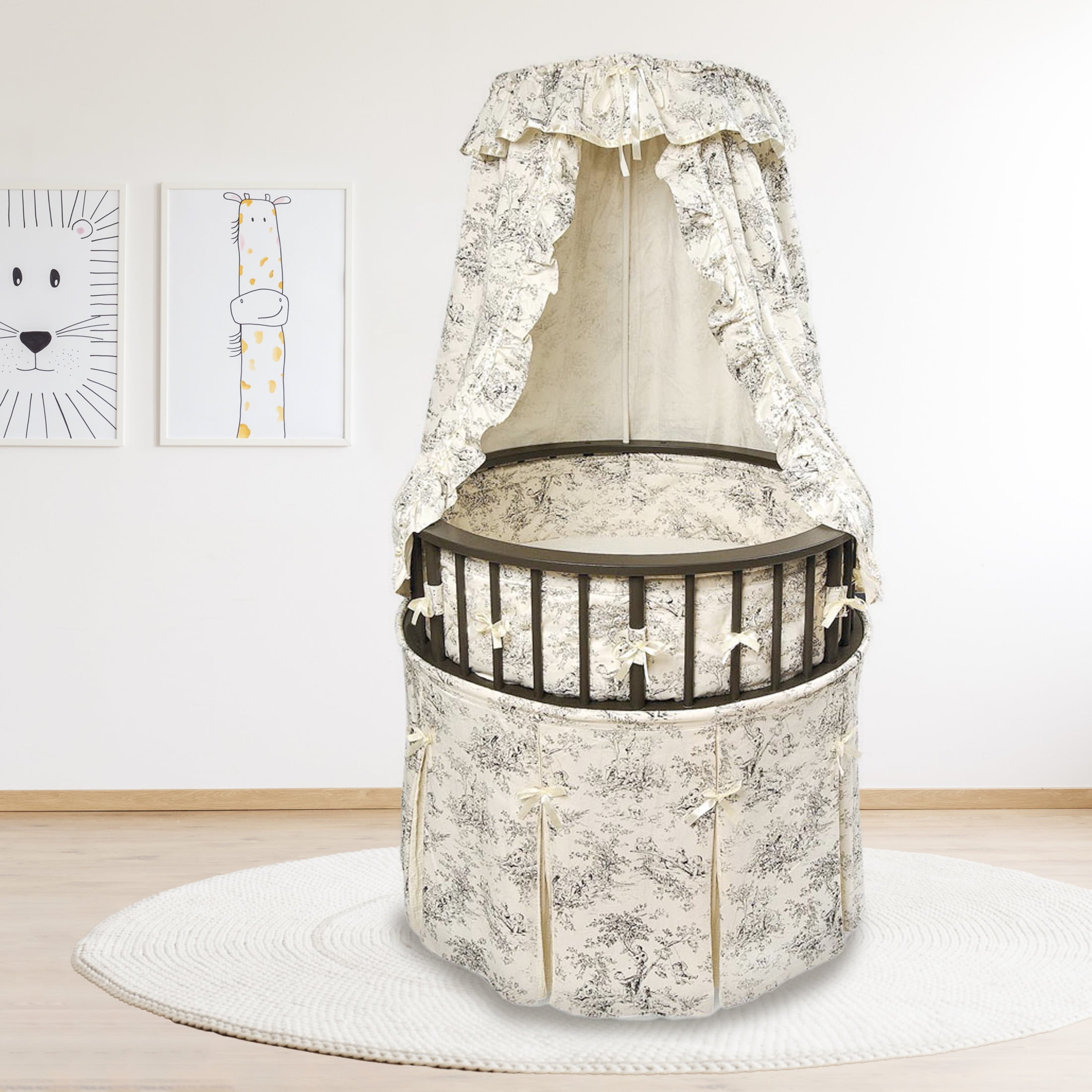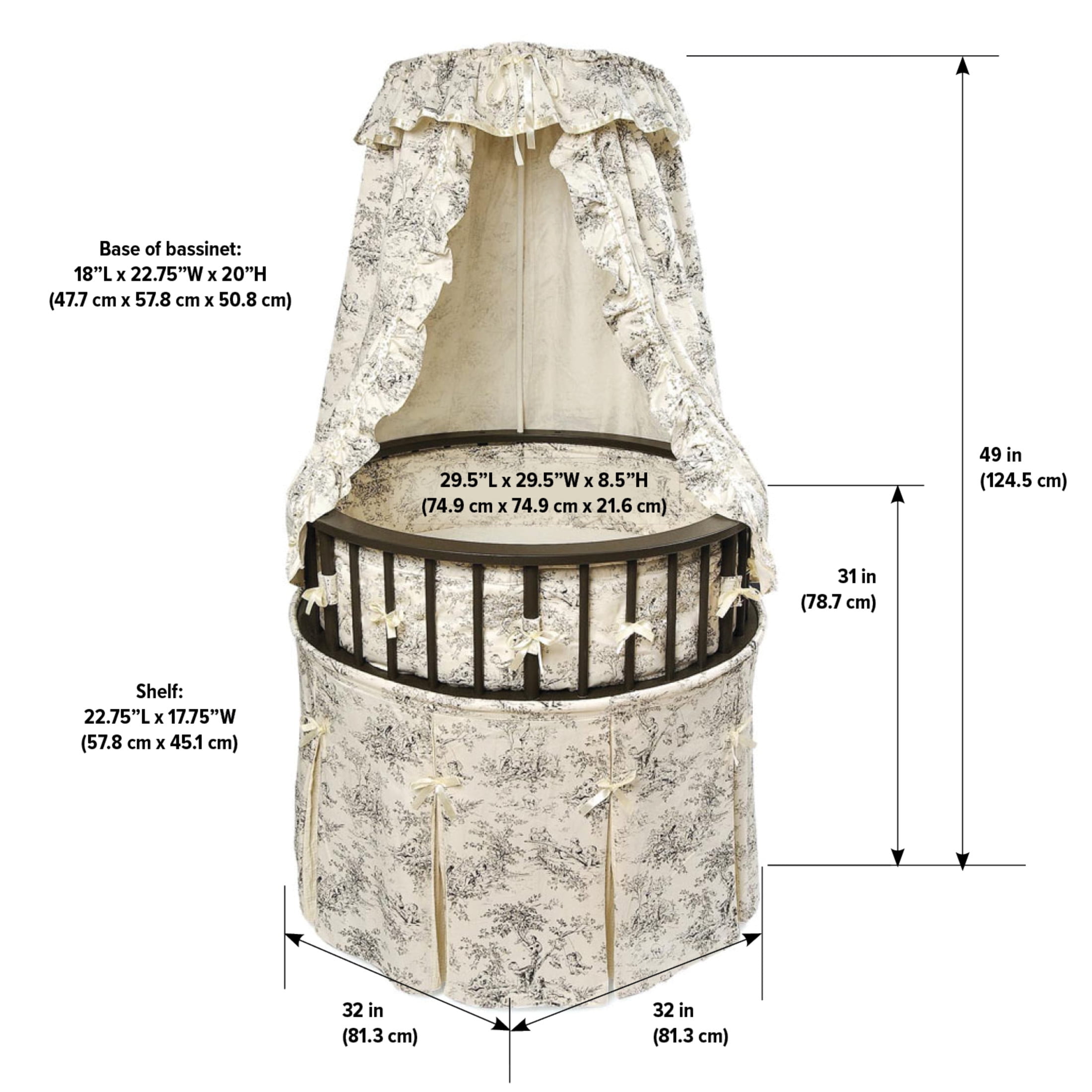 Badger Basket’s Elegance Round Baby Bassinet with Canopy is the most charming and unique place for your newborn to sleep! This special round bassinet is comfortable for Baby and stylish for your home. Bedding set includes a lovely skirt, soft interior liner, fitted sheet, drape canopy, and custom fitted, vinyl covered foam mattress pad. Graceful, two-position adjustable canopy shades the interior to keep out harsh light while Baby is snoozing. Bassinet also includes caster wheels (never move the bassinet with your infant inside). Liner attaches with grip tape and ribbon ties and padded with polyester fill. Storage shelf is hidden by the long skirt and creates a storage area for feeding and changing necessities and small toys. Bedding fabric is 80% Polyester/20% Cotton. Bassinet frame is made with wood, MDF, metal, ABS plastic, PEVA (non-PVC) vinyl, and polyurethane foam. Overall unit measures 32 inches L x 32 inches W x 49 inches H. Generously sized interior measures 29.5 inches in diameter and is 8.5 inches deep. Bassinet base measures 18 inches L x 22.75 inches W x 20 inches H. Canopy positions: 24 inches and 28.5 inches (as measured from the rim of the bassinet to the top of the canopy). Measures 31 inches from the rim of the bassinet to the floor. Storage shelf measures 22.75 inches L x 17.75 inches W with 16 inches clearance between the shelf and bassinet bottom. Foam pad measures 29.5 inches in diameter x 1 inch H. Assembled product weight: 32 lbs. All measurements approximate. All bedding is machine washable (in cold water and gentle cycle). Tumble dry low, warm iron if needed. Wipe the frame and mattress pad clean with a damp cloth and mild detergent and dry thoroughly. Adult assembly required. Illustrated instructions included. Bassinet is for use up to 20 lbs. (9.09 kg), 3-4 months, or until Baby can push up, roll over, or sit unassisted (whichever limit comes first). In order to comply with current safety standards, the mattress does not exceed 1 inch in thickness. Please assemble this bassinet in the room where you intend to use it unless your doorways are wider than 33 inches. Storage shelf designed for lightweight items (up to 5 lbs. total). Additional fitted sheets sold separately in packages of two (Model #00025 White and Model #00022 Ecru). Product includes a limited warranty of 30 Days Parts to the original purchaser. Product details/features subject to change at any time without notice. Props/accessories shown are for illustration purposes only and are not included with the product. Actual color/finish may vary slightly from screen display. This item ships in its original carton that may include a product photo.