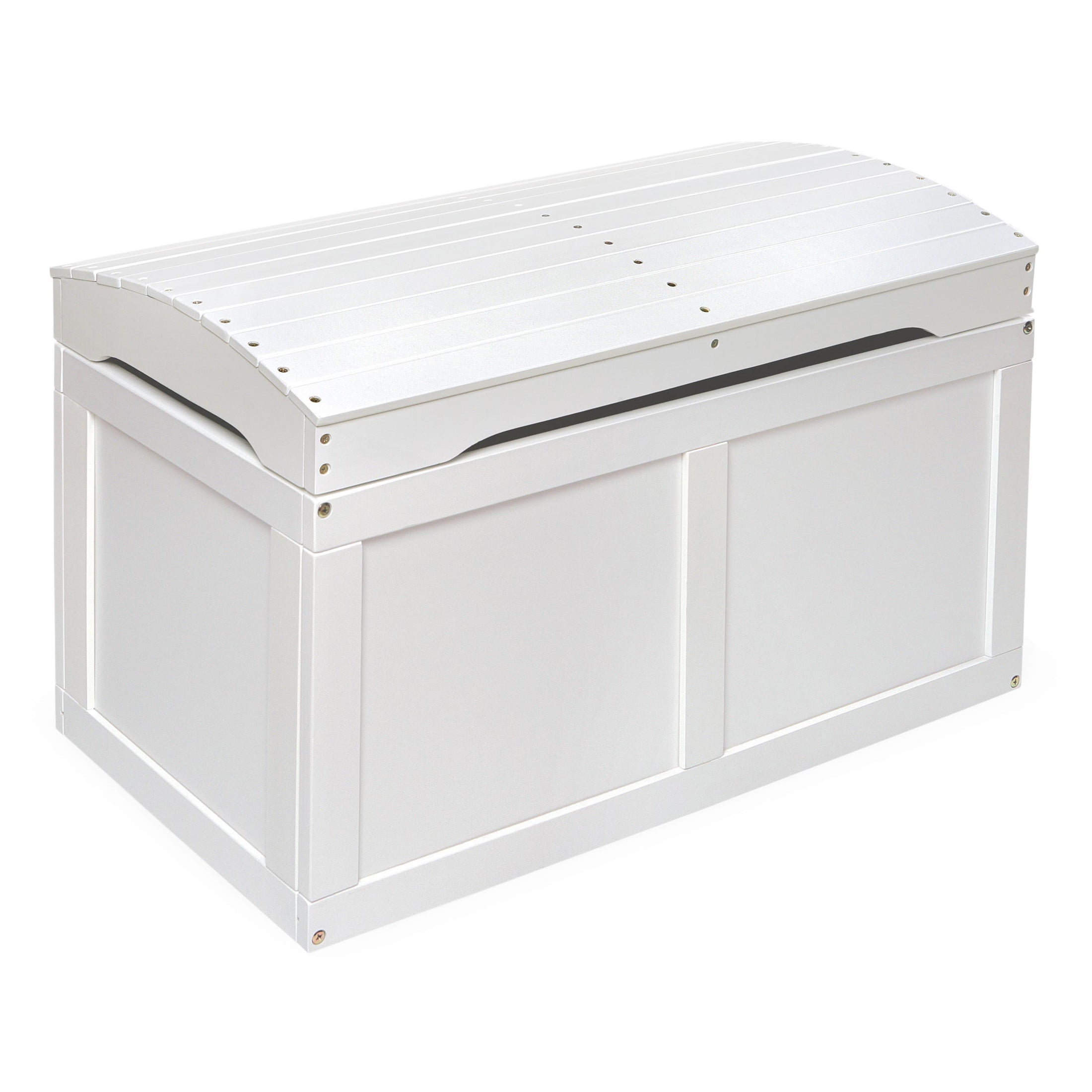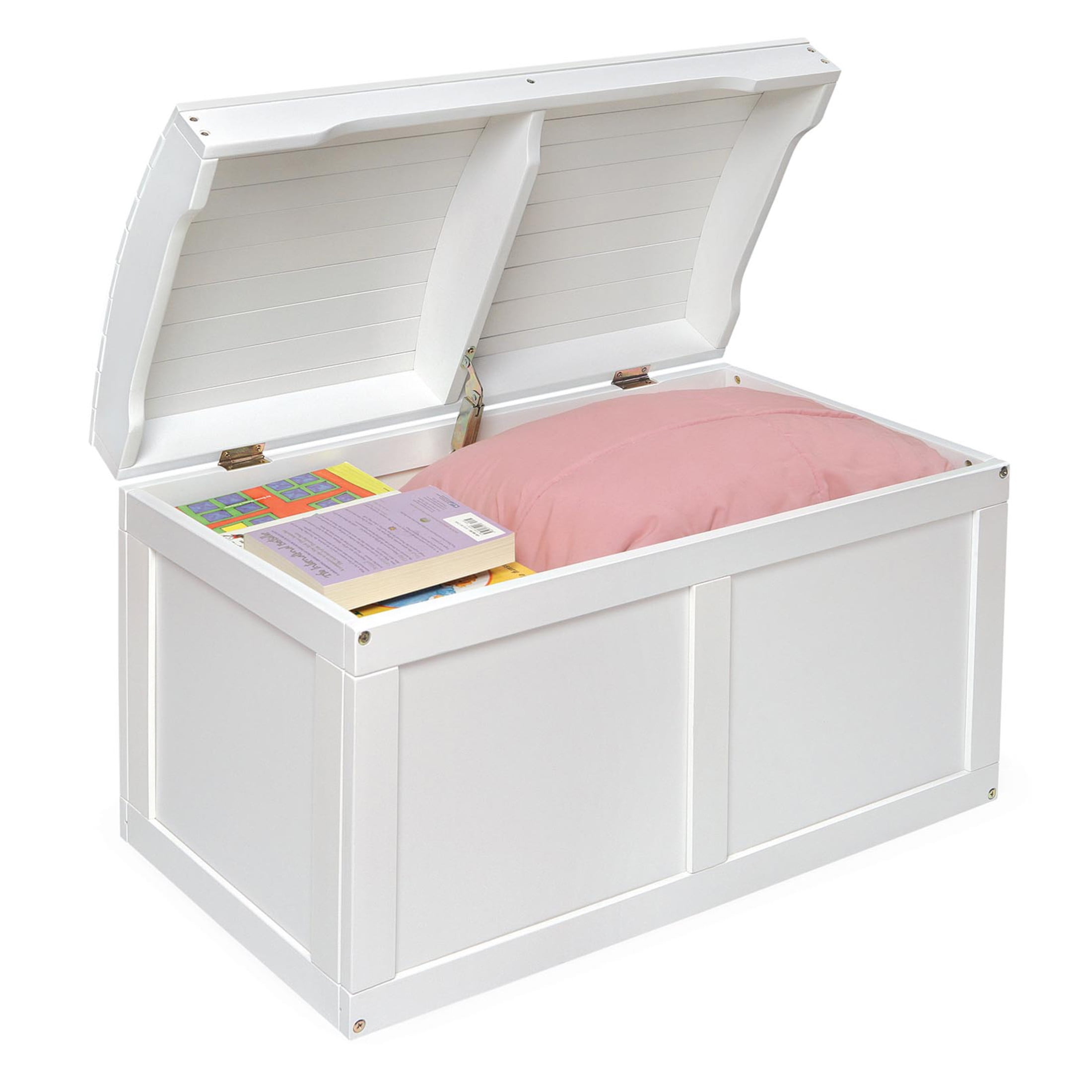 A sturdy heirloom style kid’s toy chest Perfect for storing toys, board games, dolls, blankets, and more Safety support hinge holds the lid open so it won’t slam shut on your fingers Solid panel construction with handle slots on front and sides Made with solid wood, multi-layer wood, and laminated MDF with a non-toxic finish Wipe clean as needed and dry thoroughly Overall size of 31 inches L x 17 inches W x 19 inches H 50 pound internal weight limit