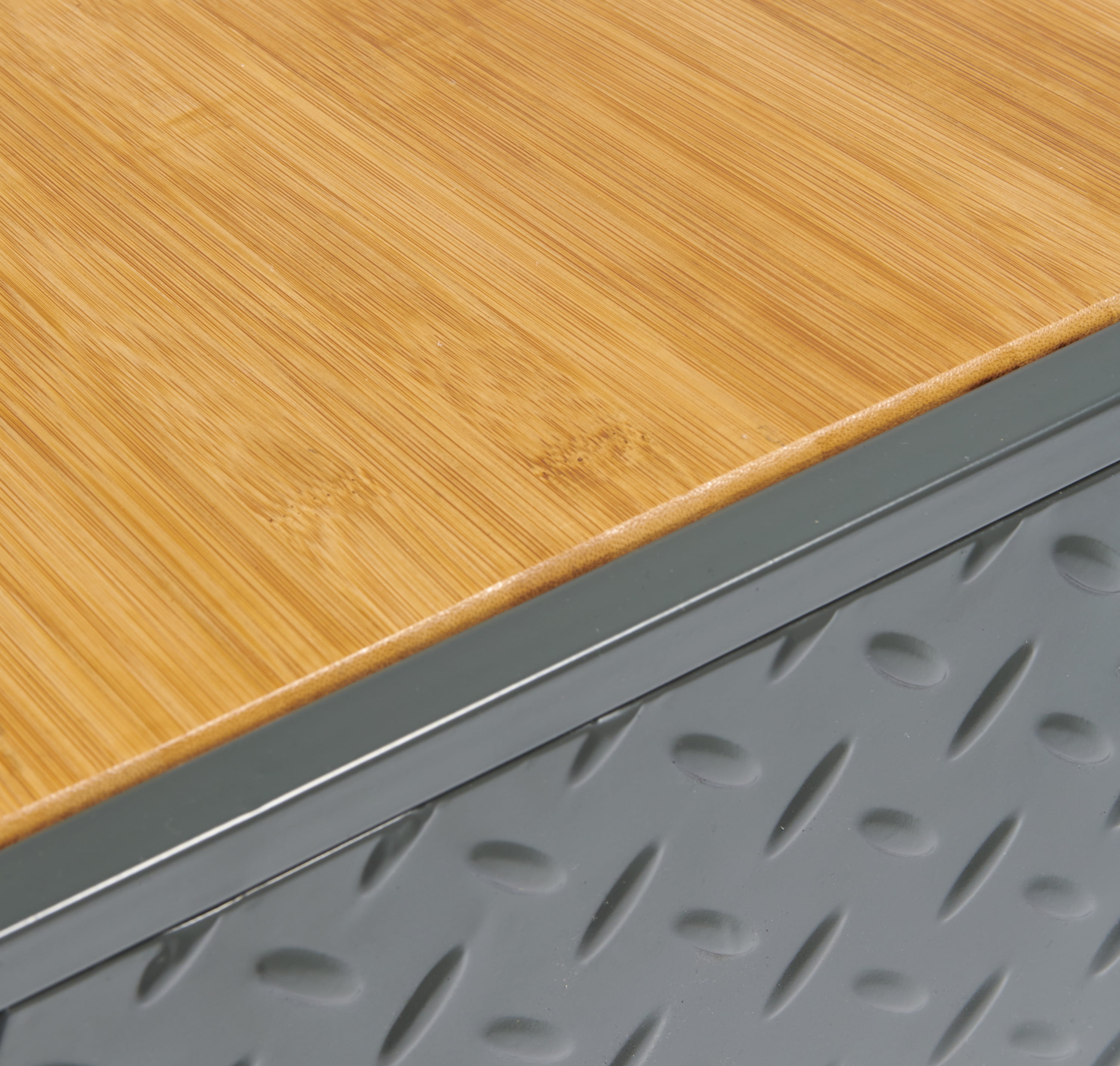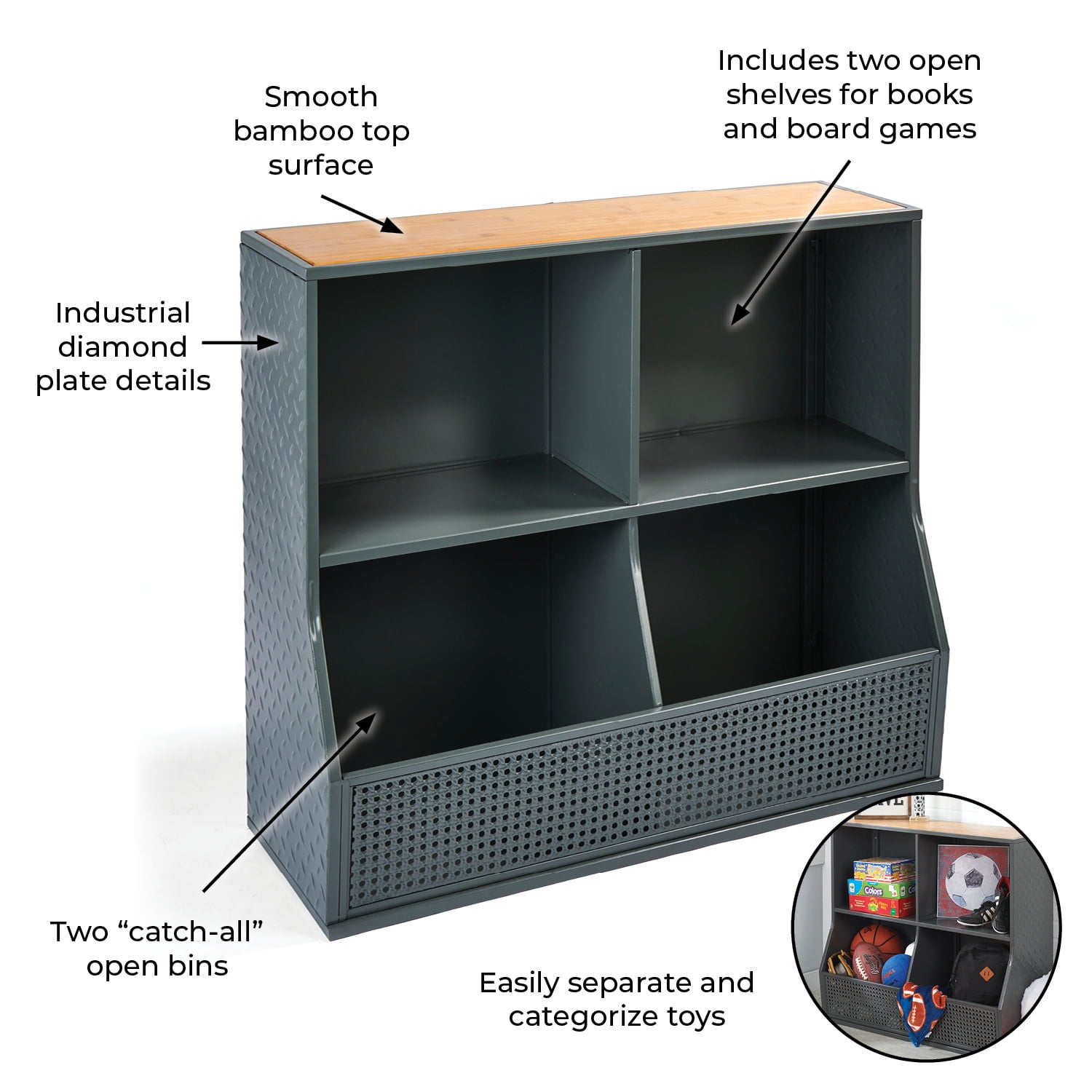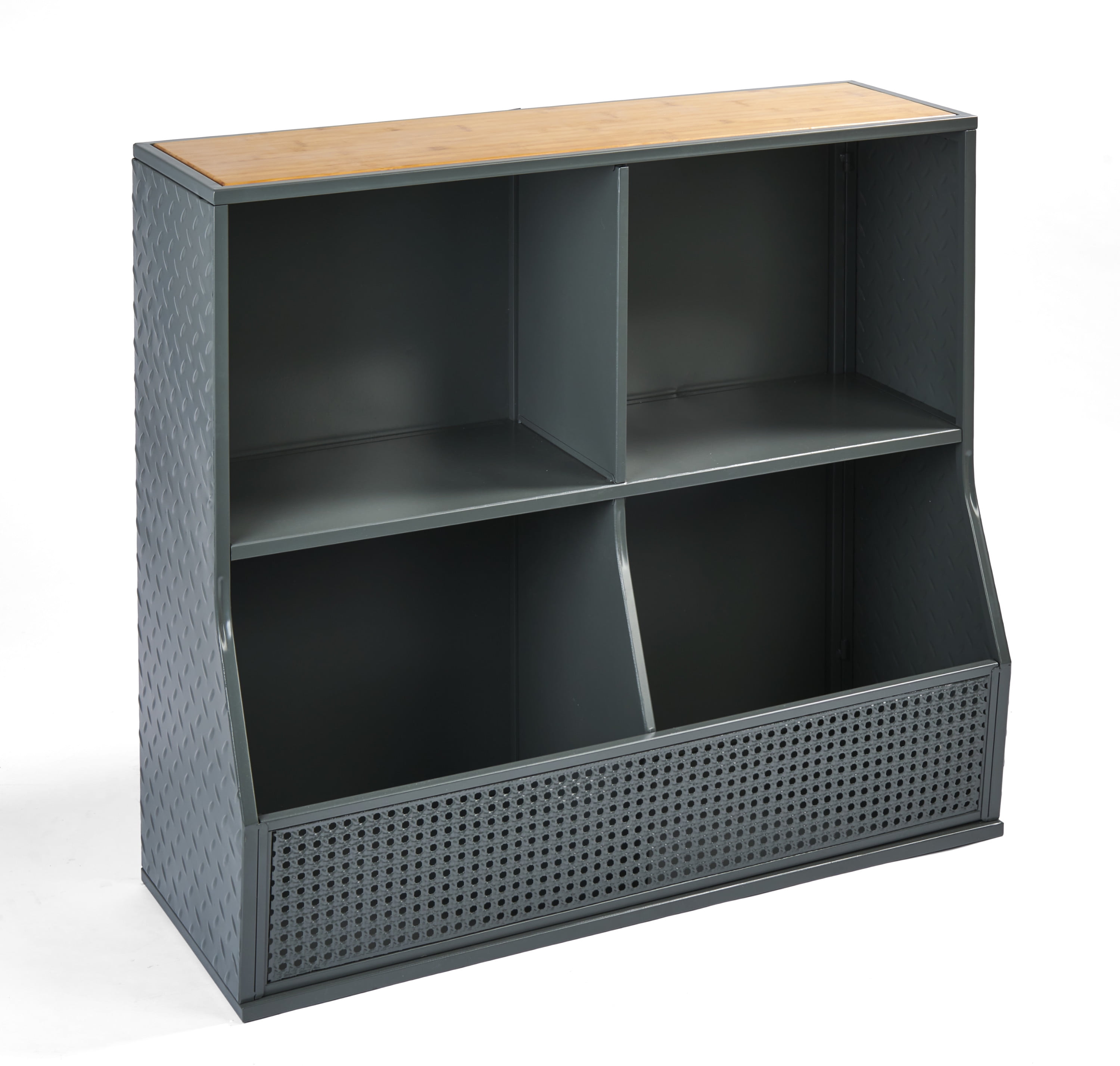 Four cubby metal toy storage unit Features two open shelves and two cubby bins Perfect for toy storage in playrooms, living rooms, and more Use the top surface for small treasure such as trophies and figurines Features a smooth bamboo top Industrial look with diamond plate details Overall measurements 36.25″L x 14.25″W x 33″H Top shelves measure 18″L x 11″W x 14″H