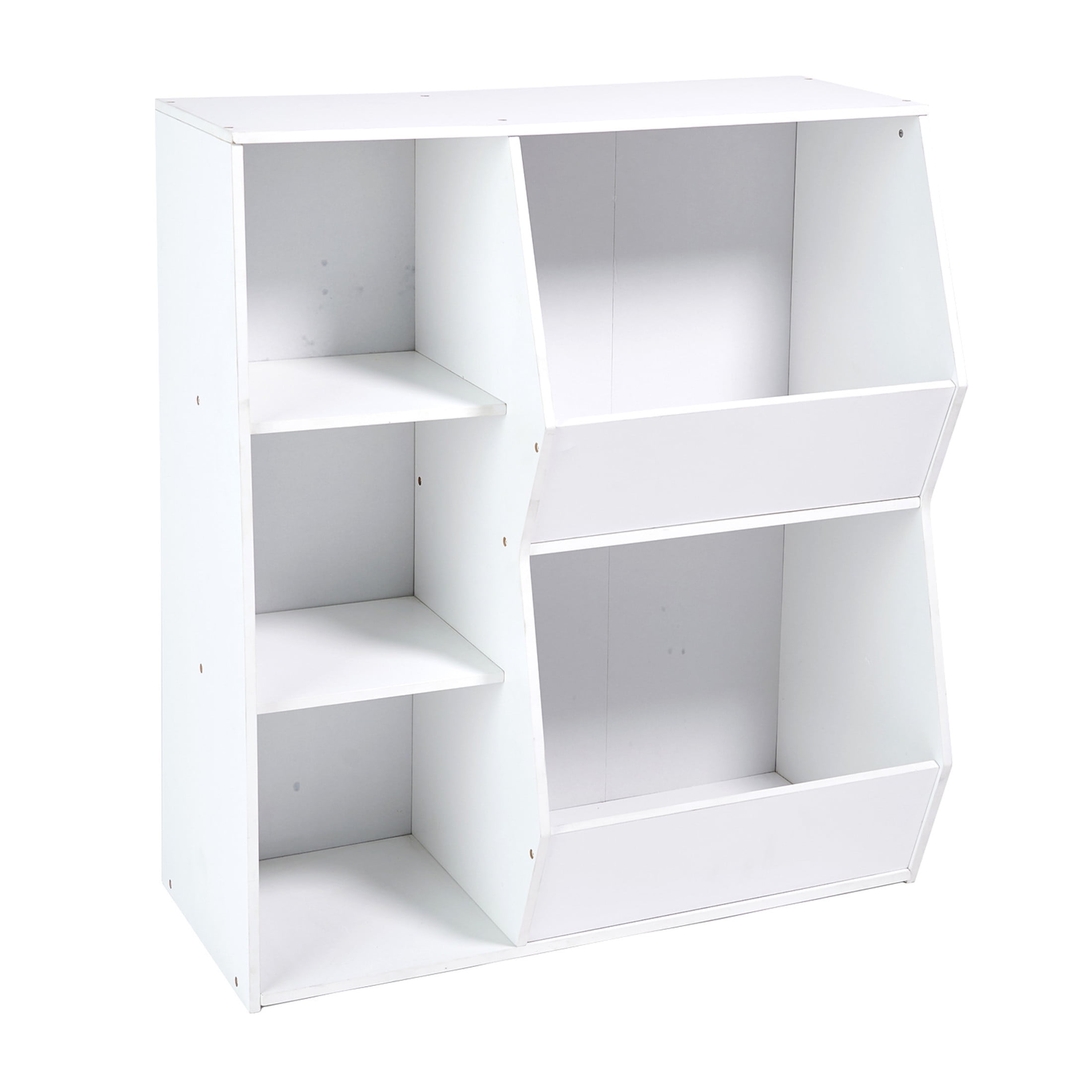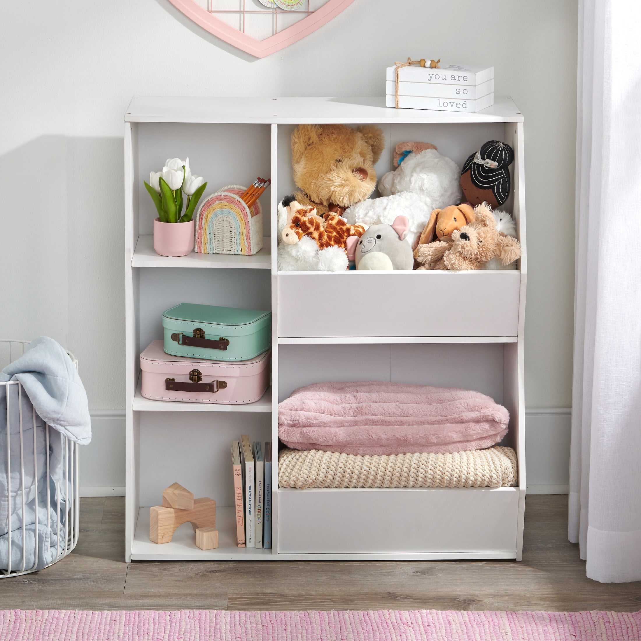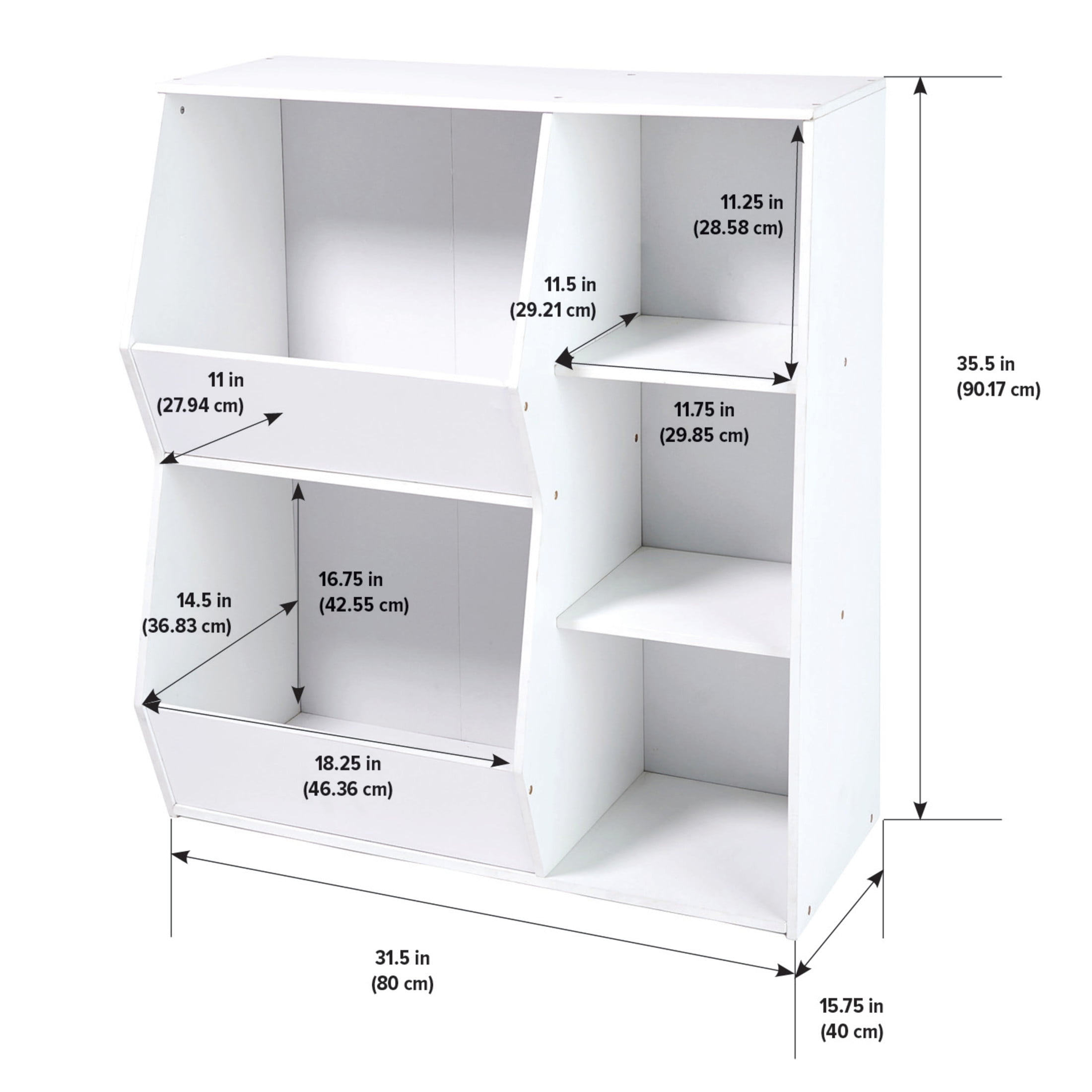 Kid’s toy storage and bookshelf in one unit Helps you to organize and keep clutter off the floor Easy to access bins encourage tidiness Compact design is great for tight spaces Includes a total of 5 storage bins Made of engineered wood with easy to clean melamine surface Overall measurement is 31.5″L x 15.75″W x 35.5″H Assembled weight is 38.75 lbs Wipe clean with a lightly dampened cloth and mild detergent as needed and dry thoroughly Adult assembly required This item ships in its original carton that may include a product photo