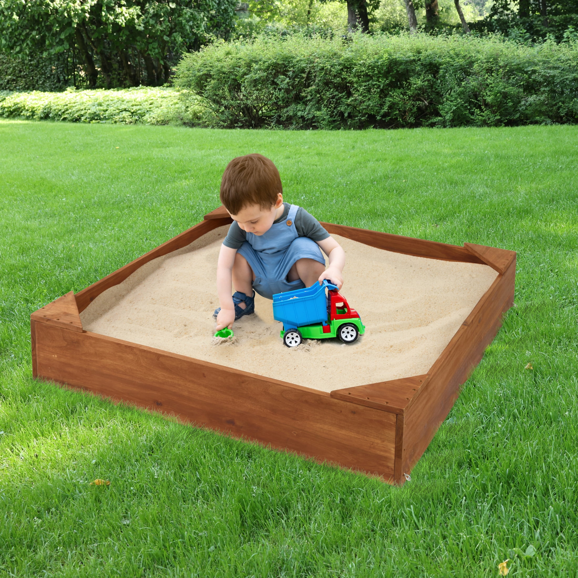 The Badger Basket Simple Sandbox is the perfect addition to smaller yards, measuring 46.5″L x 46.5″W x 8.75”H and providing a cozy play space for kids. This sandbox features four corner seats for little ones to rest and engage in imaginative play while honing their motor skills. Offering hours of screen-free entertainment in the convenience of your backyard, toddlers will delight in playing with their favorite toys and trucks in the sand. Parents will appreciate the included protective cover that safeguards the sandbox from rain, leaves, and critters, plus the reliable liner for proper water drainage. Crafted from durable acacia wood with a charming cedar finish, this sandbox can accommodate up to 750 pounds of sand (sold separately), promising long-lasting enjoyment for your children. Adult assembly required. Sandbox cover made from 100% Polyester. Each corner seat can hold up to 175 pounds. Do not install the sandbox on top of bricks, pavers, or concrete because this can interfere with drainage and damage the product. All finishes are non-toxic. Meets all current, applicable safety standards. Illustrated instructions included. Product includes a limited warranty of 30 Days Parts to the original purchaser. This item ships in its original carton that may include a product photo. Sand and sand toys not included. Actual product may vary slightly from shown and described.