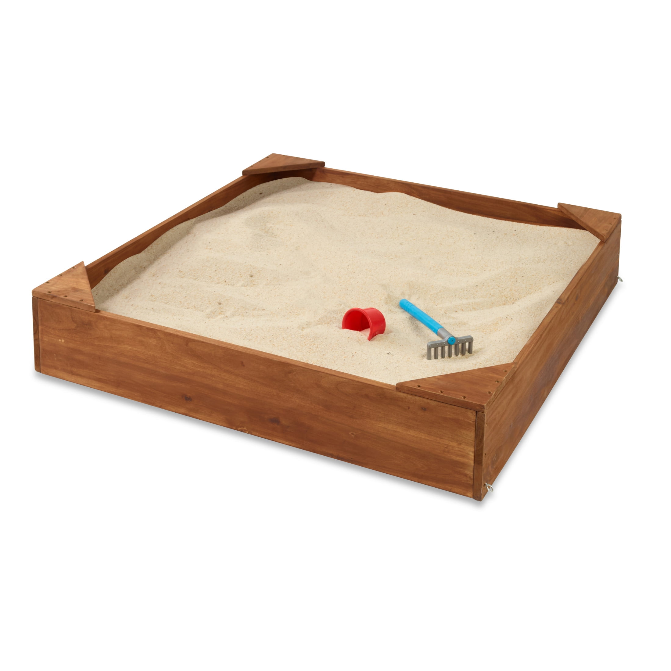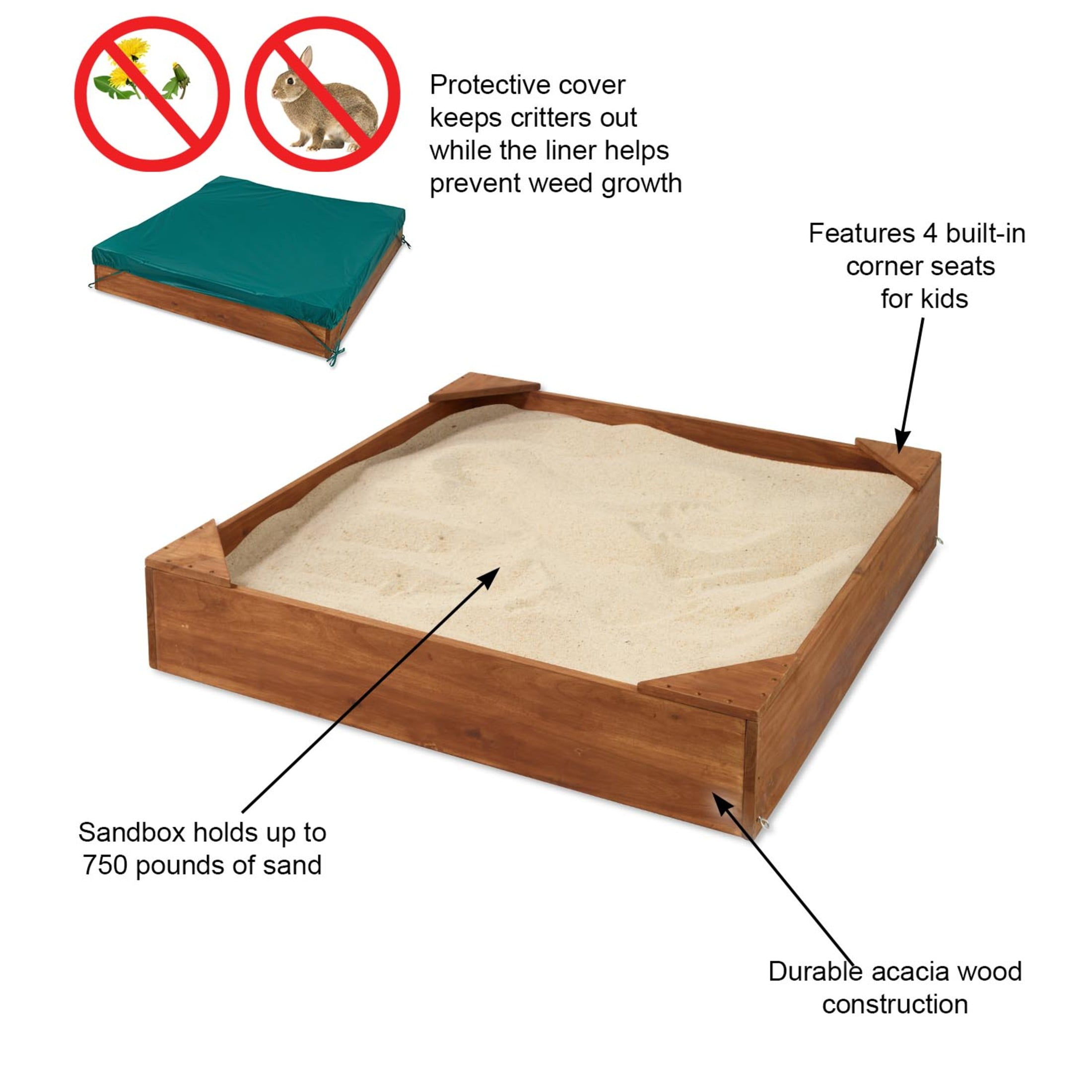 The Badger Basket Simple Wooden Sandbox is perfect for smaller sized yards, providing a fun play space for kids Sandbox features four corner seats for resting during outdoor imaginative play Ensure hours of screen-free entertainment for toddlers and kids alike Enjoy enhanced durability with the resilient acacia wood construction featuring a cedar finish The included protective cover shields the sandbox from external elements and the liner ensure proper water drainage Accommodates up to 750 pounds of sand capacity (sold separately) with each corner seat supporting up to 175 pounds Sandbox measures 46.5″L x 46.5″W x 8.75”H Includes a 30-day limited warranty