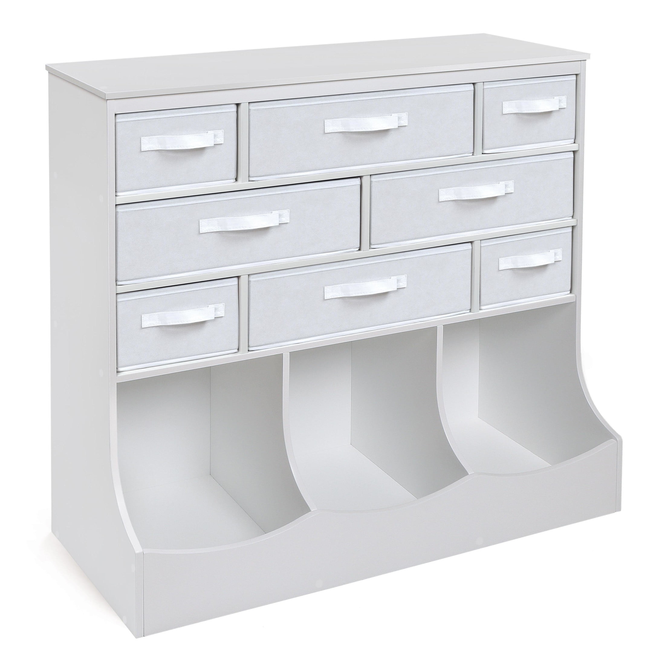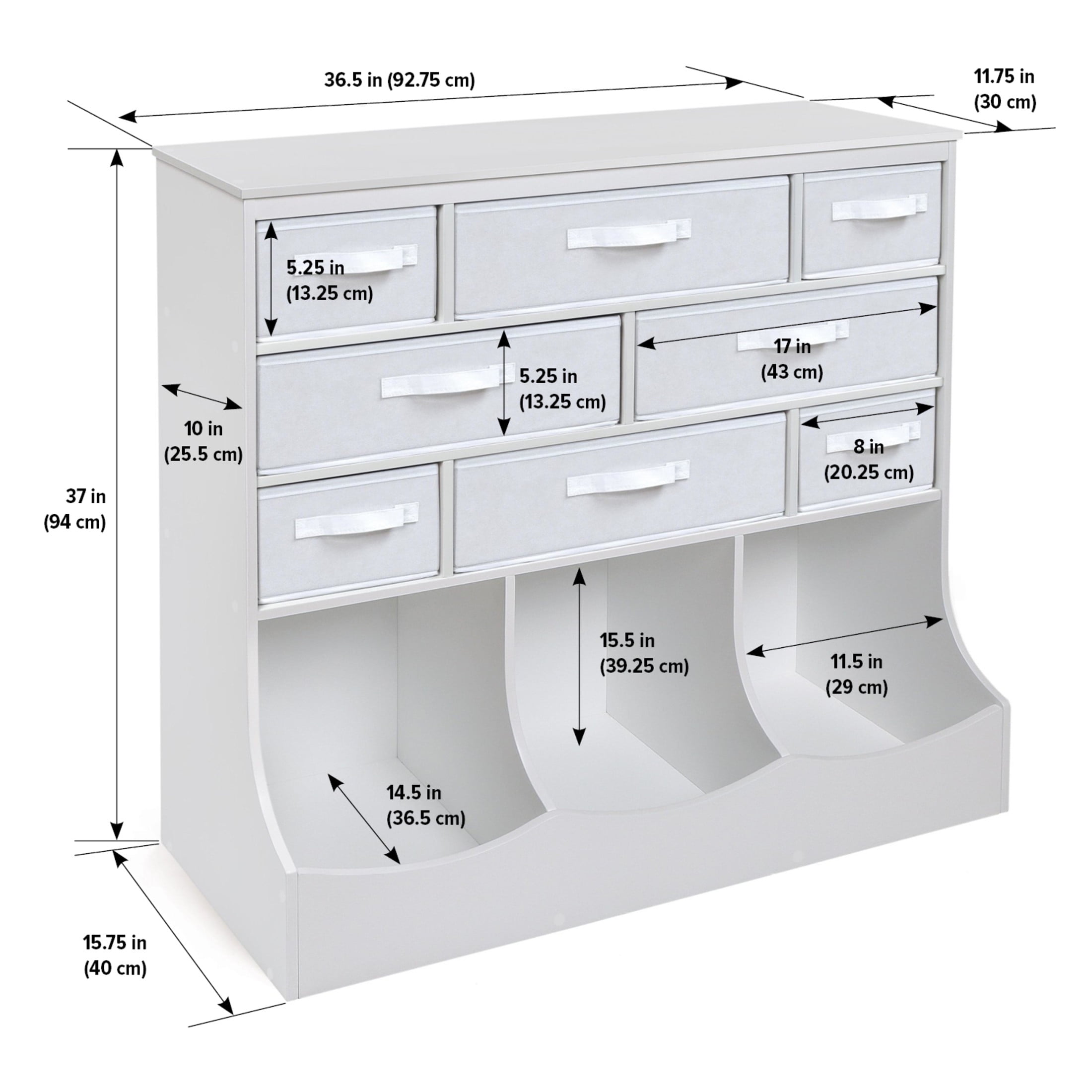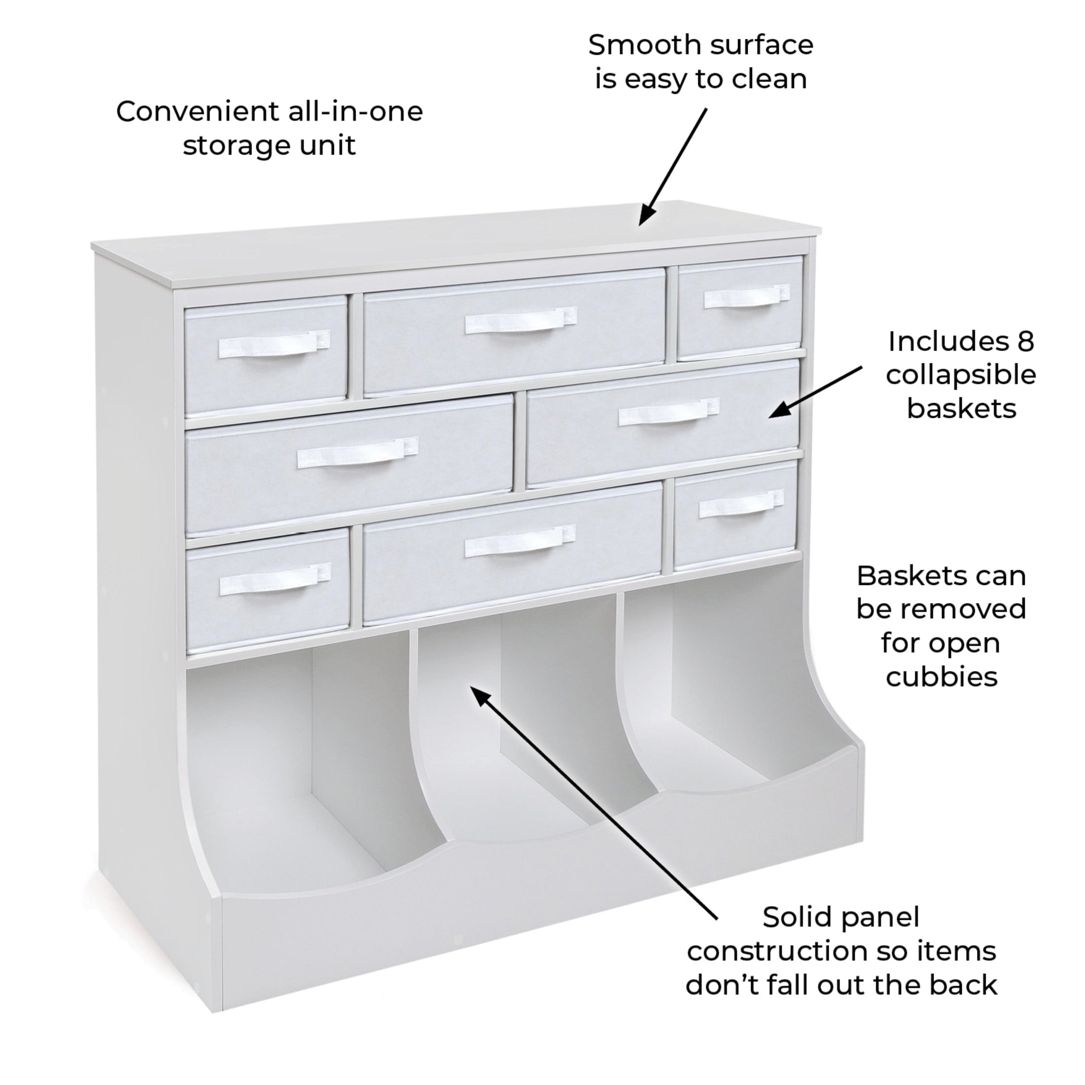 Basket and Bin storage all-in-one unit for organizing kid’s toys Includes 8 fabric storage bins Convenient for a variety of items including toys, crafts, or school gear Baskets are reversible and also fully removable for open cubbies if desired Includes a total of 11 storage compartments Top surface offers an additional place to display keepsakes or stack books Overall unit measures 36.5 inches L x 15.75 inches W x 37 inches H Wipe clean as needed and dry thoroughly (baskets can be spot cleaned)