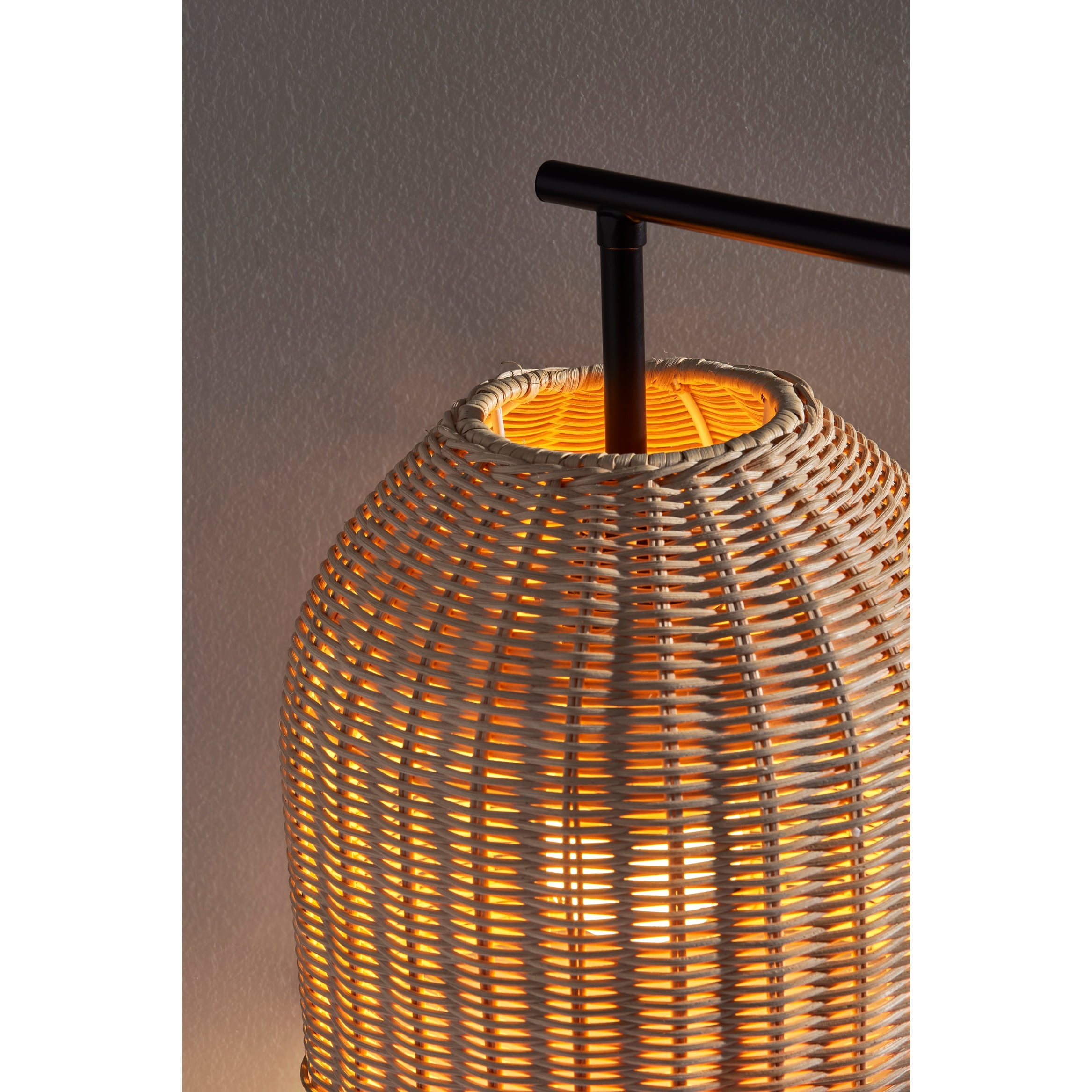 The silhouette and materials provide a blend of coastal and modern styles. Dark bronze finish stylishly offsets the light rattan shade. Natural rattan shade provides warm lighting. Complete your décor with the coordinating Bahama floor lamp, floor arc lamp, 3-arm floor arc lamp, and pendant light. 23 height is ideal for desks, nightstands, or tables.