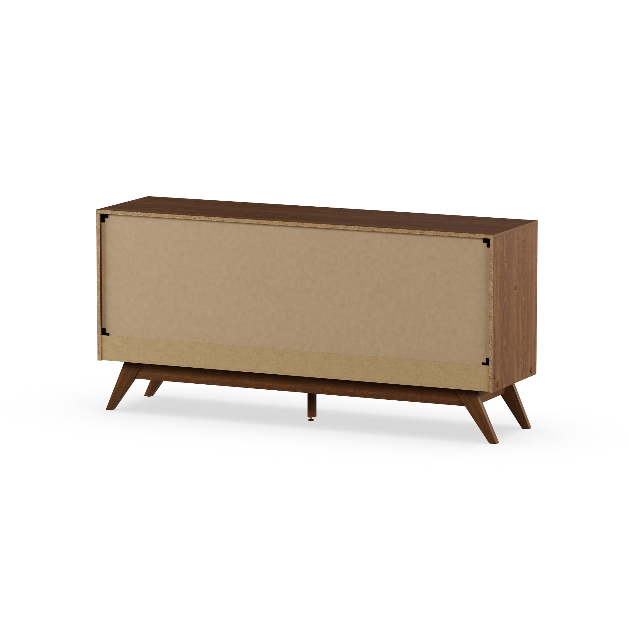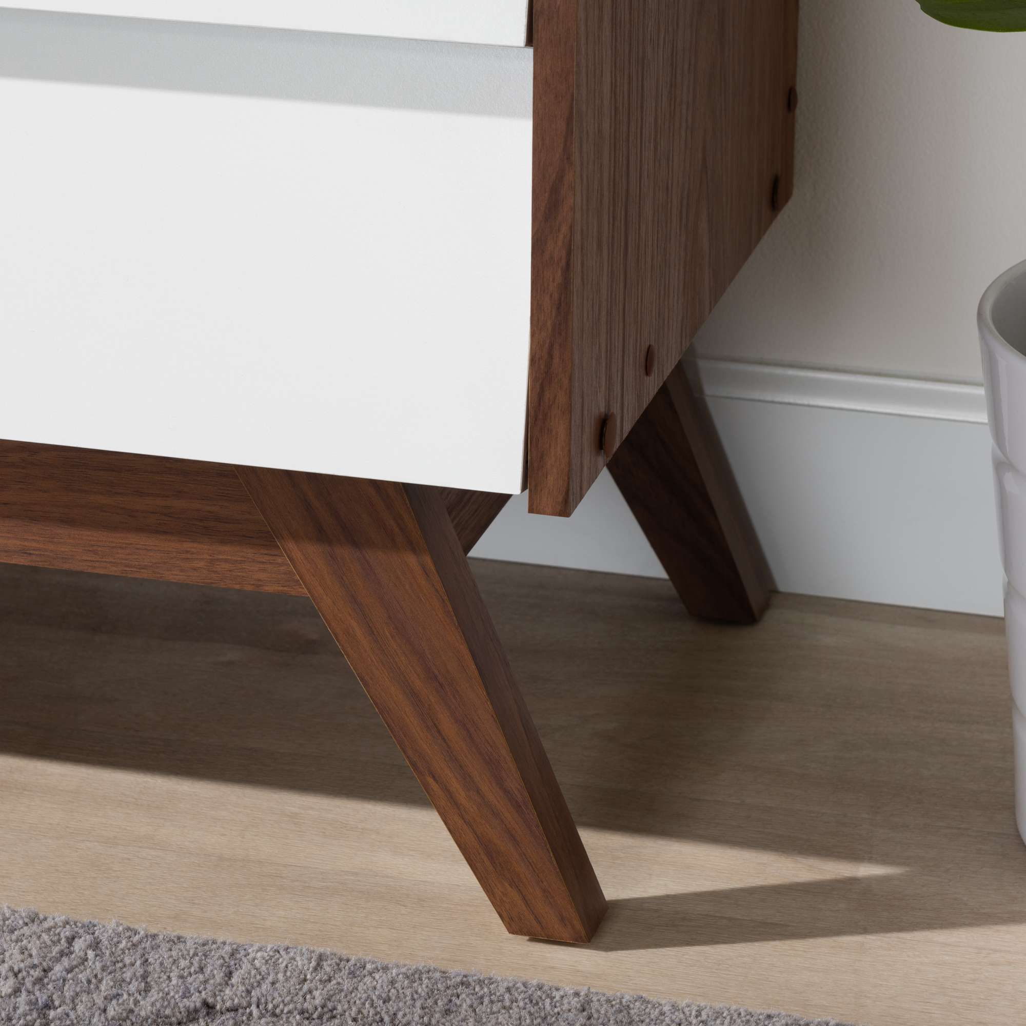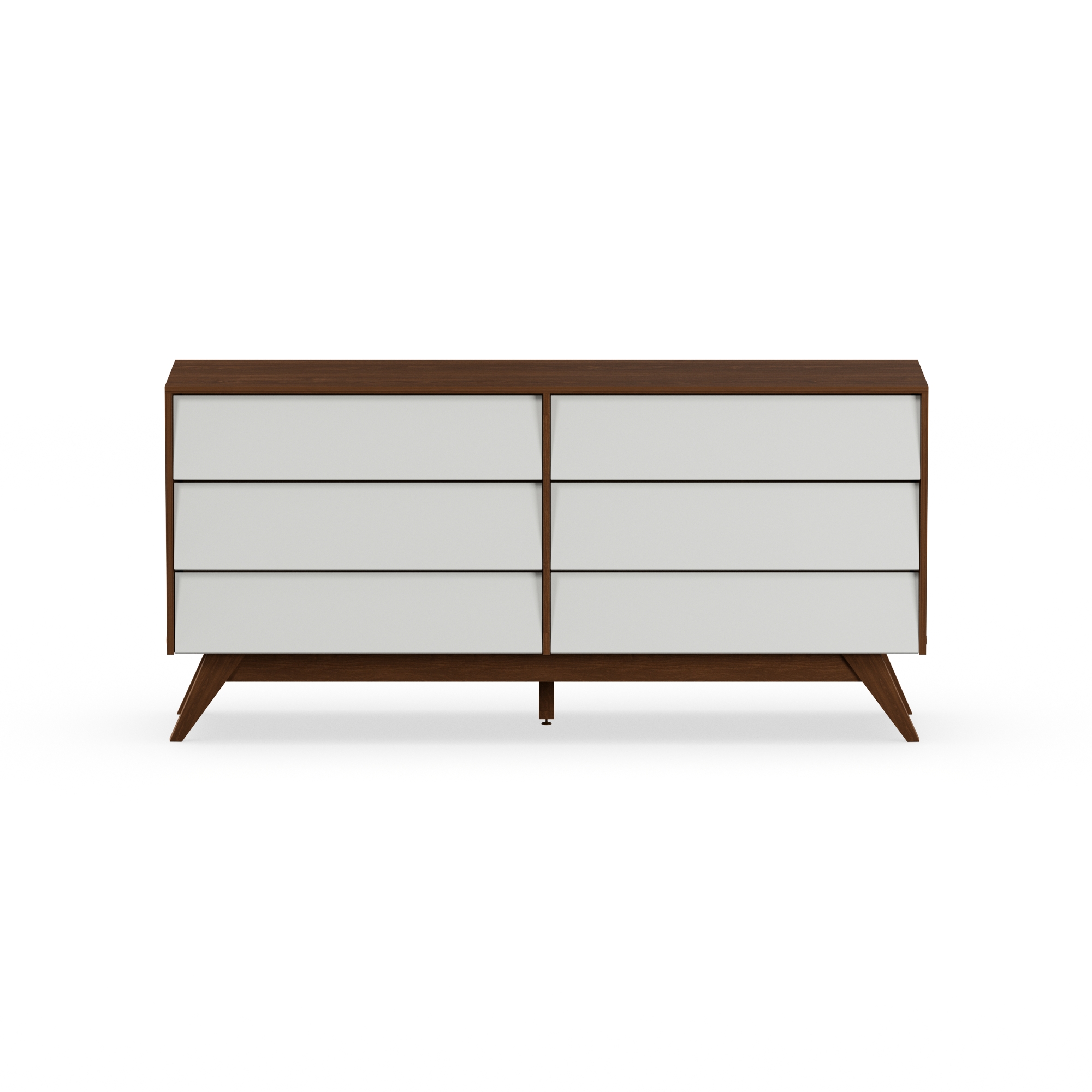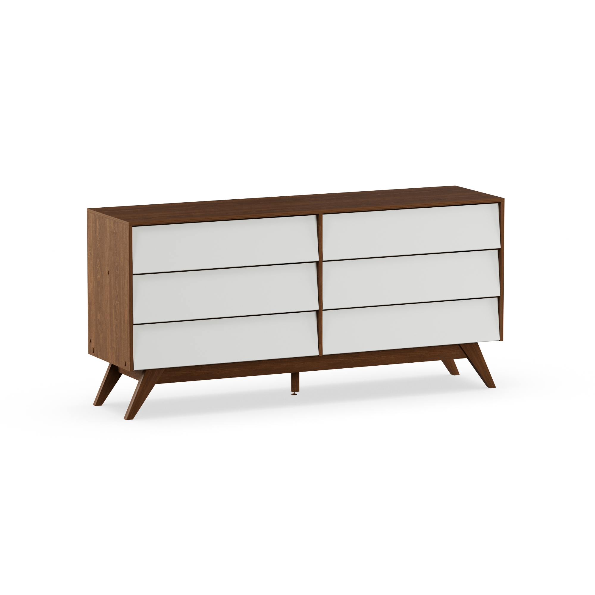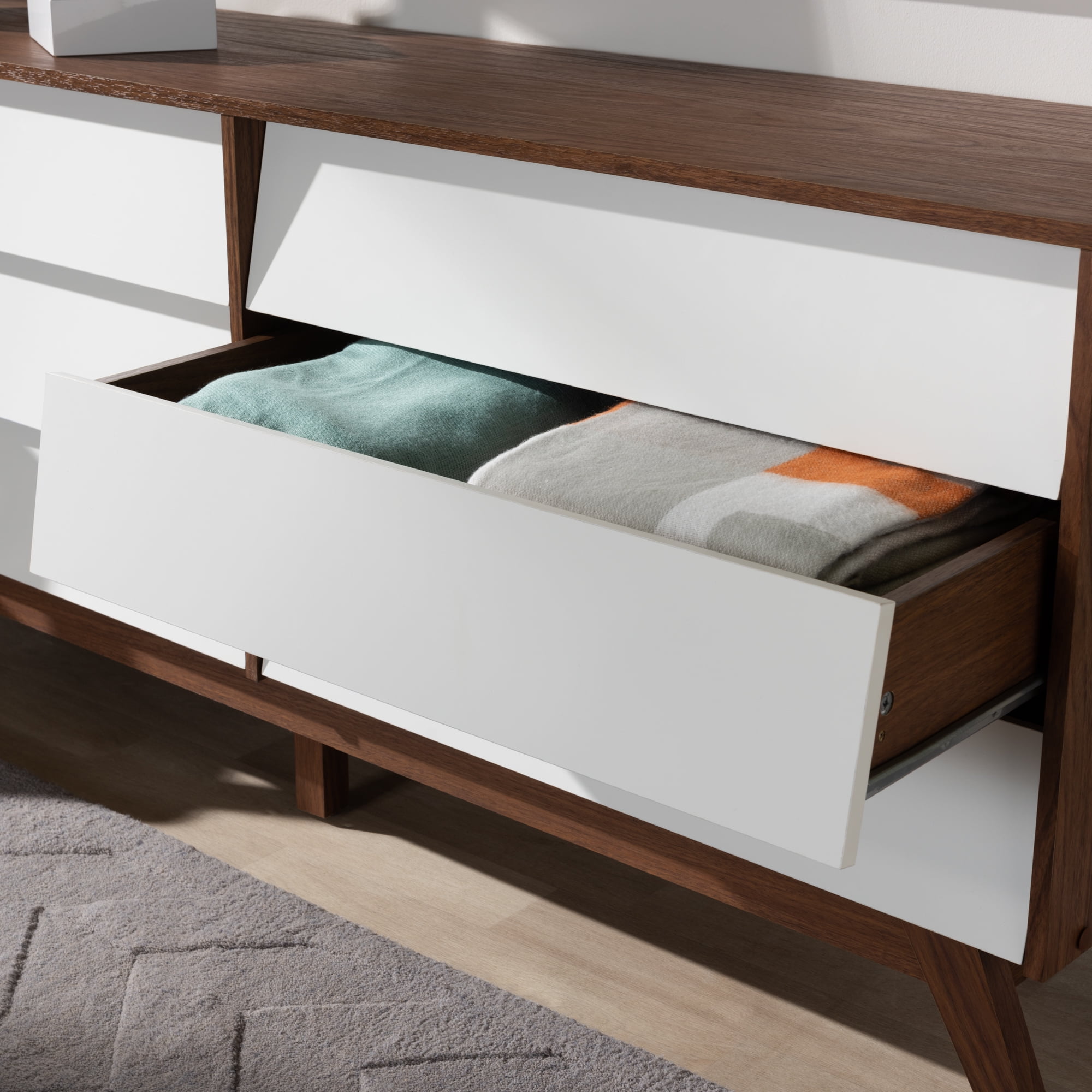 Bairbremy Studios Halfrida 6-Drawer Mid-Century Modern Style Dresser, White/Walnut Smooth drawer runner for easy access Two-tone finishing in walnut and white for a modern aesthetic Slanted design of the drawers adds character and style Splayed legs enhance the retro modern look Constructed of engineered wood for durability Provides ample storage space for lingerie, linens, and clothes Elevates drawers from the floor for a clean appearance Requires assembly for setup