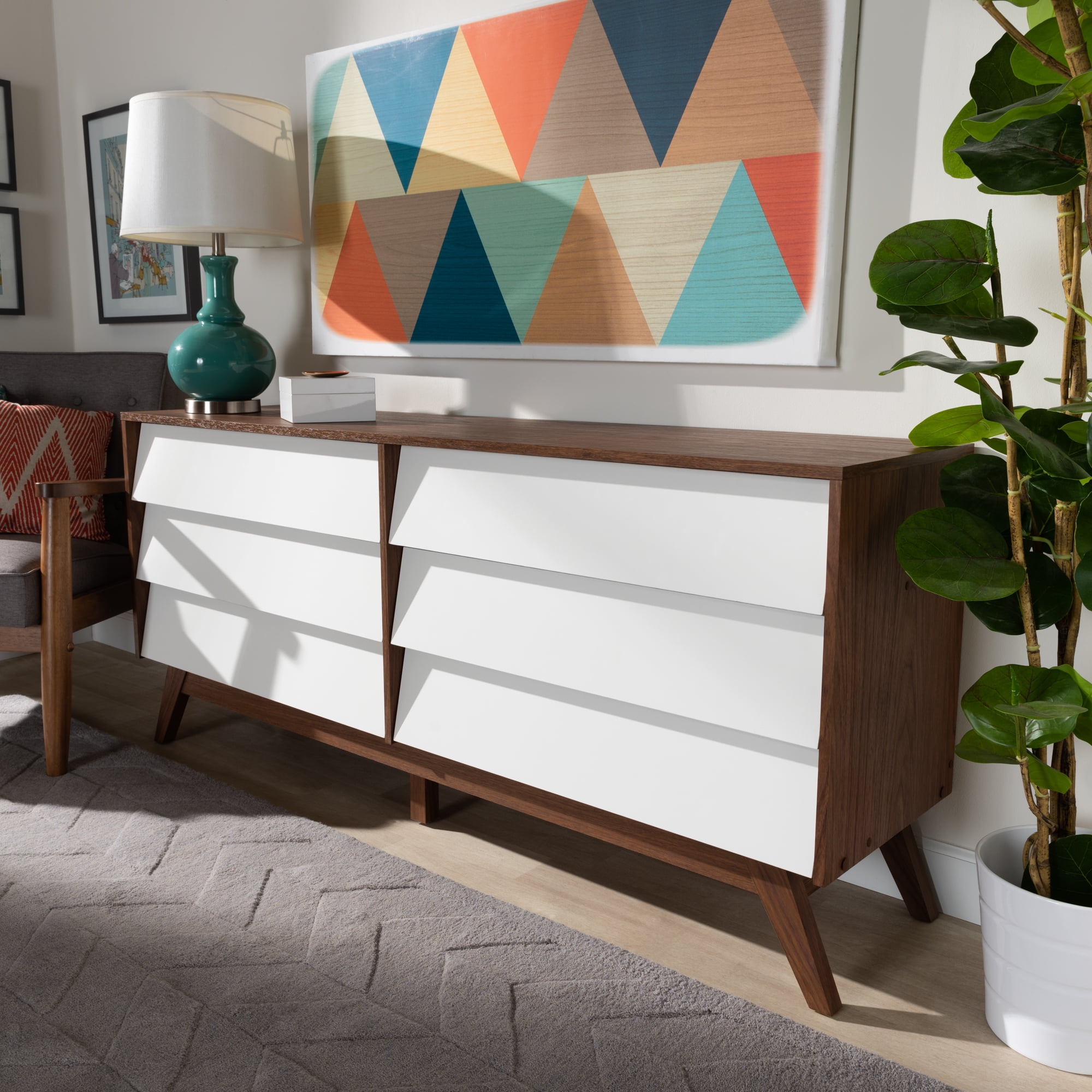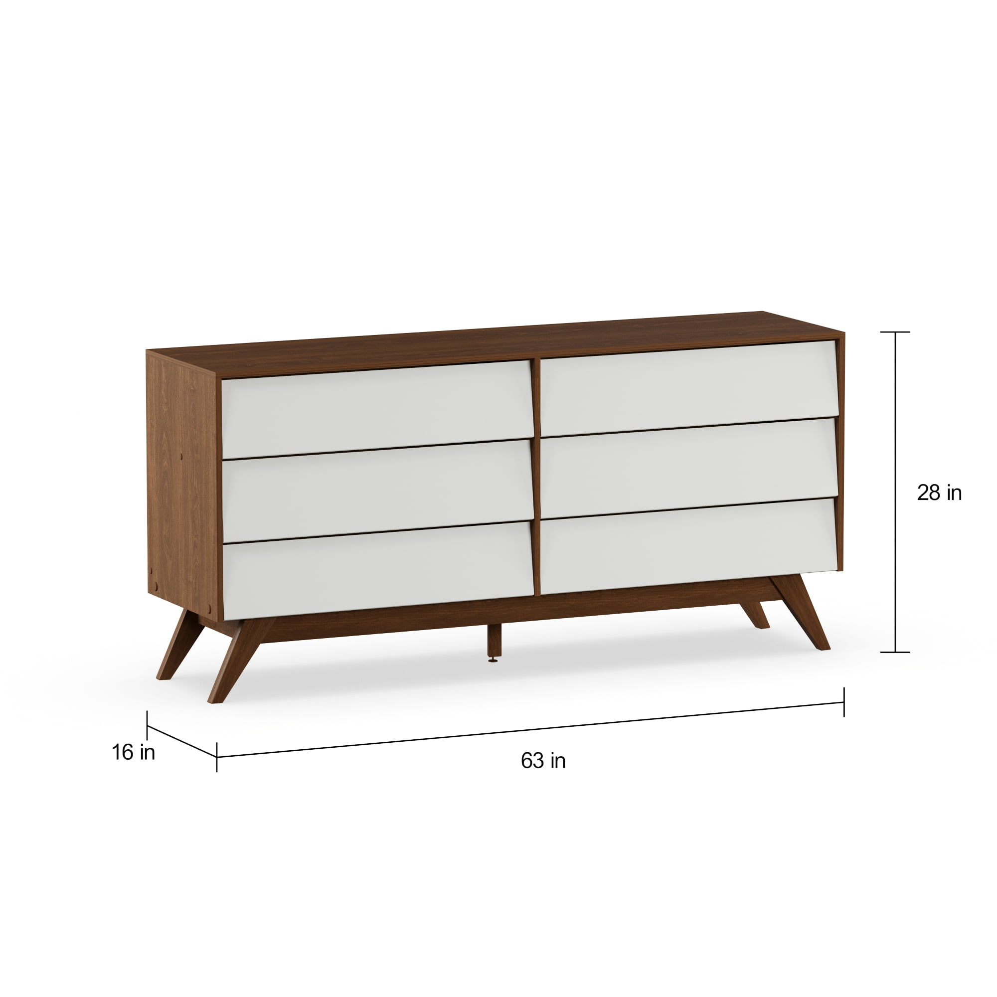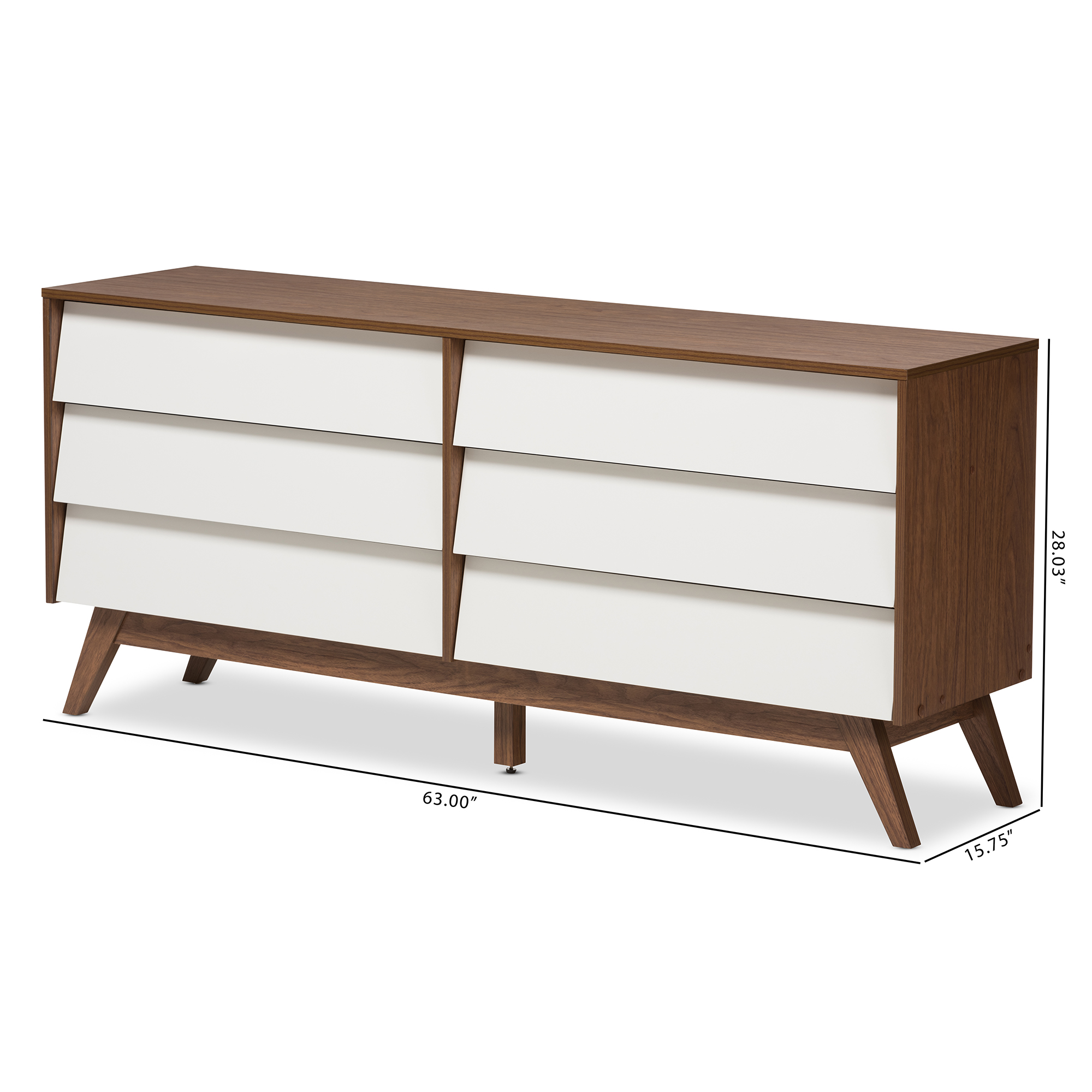 Bairbremy Studios Halfrida 6-Drawer Mid-Century Modern Style Dresser, White/Walnut
