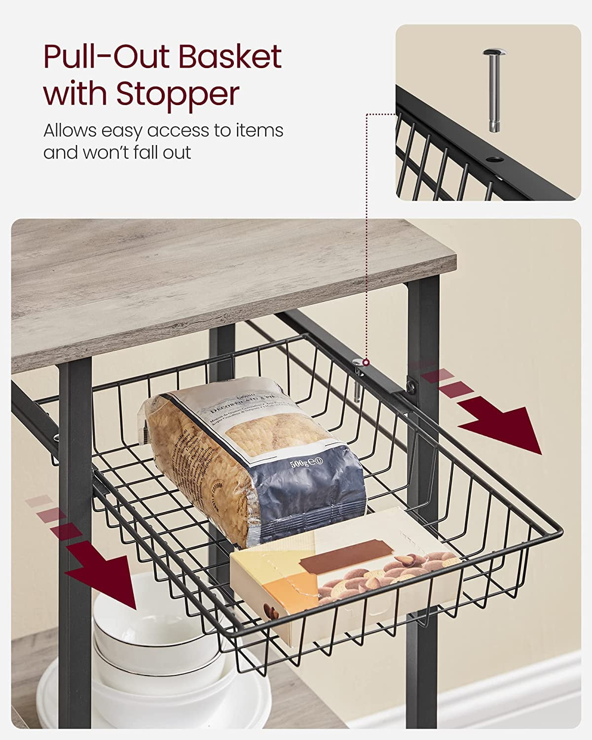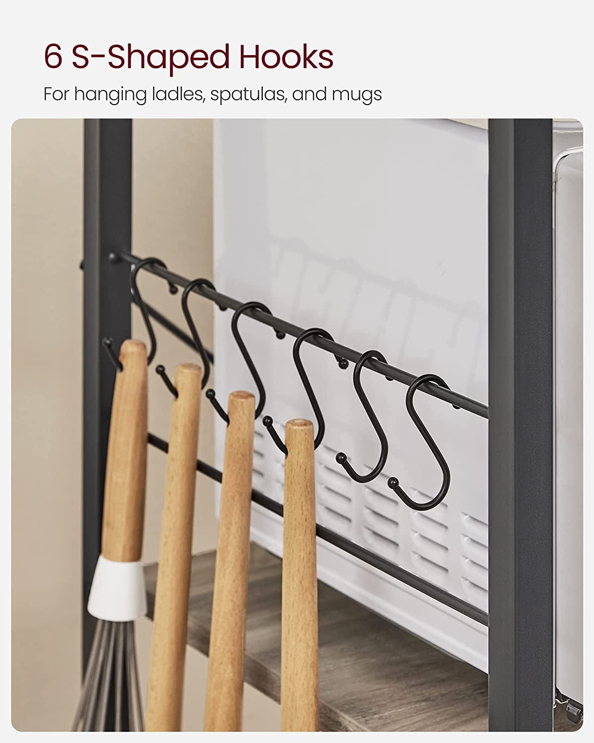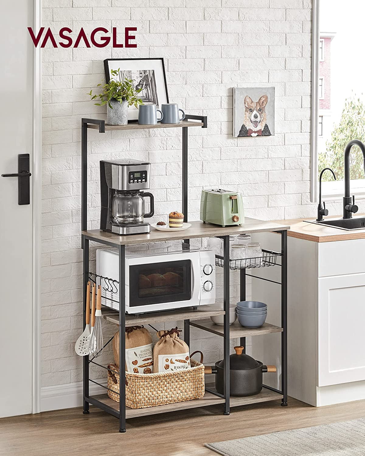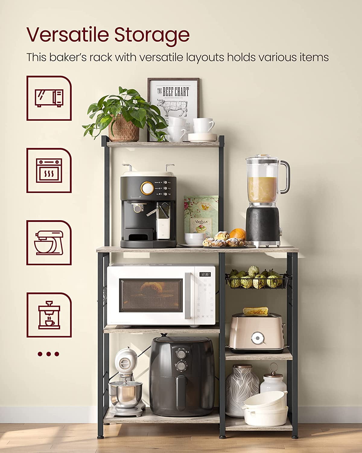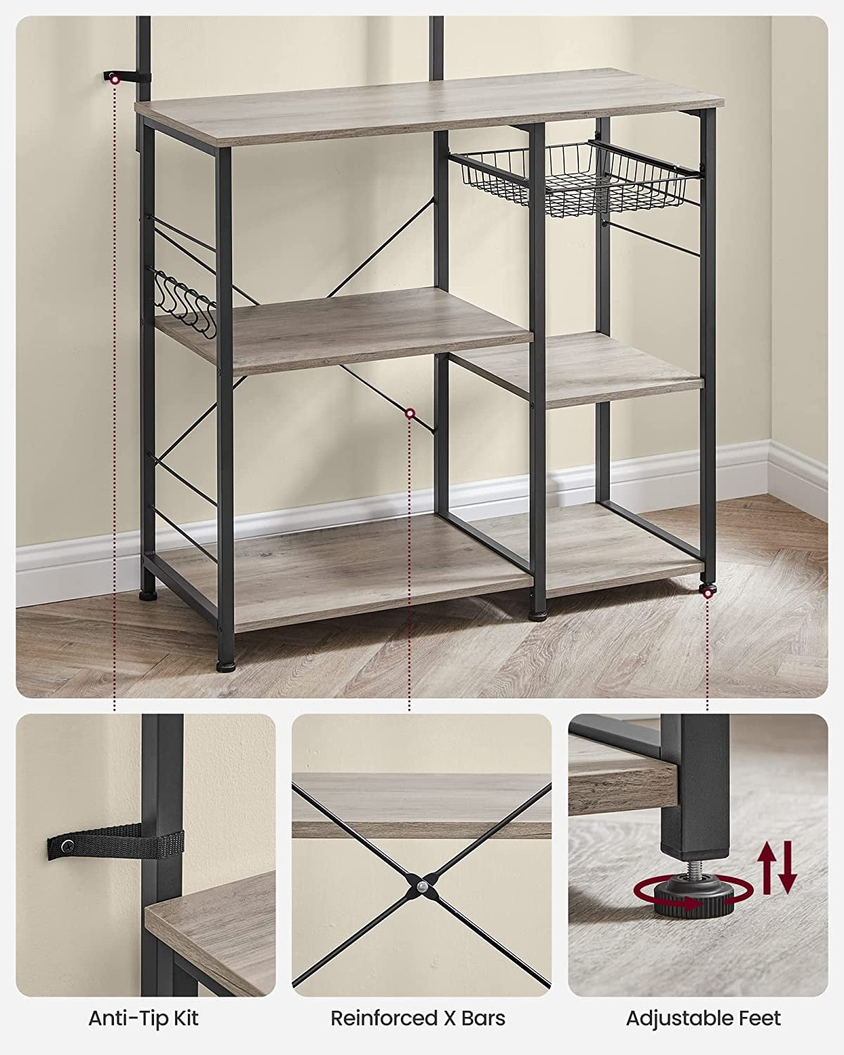 [Stable and Secure] 0.8” x 0.8” steel tubes, quality particleboard panels, and X bars offer a stable structure; adjustable feet enhance the stability; the provided anti-tip kit ensures safer use of this kitchen shelf [Spacious Surface] Coffee machine, toaster, microwave, oven…set these kitchen appliances on the 15.4”D x 35.4”W surface of this kitchen shelf for your convenience while cooking [Categorized Storage] Set spice bottles on the top shelf, hang the ladle, spatula, and eggbeater on the hooks, store the tableware in the baskets, and place the kettle and blender on the shelves [Nice Look] Classic black steel frame, rustic brown shelves, and X bars in the back come together in this kitchen storage rack to spice up your kitchen [Simplified Assembly] Numbered parts and clear instructions will help simplify the assembly of this baker’s rack, so you can store kitchen utensils with it in a little time Color: Greige, Black Material: Particleboard, Steel Product Size: 15.7”D x 35.4”W x 52.8”H (40 x 90 x 134 cm) Product Weight: 34.6 lb (15.7 kg) Max. Static Load Capacity: Top Shelf: 33 lb (15 kg) Tabletop: 55 lb (25 kg) Each of the Middle and Bottom Shelf: 33 lb (15 kg) Wire Basket: 11 lb (5 kg) 1 x Baker’s Rack 6 x S-Shaped Hook 1 x Assembly Kit 1 x Instructions Children are not allowed to climb or play on the product. Please attach the product to the wall with the included anti-tip kit for safety. Avoid placing food directly on the metal wire basket for food hygiene reasons. Do not use the product in humid environments. If you accidentally spill water on it, wipe it off immediately with a dry cloth.