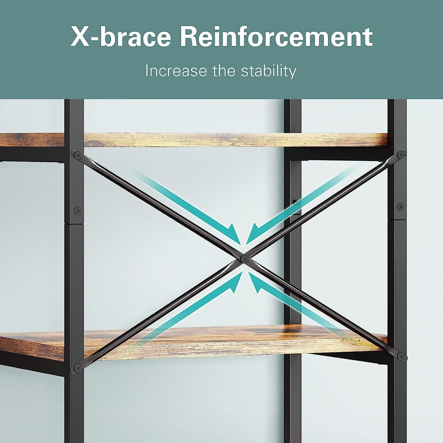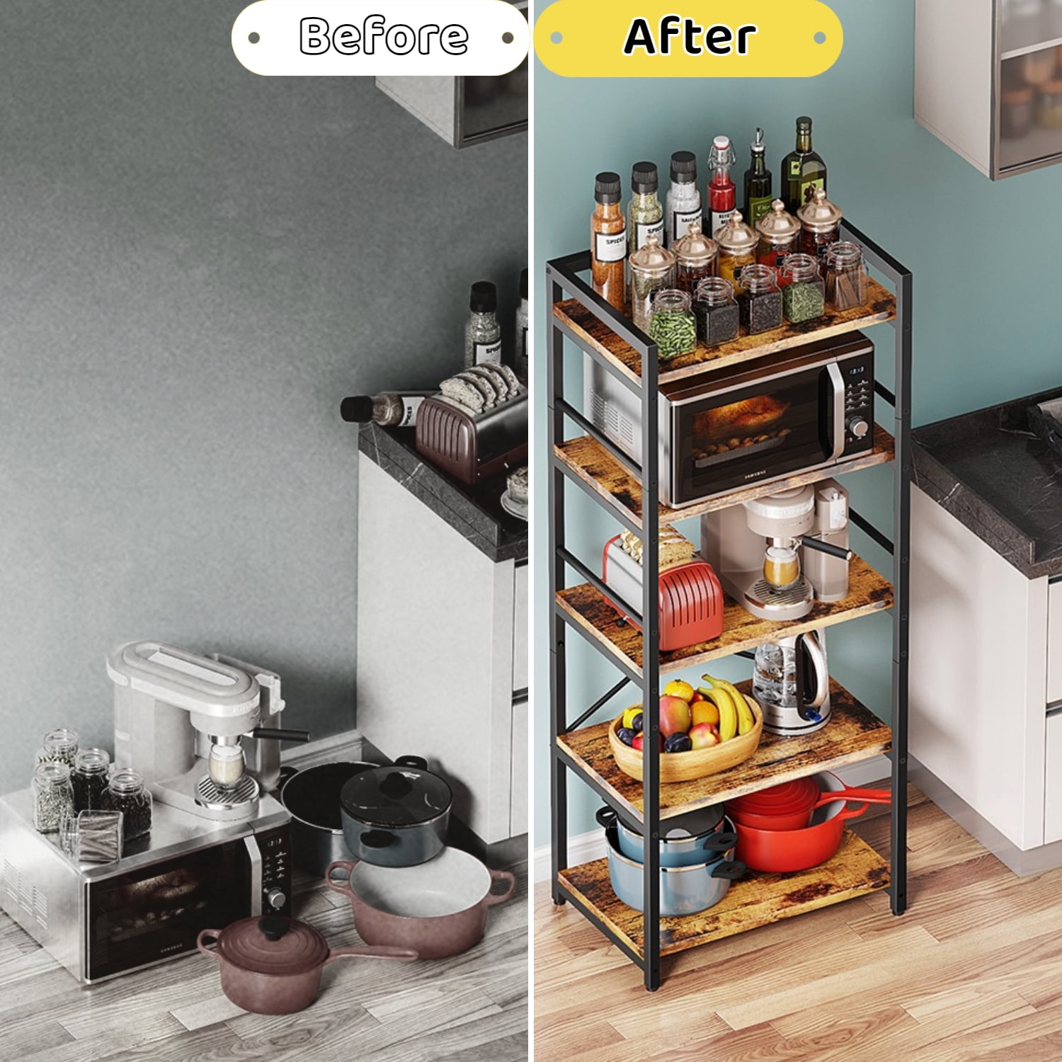 Heavy Duty Microwave Oven Stand 5-Tier Baker’s Rack for Kitchen Large Storage Capacity 10 Hooks for Extra Storage Solid Metal X-frame Sturdy Construction Durable Thicken Wooden Boards Adjustable Feet Rustic & Industrial Style Easy To Assemble Easy Cleaning