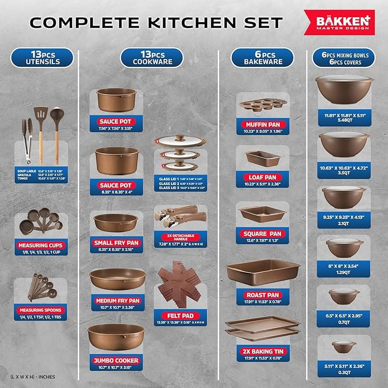 The Bakken Master Granite Cookware Set is the ultimate kitchen companion, combining functionality, style, and health-conscious design. This set includes one 2.6 quart sauce pot with lid, one 1.8 quart sauce pot with lid, a 3.5-quart jumbo cooker with lid, one medium fry pan measuring 10”, one small fry pan measuring 8”, 2 pieces detachable handles, 5 pieces felt pad, a soup ladle, a spatula, a tong, measuring spoons, measuring cups, muffin pan, loaf pan, roast pan, square pan, 2 baking tin, and 6 pieces salad mixing bowls. Featuring an ultra-nonstick warm granite coating, this set ensures healthier cooking with less oil, effortless food release, and long-lasting durability. Crafted with PFOS and PFOA-free, it prioritizes your family’s safety while delivering 10x the nonstick performance of traditional cookware. This versatile 38-piece set includes multi-sized pots and pans with tempered glass lids, a 6-piece bakeware collection, and mixing bowls to cover all your cooking needs. Detachable, cool-touch handles provide secure and ergonomic handling, making it easy to transition from stovetop or oven to countertop. Designed for even heat distribution and retention, the cookware eliminates hot spots, ensuring perfectly cooked meals every time.Cleaning up is a breeze with the stain-resistant, easy-to-clean surfaces, while the tempered glass lids let you monitor your cooking effortlessly. Suitable for all stove types, this set also includes heat-resistant kitchen utensils to simplify your culinary adventures. Stylish, practical, and durable, the Bakken Master Granite Cookware Set is the perfect addition to any kitchen.