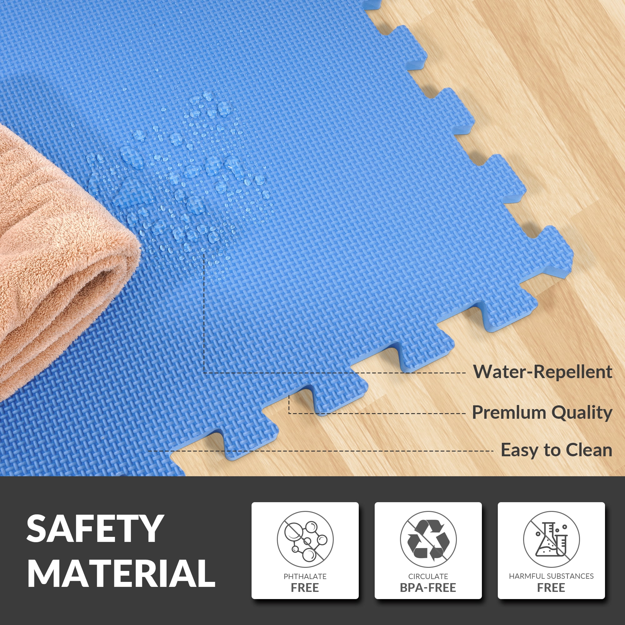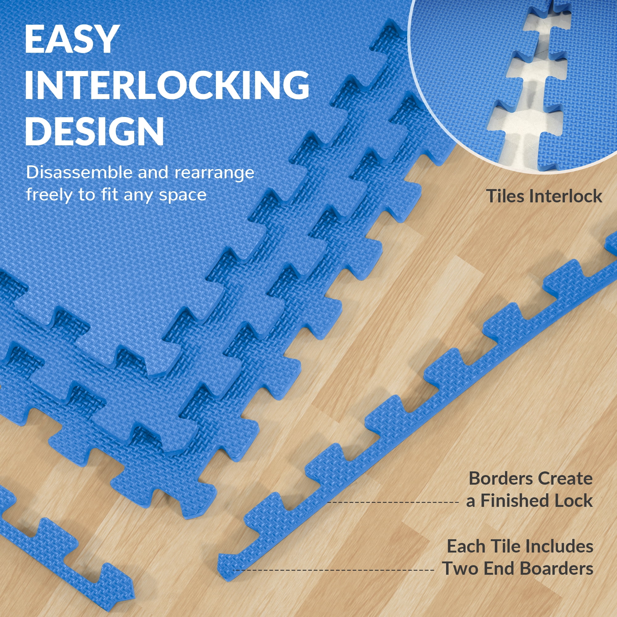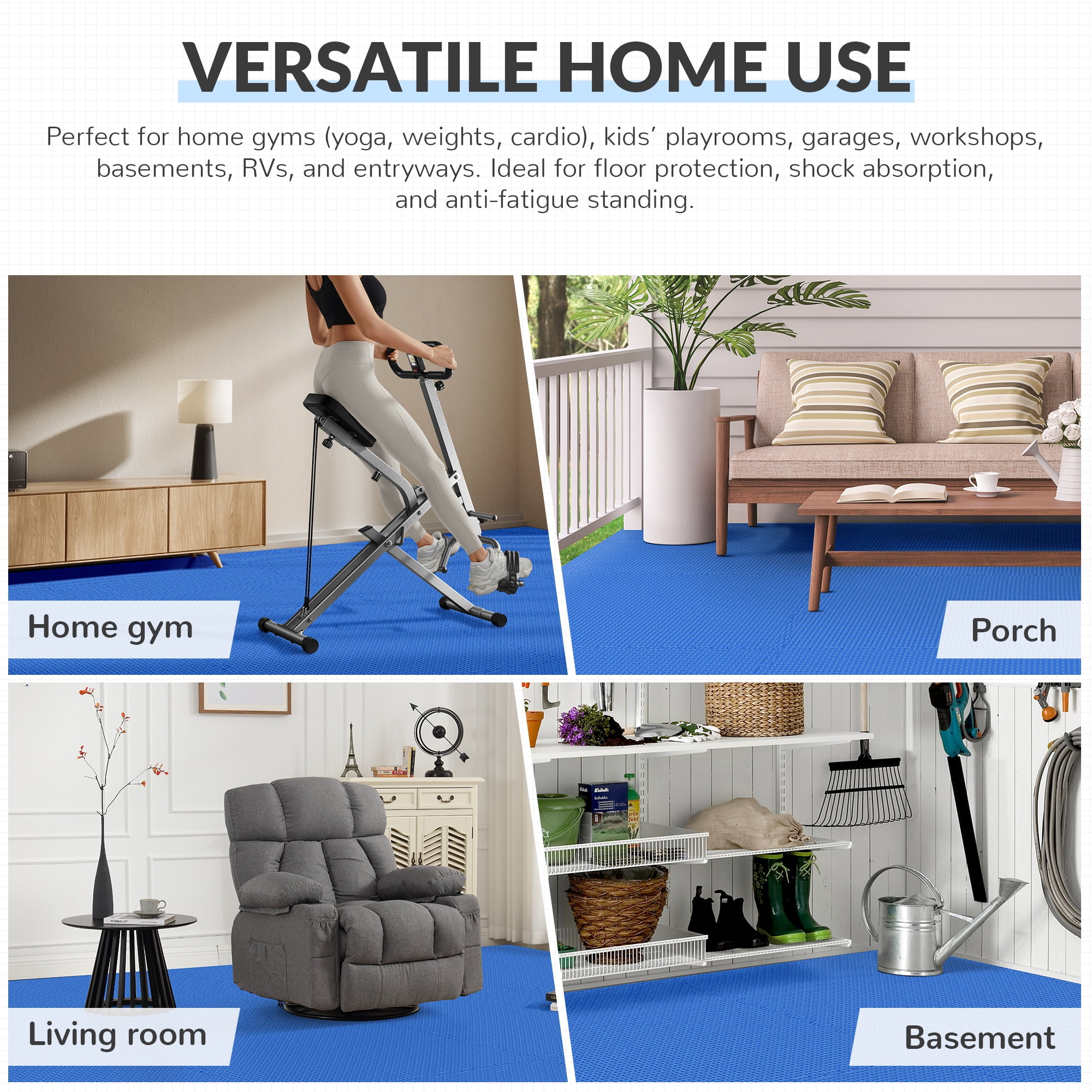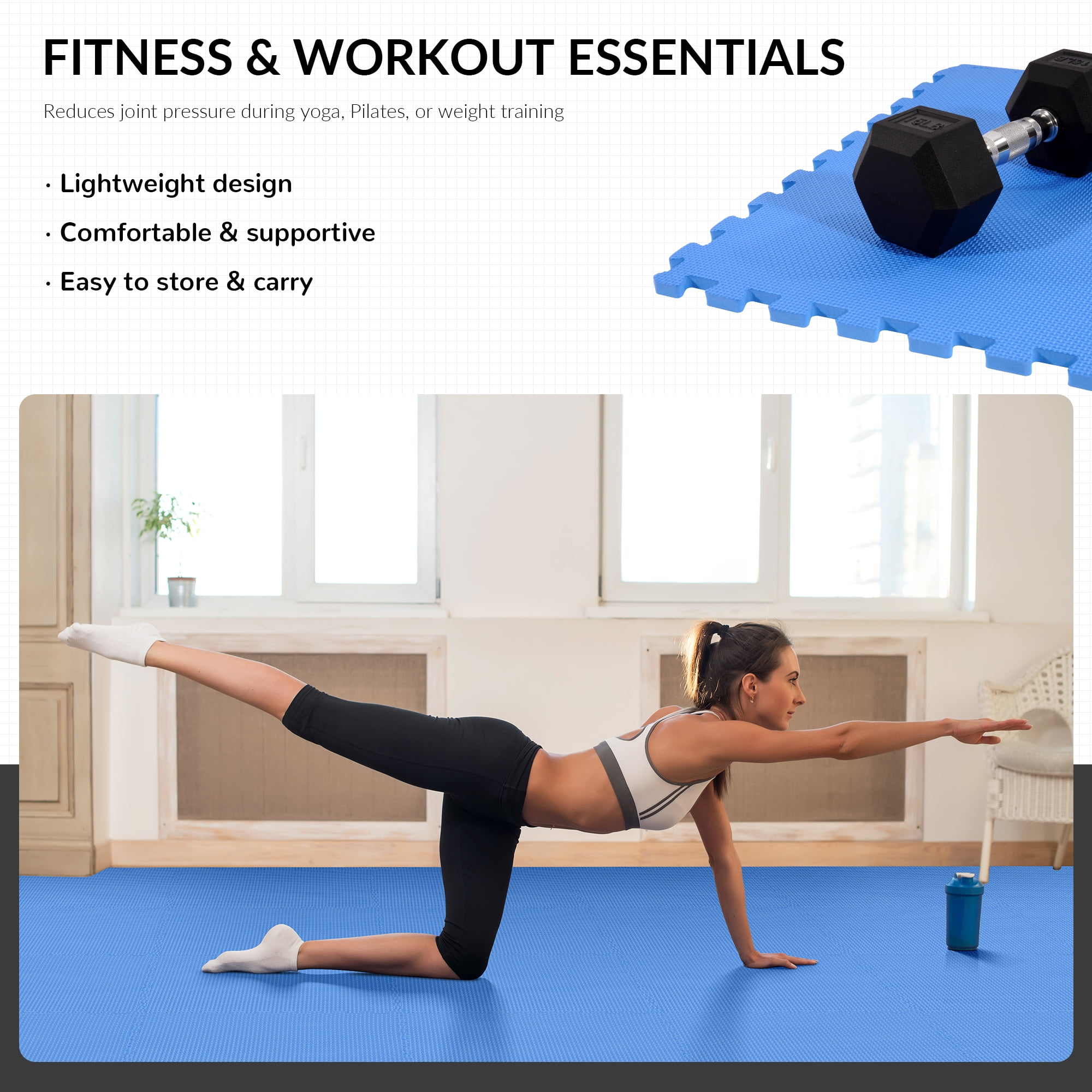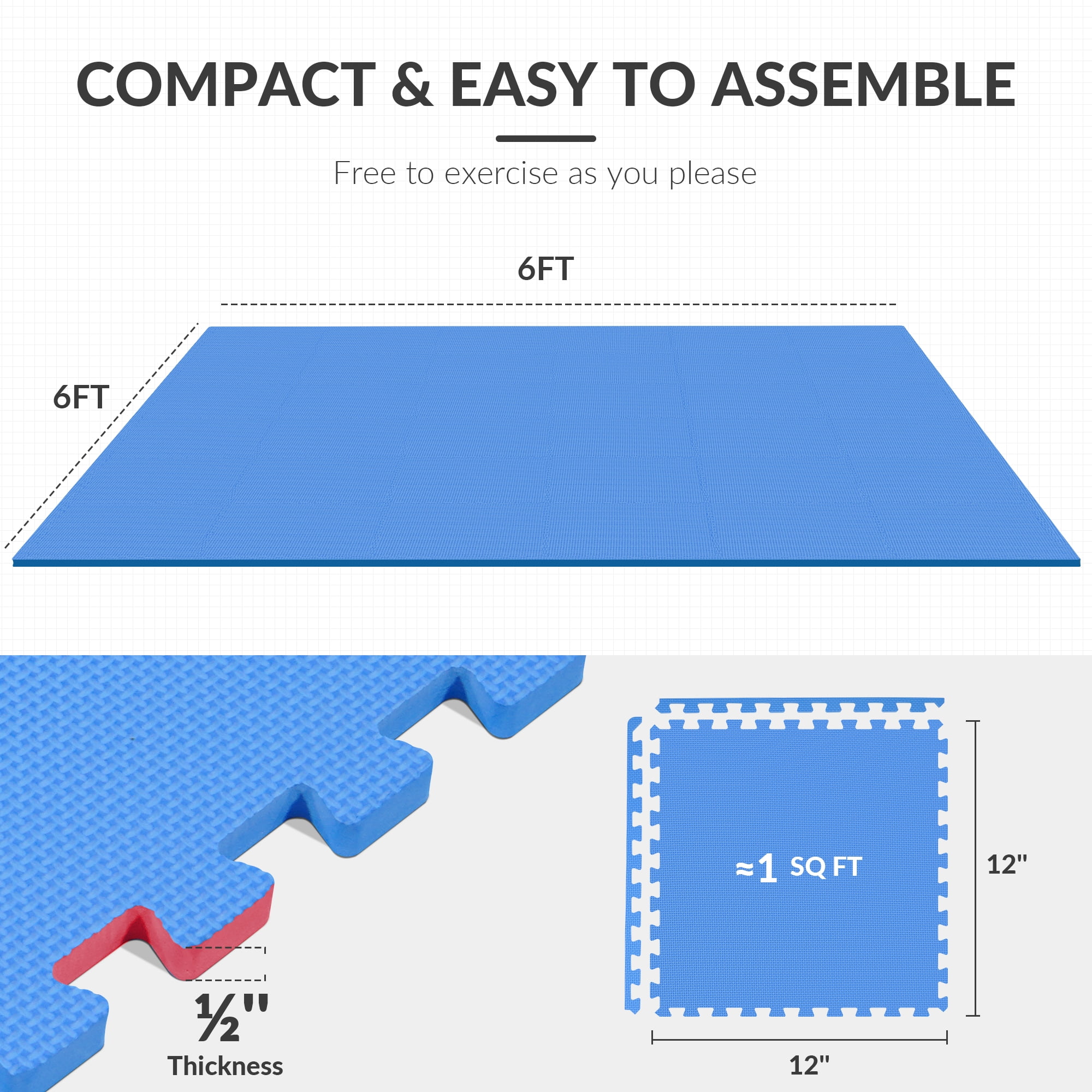 BalanceFrom 144 sqft Interlocking Foam Tile Exercise Protective Flooring, 36-Tiles Made from highquality EVA foam for durability and nontoxicity 1/2 inch thick for optimal cushioning and shock absorption Interlocking puzzle piece design for easy assembly and customization Suitable for various exercises including yoga, Pilates, HIIT, and cardio Reduces noise and impact, ideal for home gyms or shared spaces Easy to clean with a damp cloth or mild soap for hygiene Protects floors from scratches, dents, and damage Textured nonslip surface for secure grip and stability Covers a generous area of 144 square feet for ample workout space Lightweight and portable for easy assembly, disassembly, and storage