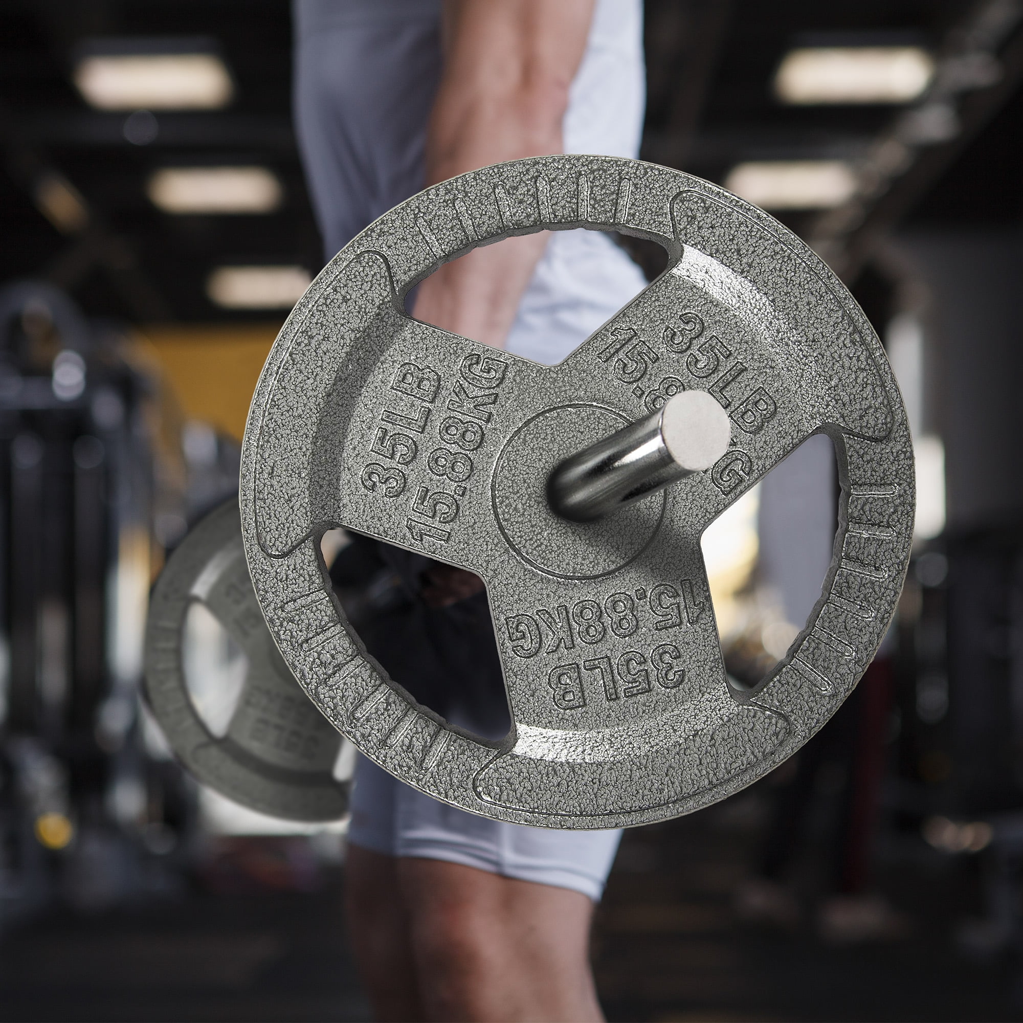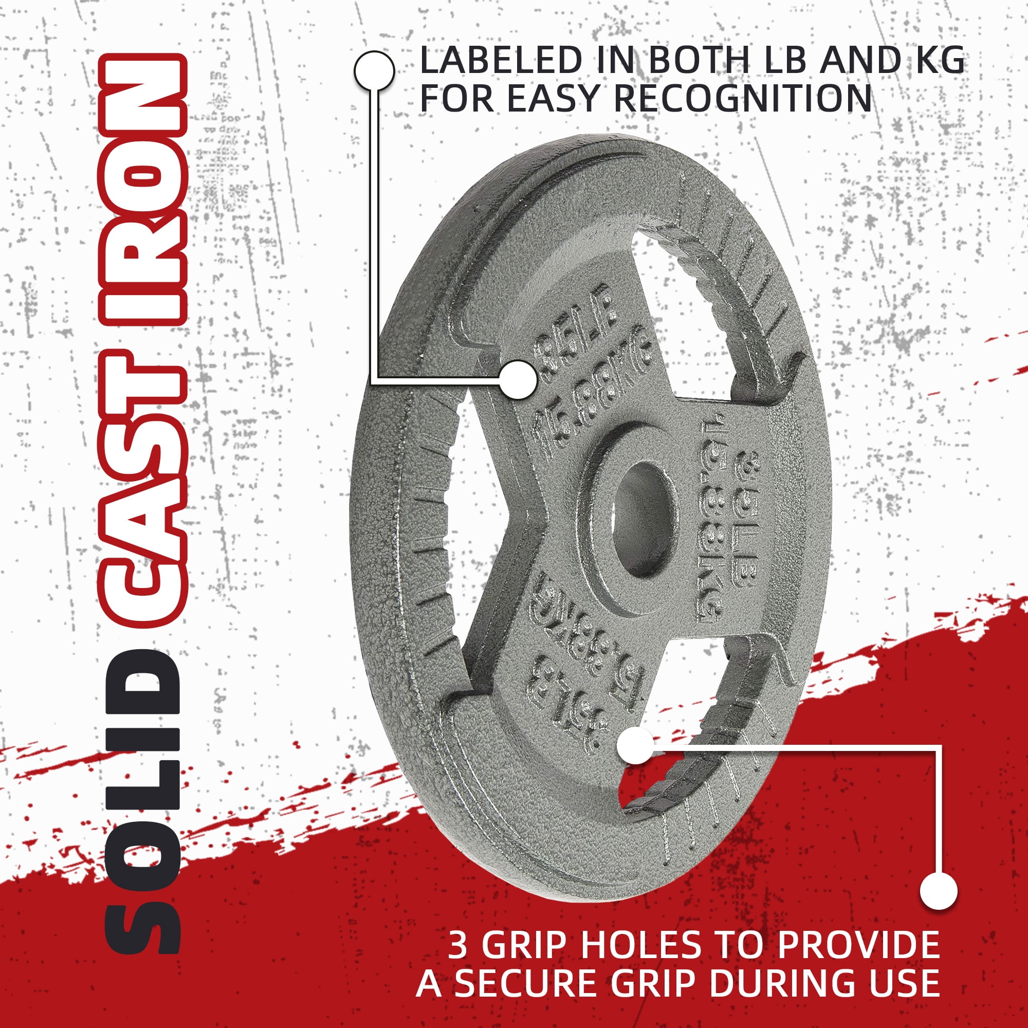 【Available in 1-Inch and 2-Inch Center Holes】Choose from standard 1″ plates for traditional home gym bars or 2″ Olympic plates compatible with Olympic barbells and commercial gym equipment. 【Solid Cast Iron Construction】Made from high-quality cast iron for maximum durability and long-term performance. Won’t bend or crack under heavy lifting. 【Rust-Resistant Enamel Coating】Features a protective baked enamel finish that resists corrosion and wear while remaining low in odor—ideal for indoor training environments. 【Ergonomic Grip Design】Select plates feature 3 large grip holes with textured edges for safe, quick handling and easier loading and unloading. 【Versatile Weight Range & Clear Labeling】Available in 2.5, 5, 10, 25, 35, and 45 lb sizes; each plate is clearly marked in both pounds and kilograms for fast, convenient weight identification.