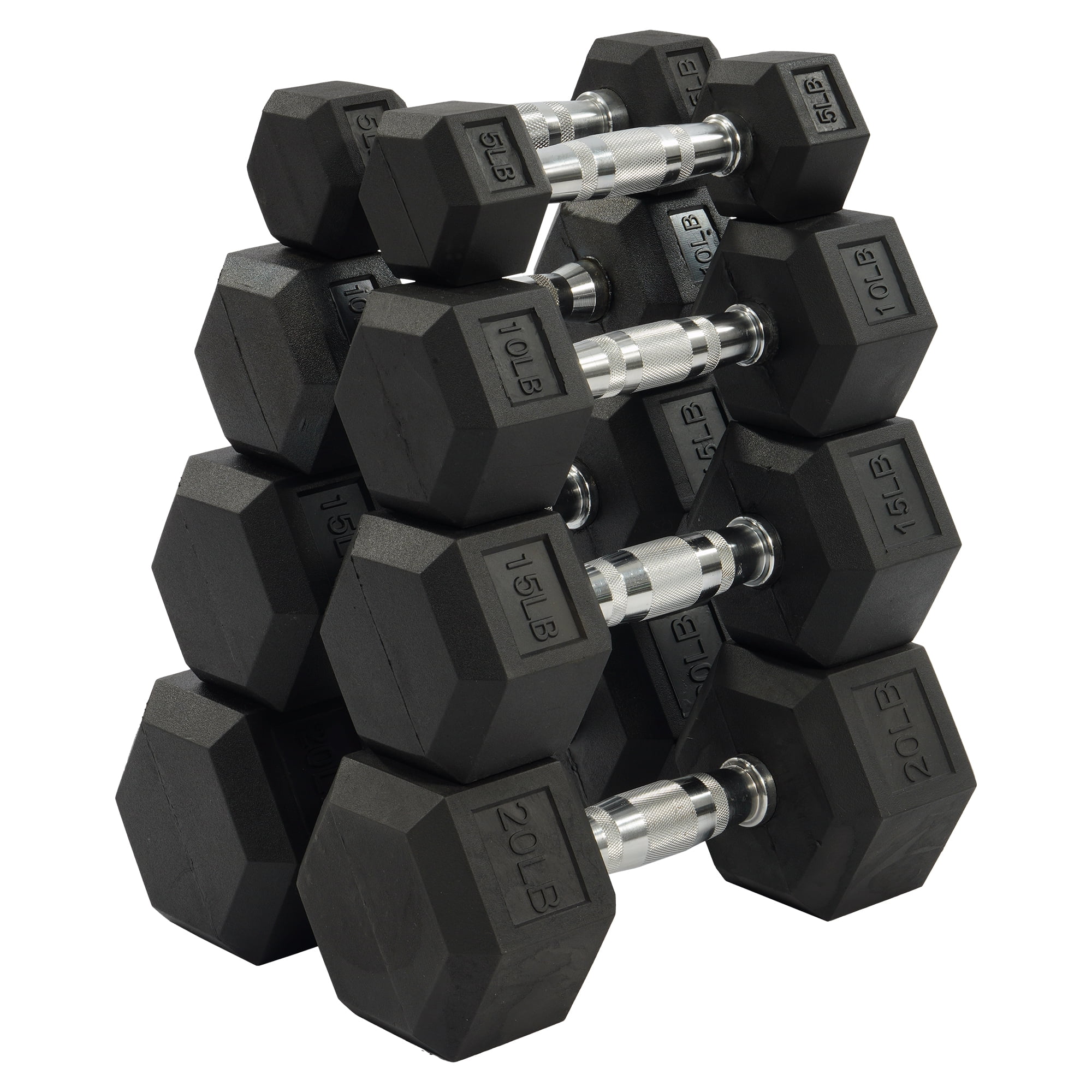 BalanceFrom Dumbbell Set, Pairs of 5 lb, 10 lb, 15 lb, and 20 lb Includes pairs of 5 lb, 10 lb, 15 lb, and 20 lb dumbbells for versatile weight options Constructed with high-quality rubber to protect against wear and tear Hexagonal design prevents rolling, ensuring a stable workout environment Low odor rubber encasing for a more pleasant workout experience Textured handle provides a secure grip, reducing the risk of slippage Compact design allows for easy storage in any home gym Ideal for both home and commercial use, suitable for various fitness levels Designed for strength training and toning exercises, targeting multiple muscle groups