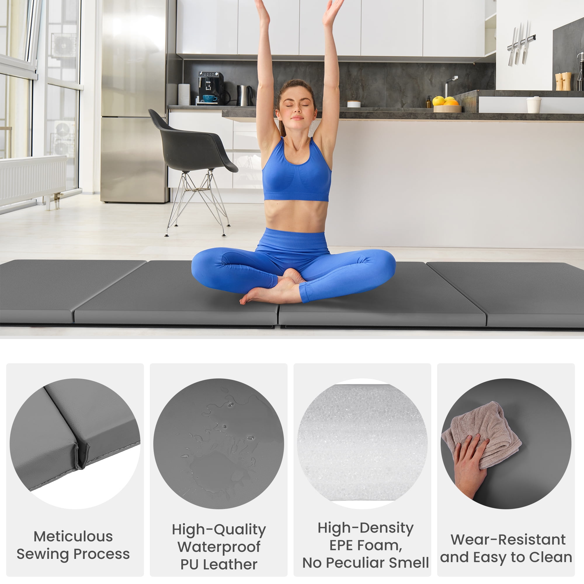 Premium Quality Materials: Surface is made of non-toxic lead-free durable 18 oz puncture resistant and non-absorbent vinyl. Product Size: 10 feet long & 4 feet wide at 2-inch thick firm high Density EPE foam is ideal for activities and exercises such as yoga, aerobics, Pilates, and martial arts. Easy to Clean: Moisture resistant technology makes the mat to be easily washed with soap and water. Foldable Exercise Mat: Velcro on all sides make it easy to hook several mats together to make a large workout area or tumbling run and securing folded shape. Portable Exercise Mat: A foldable, 4 panel design and handles on each mat make it easy to store and Transport your mat. Expanded dimension: 10′ x 4′ x 2″; folded dimensions: 48″ x 30″ x 8″.