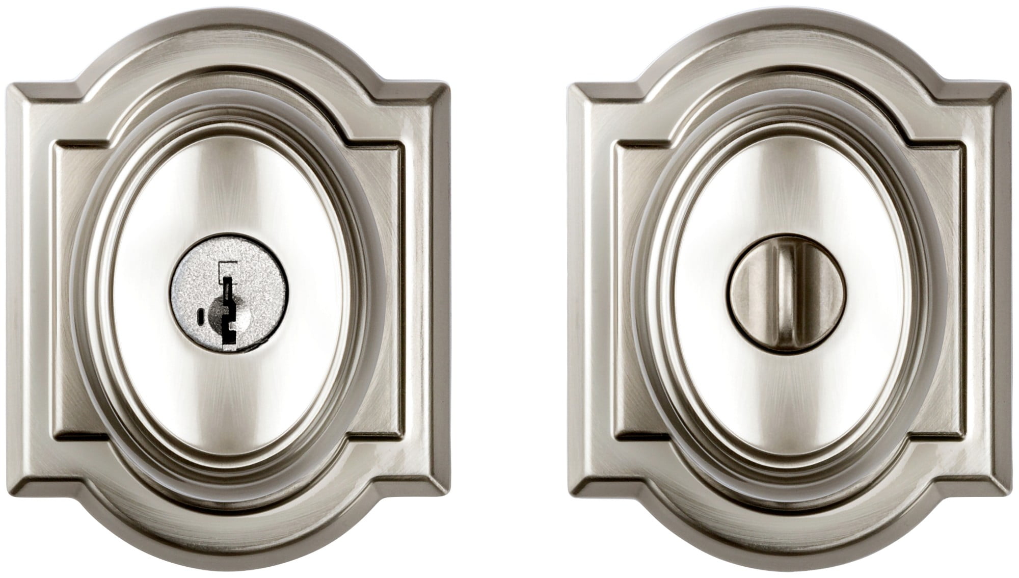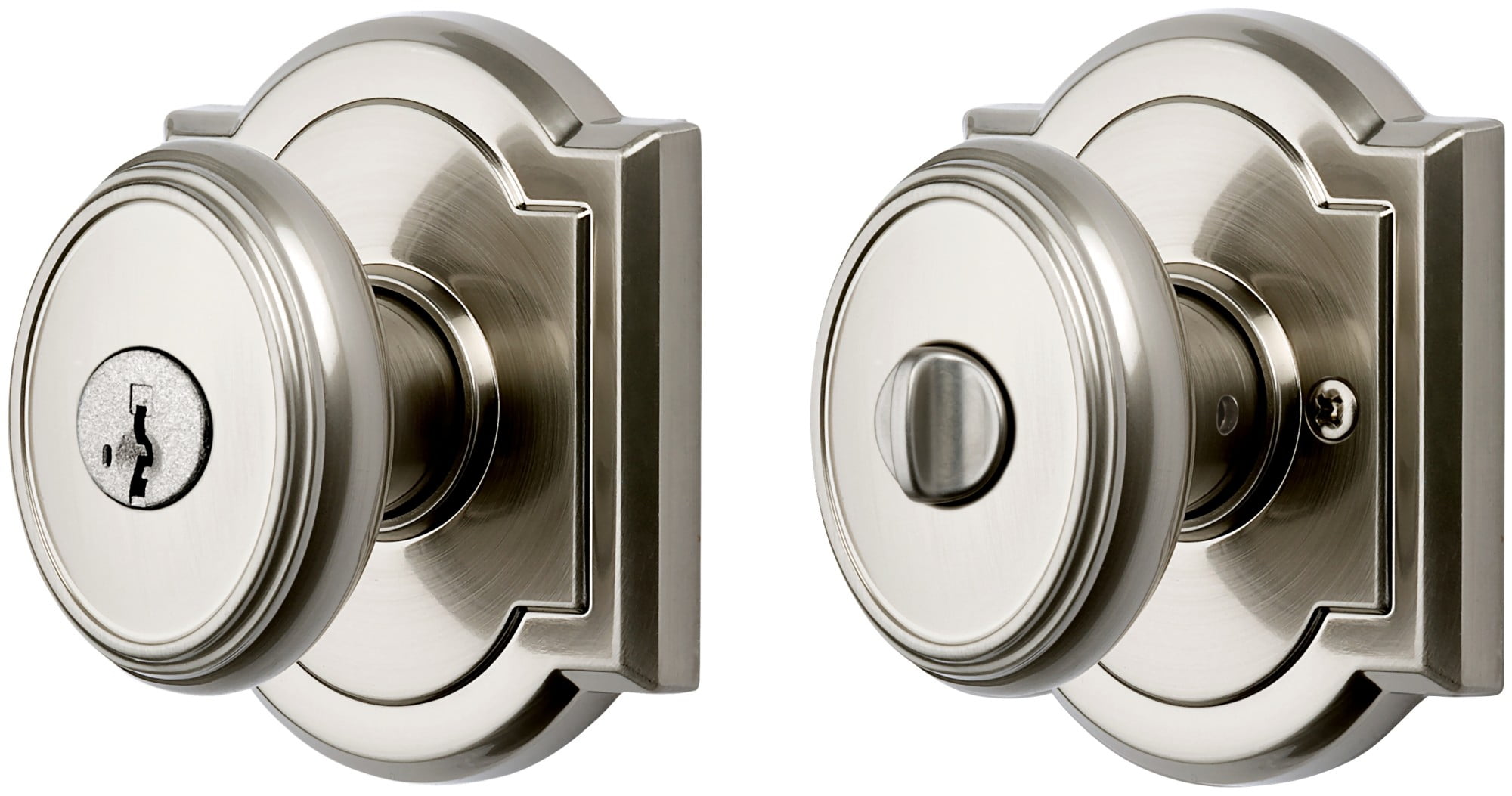 Baldwin Prestige offers effortless, accessible style and luxury with superior security Traditional-oval design shown in a satin nickel finish Featuring Smart Key Security, re-key the lock yourself in seconds in 3 easy steps Fits standard door preparations: 1-3/8″ to 1-3/4″ thick Solid construction Superior chassis with power pack compression springs for operational strength Featuring Smart Key Security™, which protects against advanced break-in techniques and allows you to re-key your lock yourself in seconds. Smart Key Security™ re-key technology is compatible with Kwikset (KW1) keyway Comes with 2 keys Latch has 2 interchangeable faceplates round corner and square corner ANSI/BHMA grade 2 certified Latch has adjustable back set 2-3/8″ to 2-3/4″ to fit all standard door preparations Locking mechanism functions with turn piece on the interior of the lock
