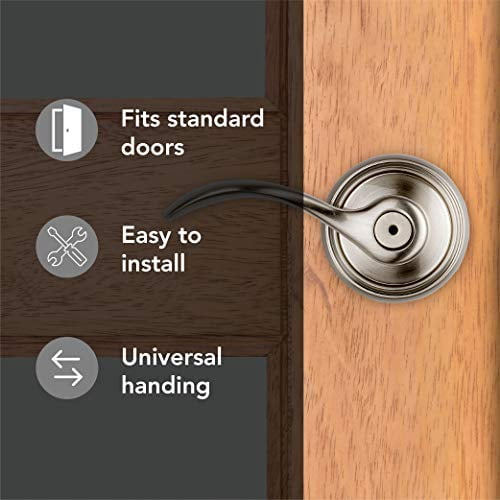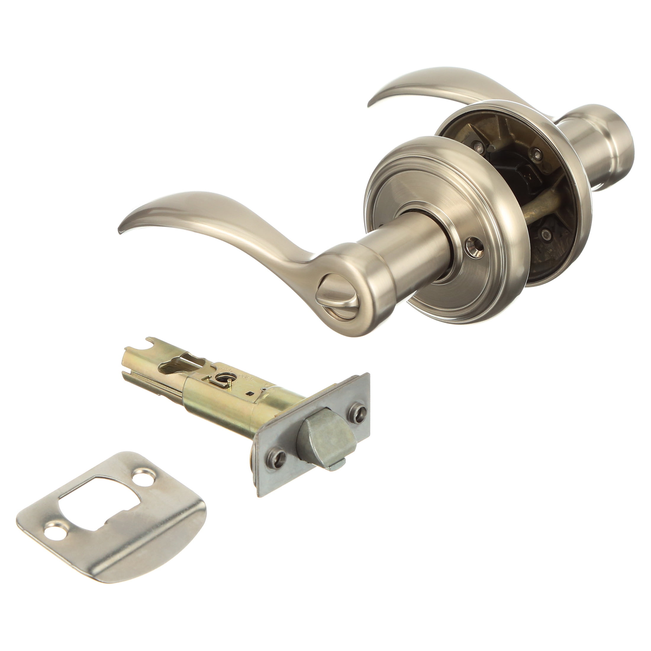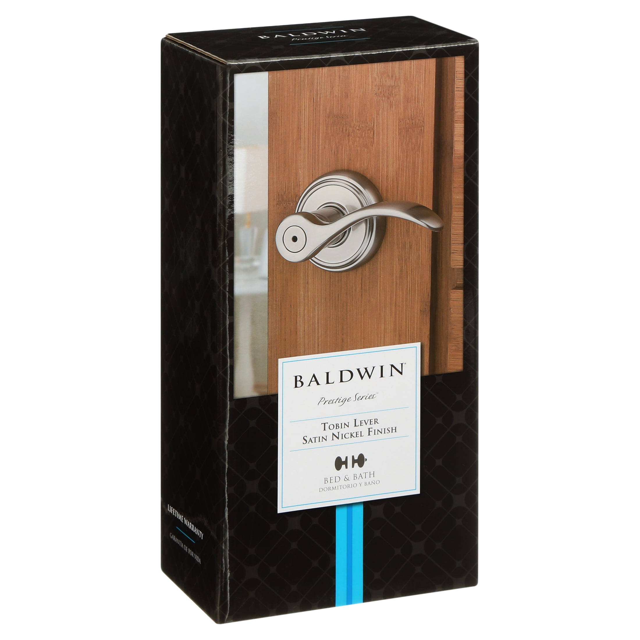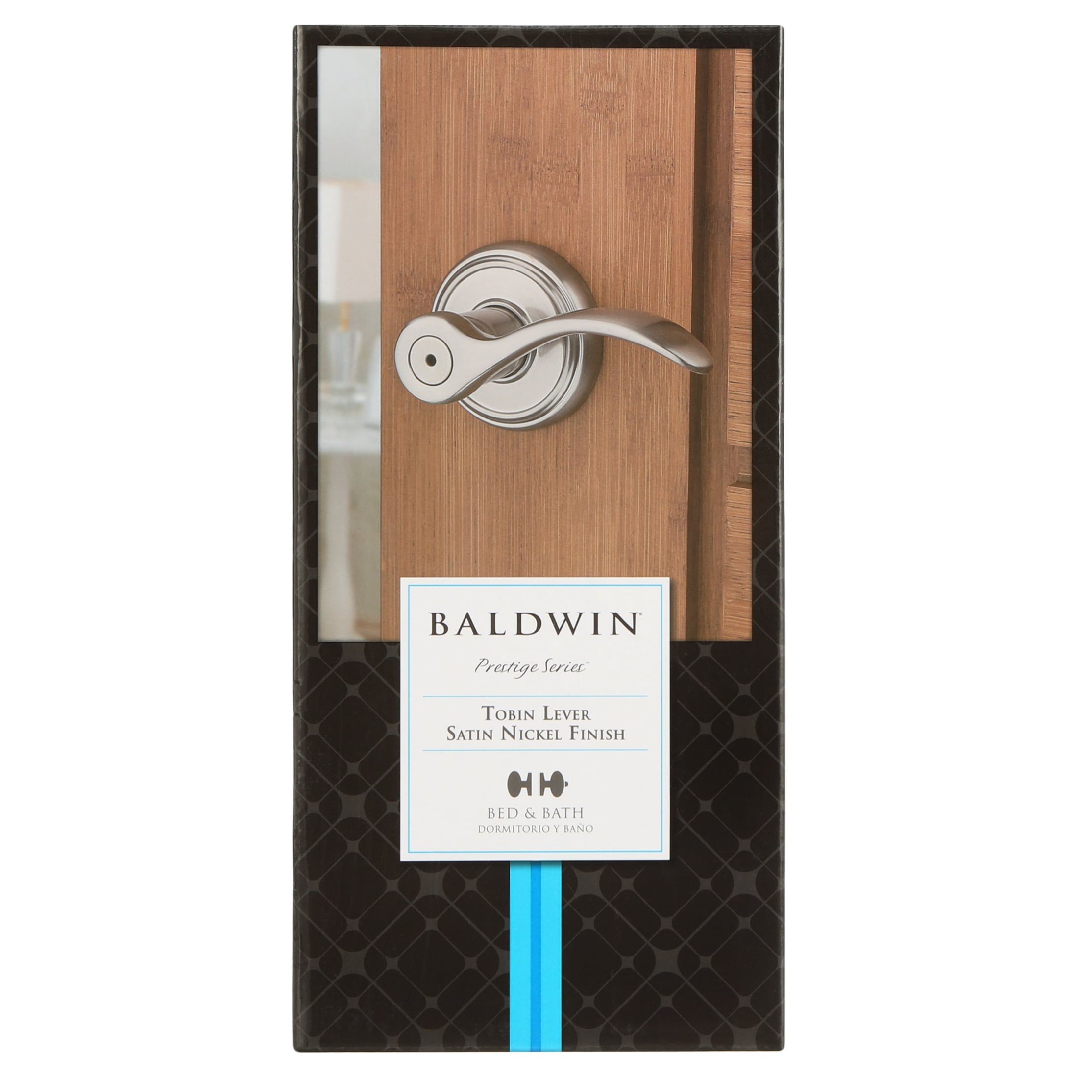 Baldwin Tobin Bed/Bath Lever Doorknob in Satin Nickel Latch has 3 interchangeable faceplates; round corner, square corner, and drive-in collar Latch has an adjustable back set 2-3/8″ to 2-3/4″ to fit all standard door preparations A fully reversible lever can be installed on both right-handed and left-handed doors