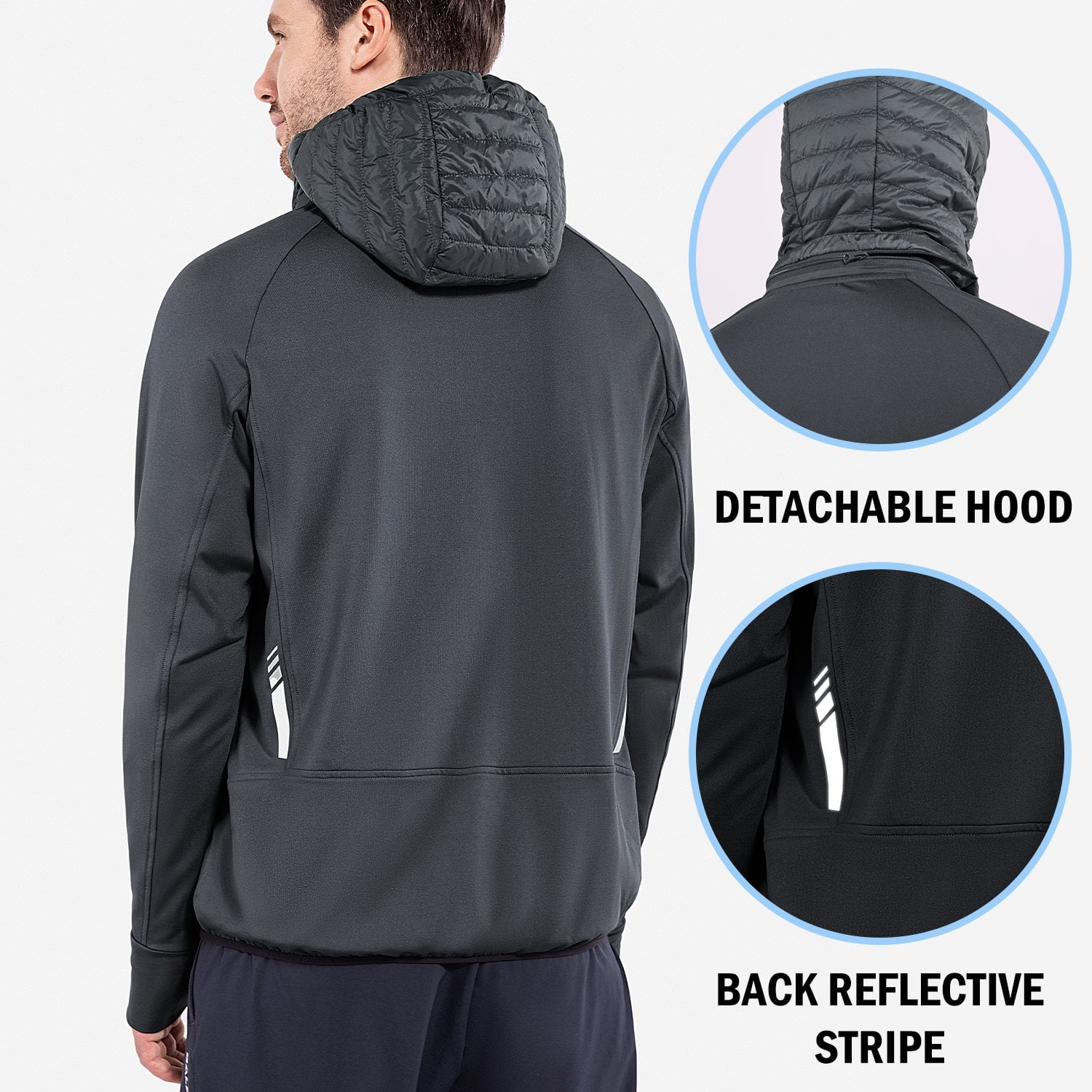 【WARM & NOT EASILY WET】Baleaf hybrid design, with quilted panels sewn into front parts to insulate cold air and retain warmth of core area. Breathable knitting materials on the side and back panels are highly breathable, wicking away moisture quickly and fabric that is not easily wet can keep you dry. Brushed fleece lining provides extra warmth 【LIGHTWEIGHT & SMALL VOLUME】Weights only 430g (approx, Size M), packs small for easy storage 【MULTIPLE POCKETS】Two side-entry hand warmer pockets with zipper for added security; one interior pockets for outdoor essentials; drawcord adjustable hem for flexible fit 【A GREAT MID LAYER】Serves as a great mid layer without feeling bulky under a hard shell coat in extreme cold condition. It is versatile as a 3-season jacket in fall, winter and spring 【FREEDOM OF MOVEMENT】Sleeves, side and back panels are made with 5% Spandex synthetic materials which stretch well. Great for climbing and other activities requiring free movement. And keep you warm during outdoor activities