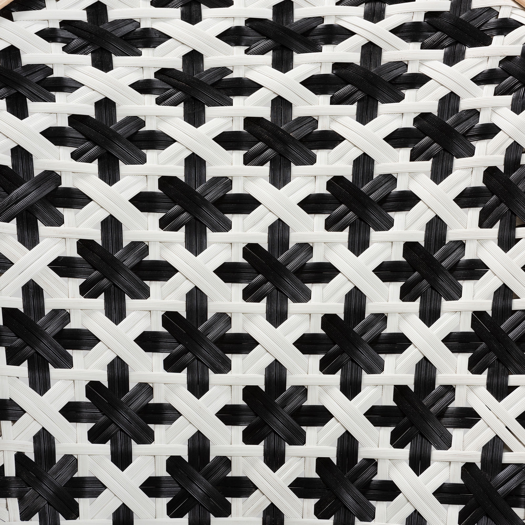 Modern French set includes two (2) bistro chairs Constructed from natural rattan and plastic weaving Woven synthetic seat and back Suitable for both indoor and semi-outdoor use (avoid direct contact with rain, sunlight, etc.) Angled legs Crisscross base Fully assembled