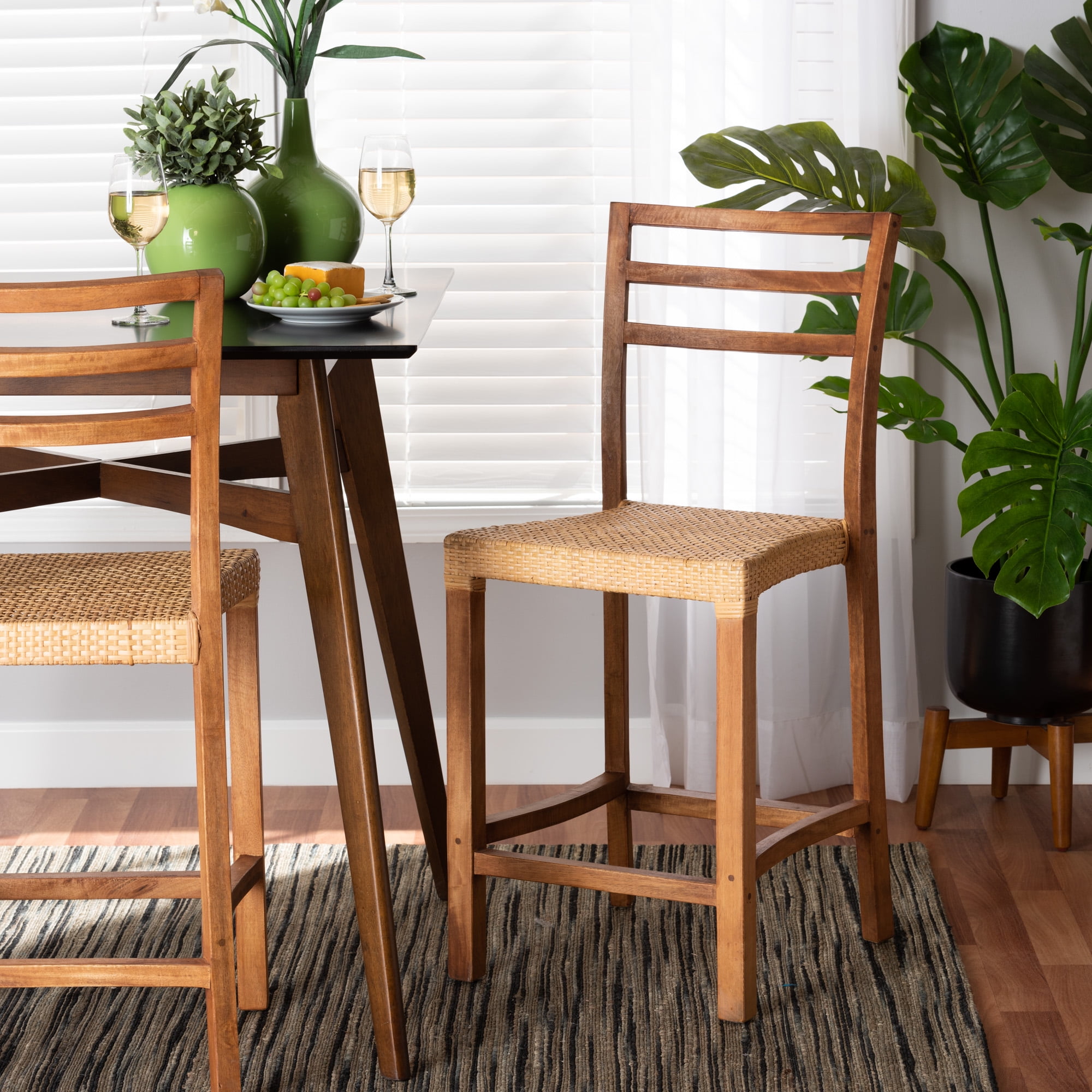 bali & pari Arthur Mid-Century Modern Walnut Brown Finished Wood and Natural Rattan Counter Stool