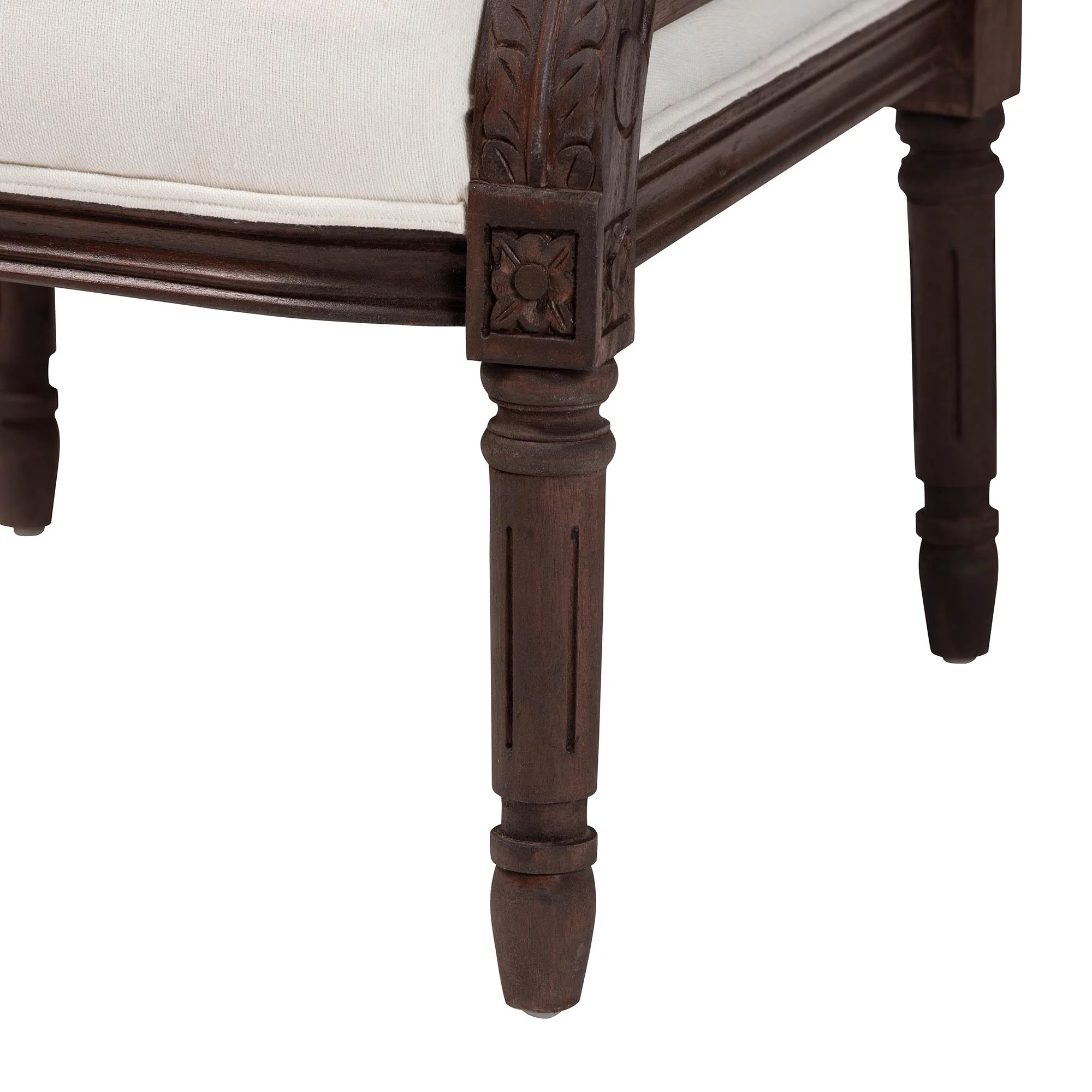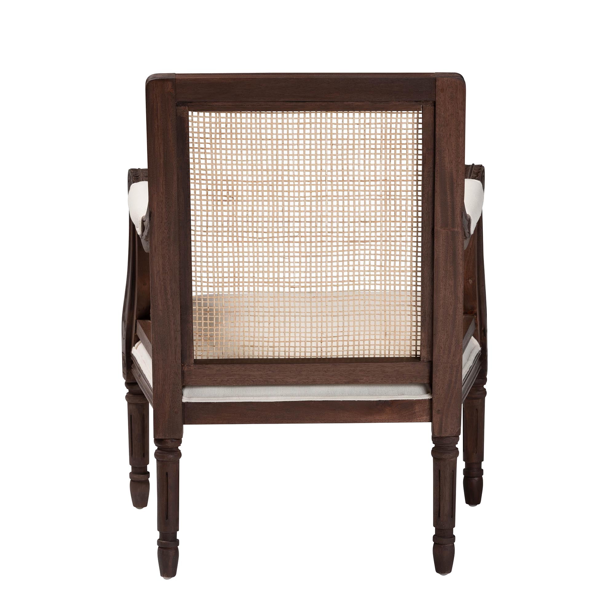 Traditional French accent chair Constructed from Bayur wood Padded armrests Woven natural rattan embellishments Padded with foam and upholstered in fabric Spade legs Seats measures 14.5″ high from floor