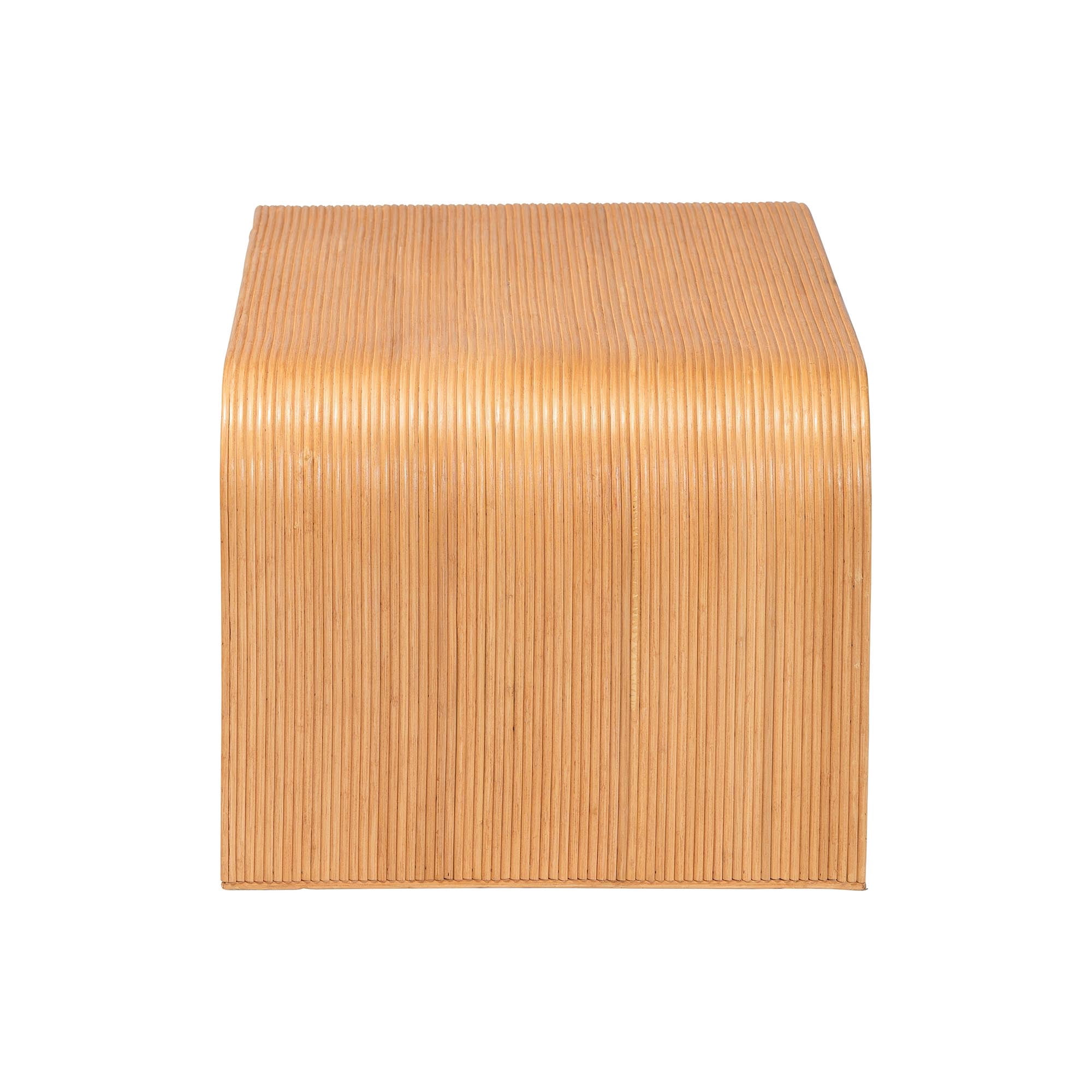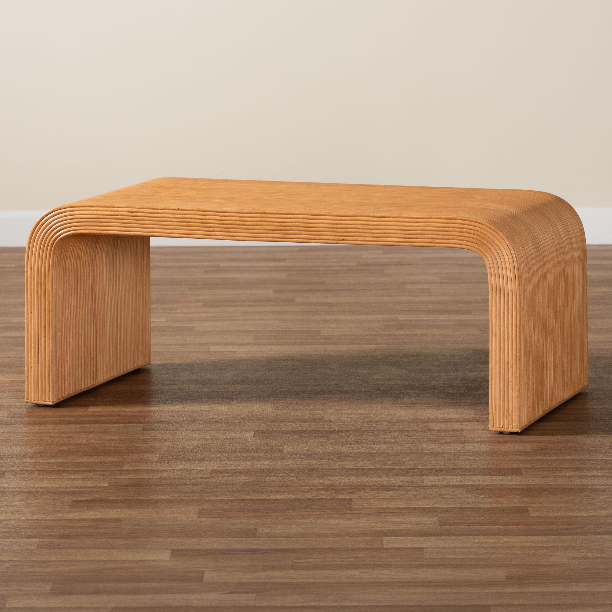 Fluted Natural Rattan Pole Exterior Natural Rattan Bohemian Waterfall Coffee Table Mahogany Wood frame encased in Natural Rattan Pole Fluted rattan detailing creates a rich visual texture Classic waterfall silhouette complements a variety of room styles Rectangular tabletop adeptly anchors your layout Fully assembled