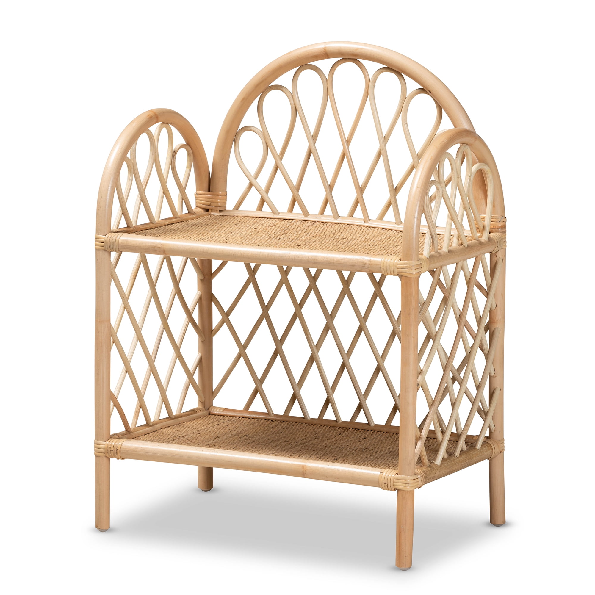 • Openwork design• Constructed from Natural Rattan and Plywood• Two (2) shelves• Curled rattan accents• Woven rattan shelves• Fully assembled• Made in Indonesia• Product Weight: 8.2 Pound• Package Weight: 12 Pound• Overall Dimensions: 29.70″ High x 21.70″ Wide x 13.80″ Deep; Bottom Shelf Space Dimensions(from bottom shelf to top shelf): 20.50″ Wide x 13.00″ Deep x 11.80″ High; Legs: 4.90″ High;• Product Color: Natural Brown• Product Composition: Natural Rattan/Plywood