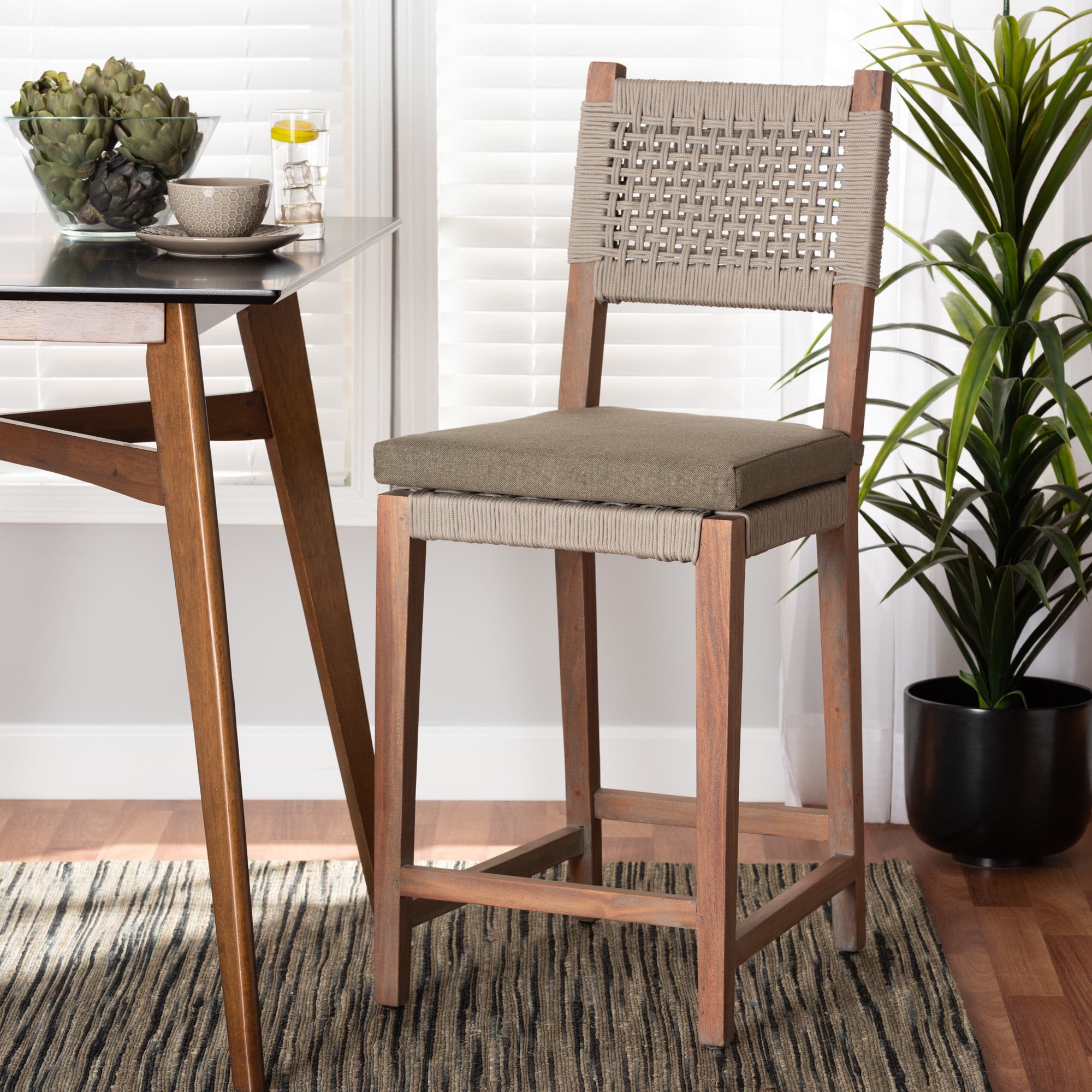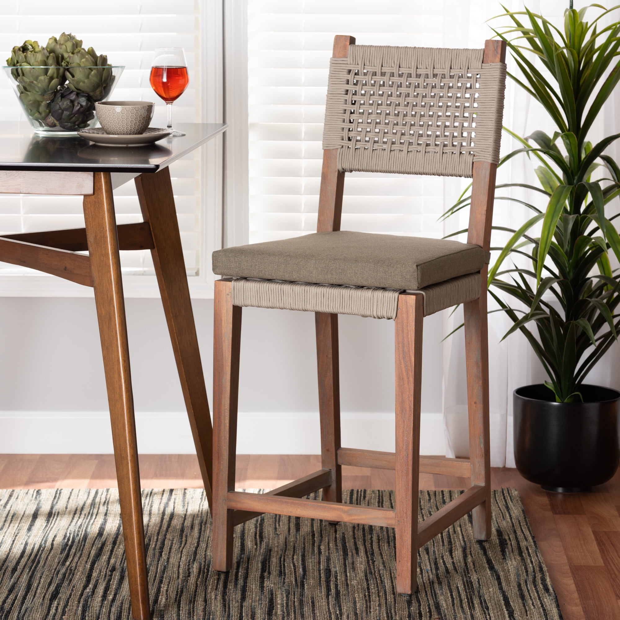 bali & pari Heyna Mid-Century Transitional Grey Woven Rope Mahogany Counter Stool