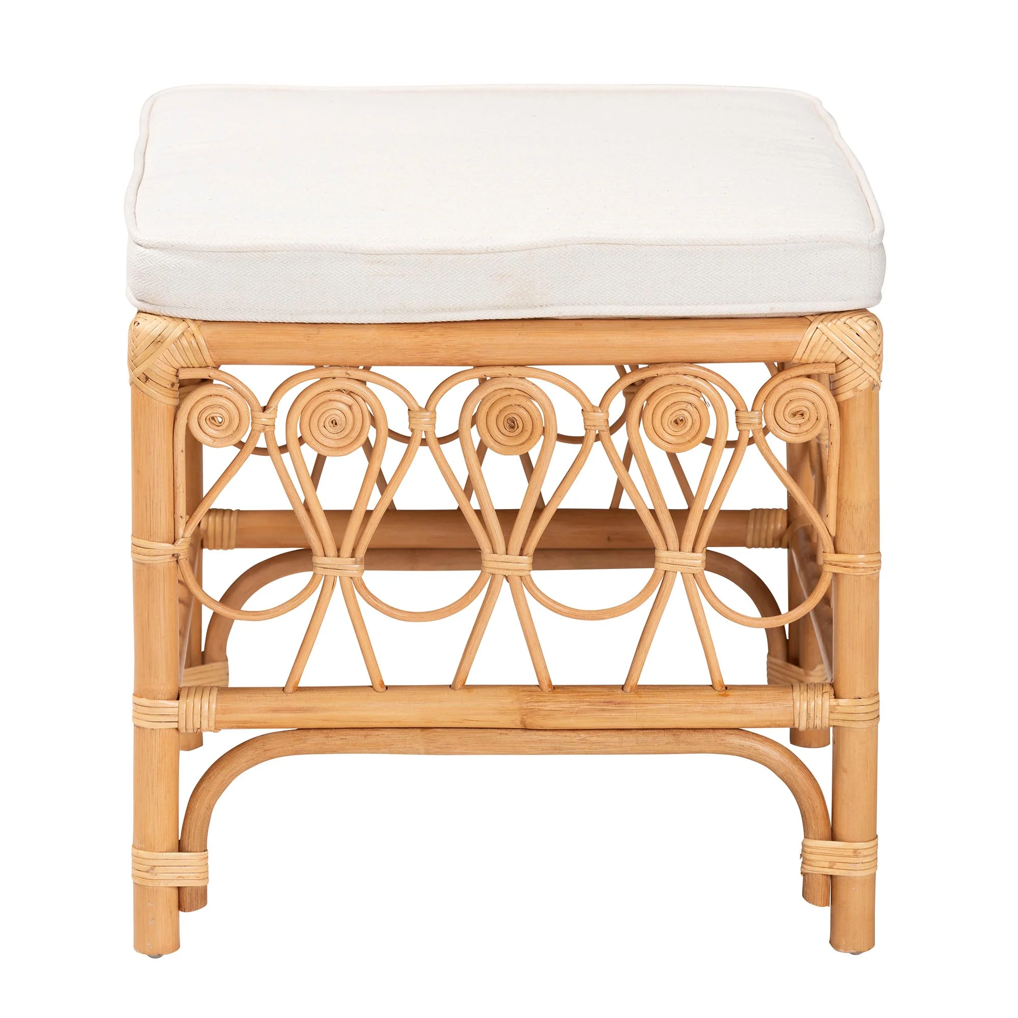 Bohemian footstool Constructed from Natural Rattan Rectangular seat Removable cushion padded with foam and upholstered in fabric Curled geometric embellishments Openwork design Fully assembled