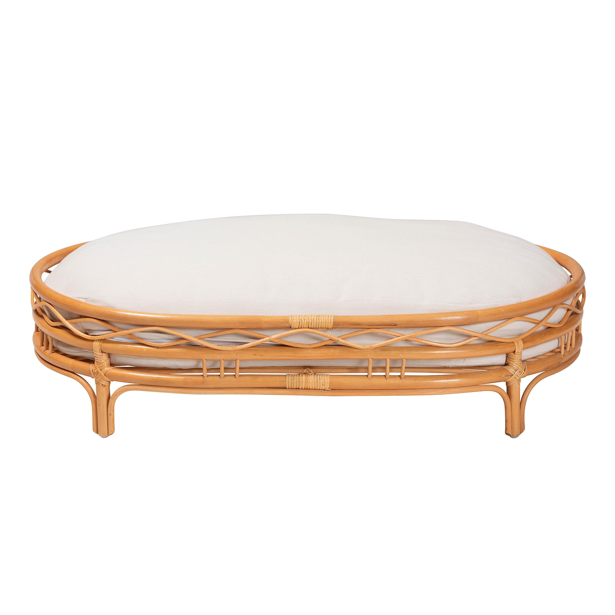 Bohemian Pet Bed Constructed from Natural Rattan Openwork Frame with Rattan Decor Embellishments Removable Cushion Padded with Foam and Upholstered In Fabric Oval Silhouette Fully Assembled