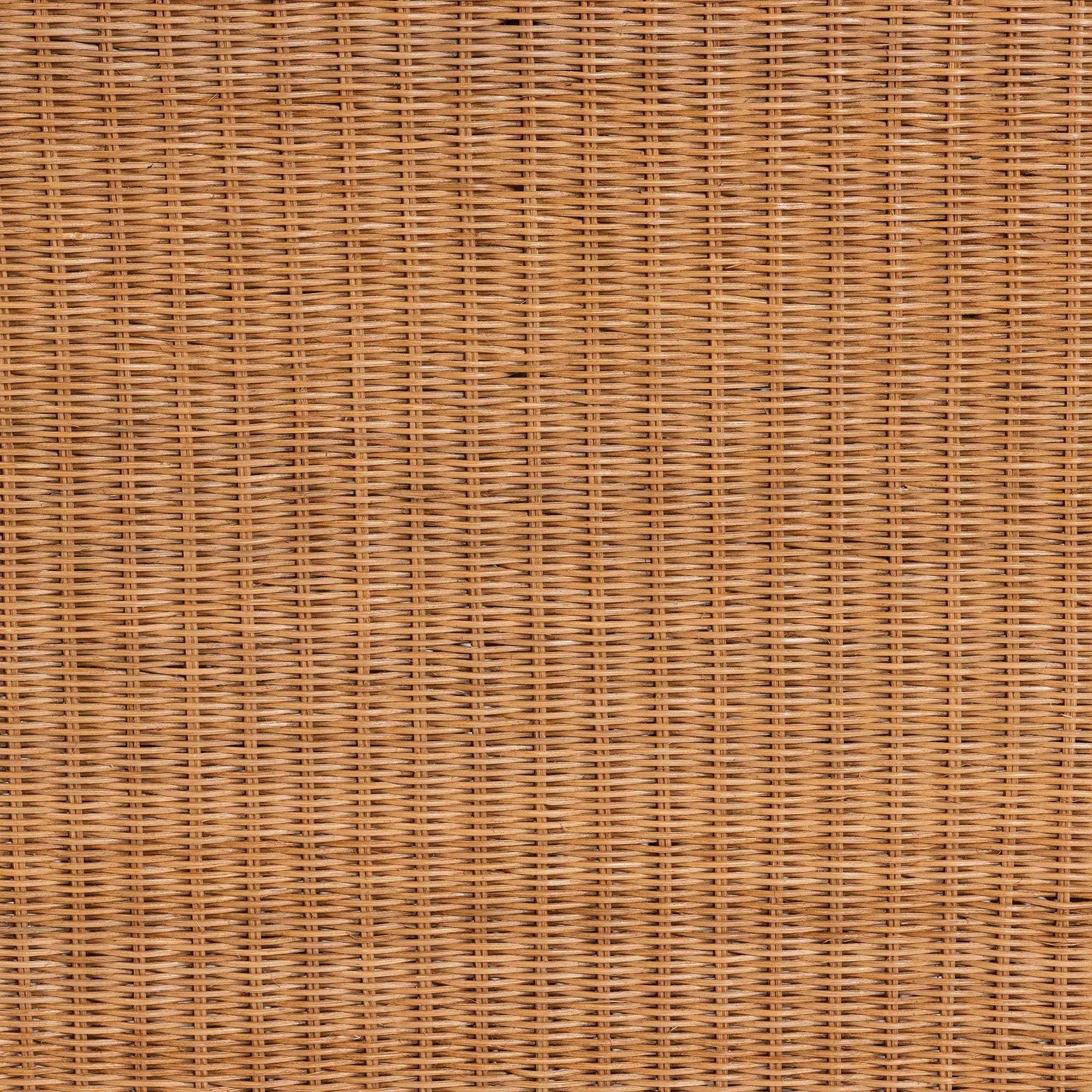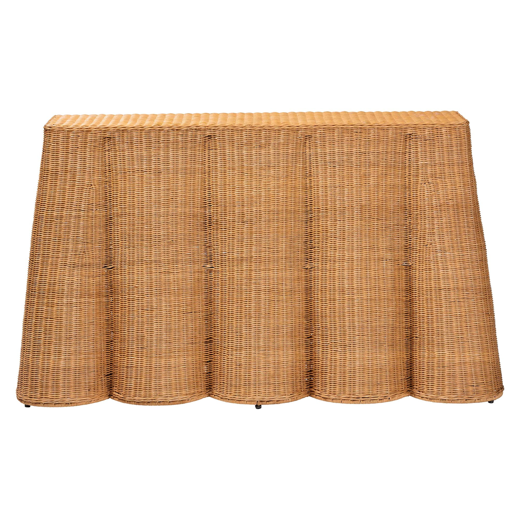 Bohemian console table Constructed from Natural Rattan, Metal, and Engineered Wood Scalloped design Handwoven natural rattan Rectangular tabletop Fully assembled