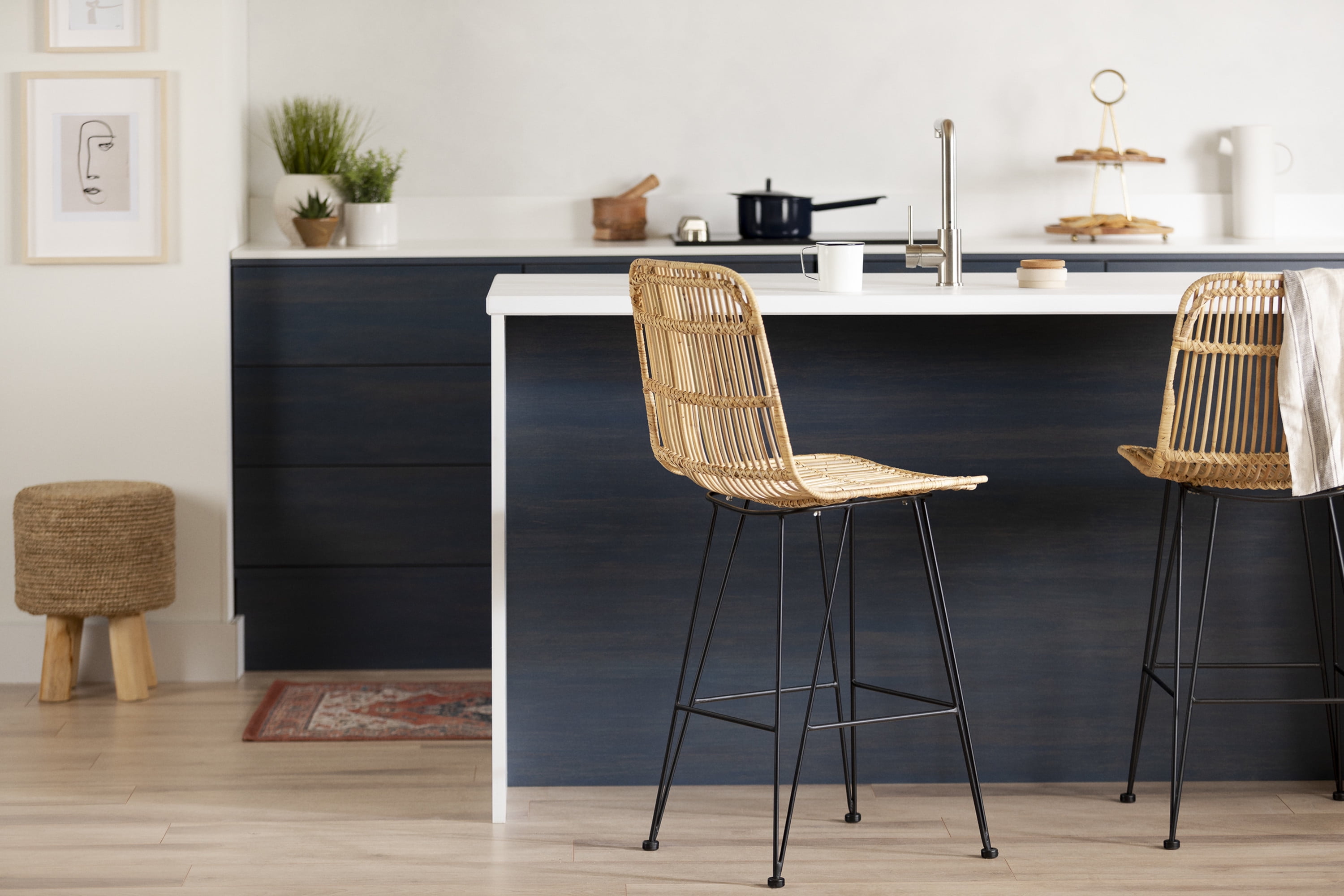 For REPLACING PARTS and HELP DURING ASSEMBLY, please contact us by phone at 1-800-290-0465, text message at 915-800-2833 (USA) (fees may apply), email at [email protected] or fill a part request form on . South Shore Balka, Bohemian Harmony Rattan Counter Stool, Set of 2, Rattan and Black SET OF TWO: Add these chairs to your kitchen island, your counter, or even your home bar! You’ll have a space that brings people together – perfect for day to day chitchat and more festive nights. HAND WOVEN: These bohemian chairs made of rattan will be the envy of all your guests! The blend of textures – hand woven rattan seat and metal hairpin legs – is simply stunning. And each stool is made by hand, for a unique look. ERGONOMIC: You’ll be able to stay sitting for hours! The seat provides excellent back support, and the metal rods on the legs can be used as footrests. You’ll be sitting in ergonomic comfort! STURDY: The metal legs on these chairs are very stable – they certainly won’t tip over. Plus, each leg is rubber capped to protect your beautiful floors. We thought of everything! Made in Indonesia. Accessories not included. 1-year limited warranty. Any questions? Contact South Shore, available 7/7: 1-800-290-0465 or Assembly is required and tools are not included. All products come with a clear assembly document that will guide you through all steps. If you have any questions during the assembly do not hesitate to contact South Shore Furniture for immediate support. This item is shipped in 1 box. Box dimensions : 23.25″ (L) x 20.75″ (W) x 30″ (H) 37.5 lb All our products meets or exceeds North American safety standards and our packaging are tested and certified to reduce the risk of damage during shipment. Wipe with a dry cloth