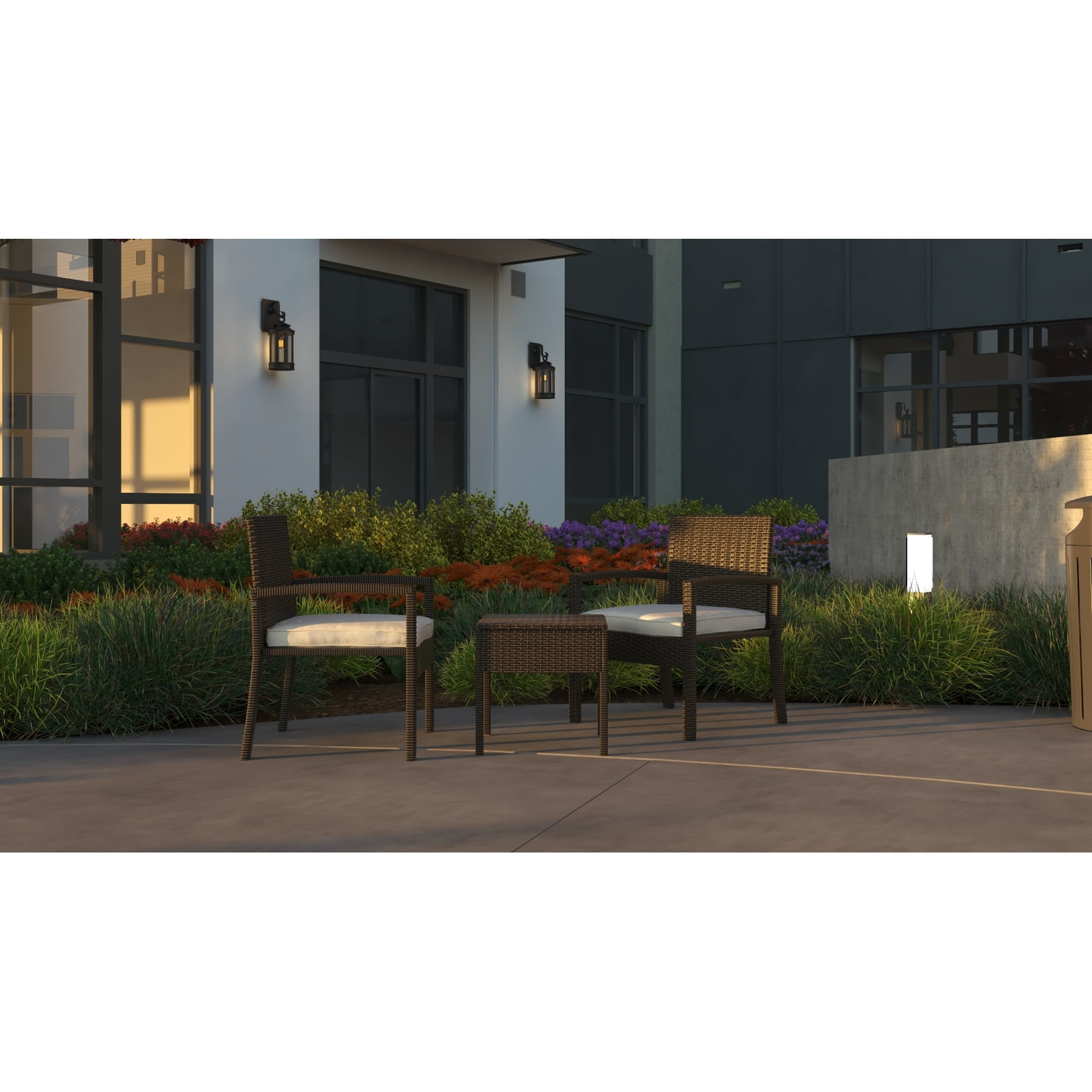 Balkene Home 63358: The Bern Wicker Conversation Set is constructed of all weather wicker and includes comfortable light khaki cushions. BERN CONVERSATION SET IN MOCHA WICKER: The lightweight yet durable armchairs and occasional table are perfect for enjoying an evening on the patio or relaxing poolside. EASY ASSEMBLY: The attractive mocha finish is the ideal accent for any patio. This wicker set can be used year-round and provides a maintenance-free outdoor seating experience. FEATURES: All Weather resin-wicker construction | Beautiful mocha finish | 2″ thick khaki outdoor cushions included | Low maintenance – just wipe with a damp cloth or gently launder cushion covers and air-dry | Easy assembly | Lightweight for convenient maneuverability | Weight limit per chair is 350 lbs. ASSEMBLED DIMENSIONS: Chair (2): 23″L x 23″W x 28″H; Weight: 15 lbs | Seat: 19″W x 14″H x 19″D | Seat Back: 19″W x 16.5″H | Table: 16″L x 16″W x 17″H; 4 lbs.