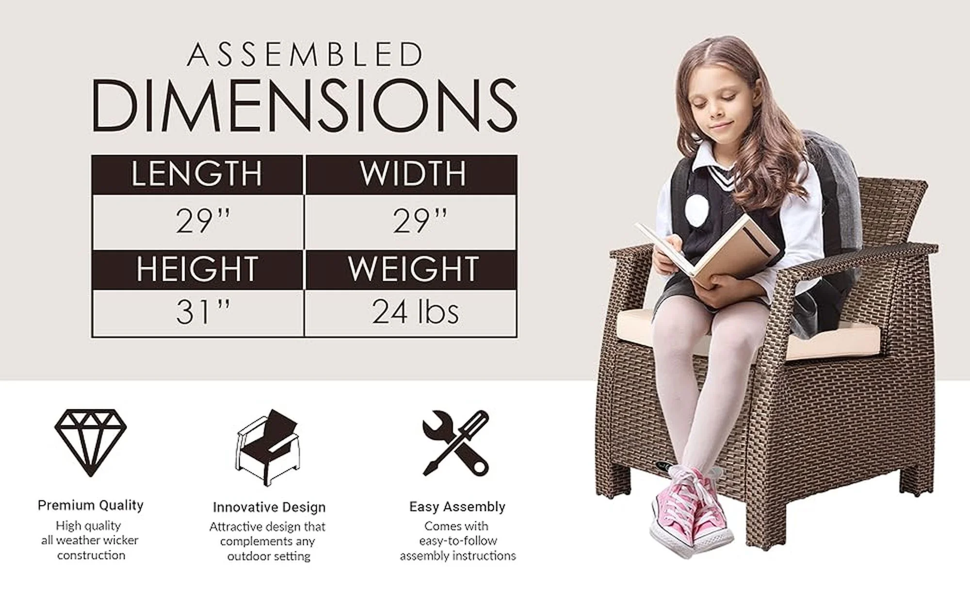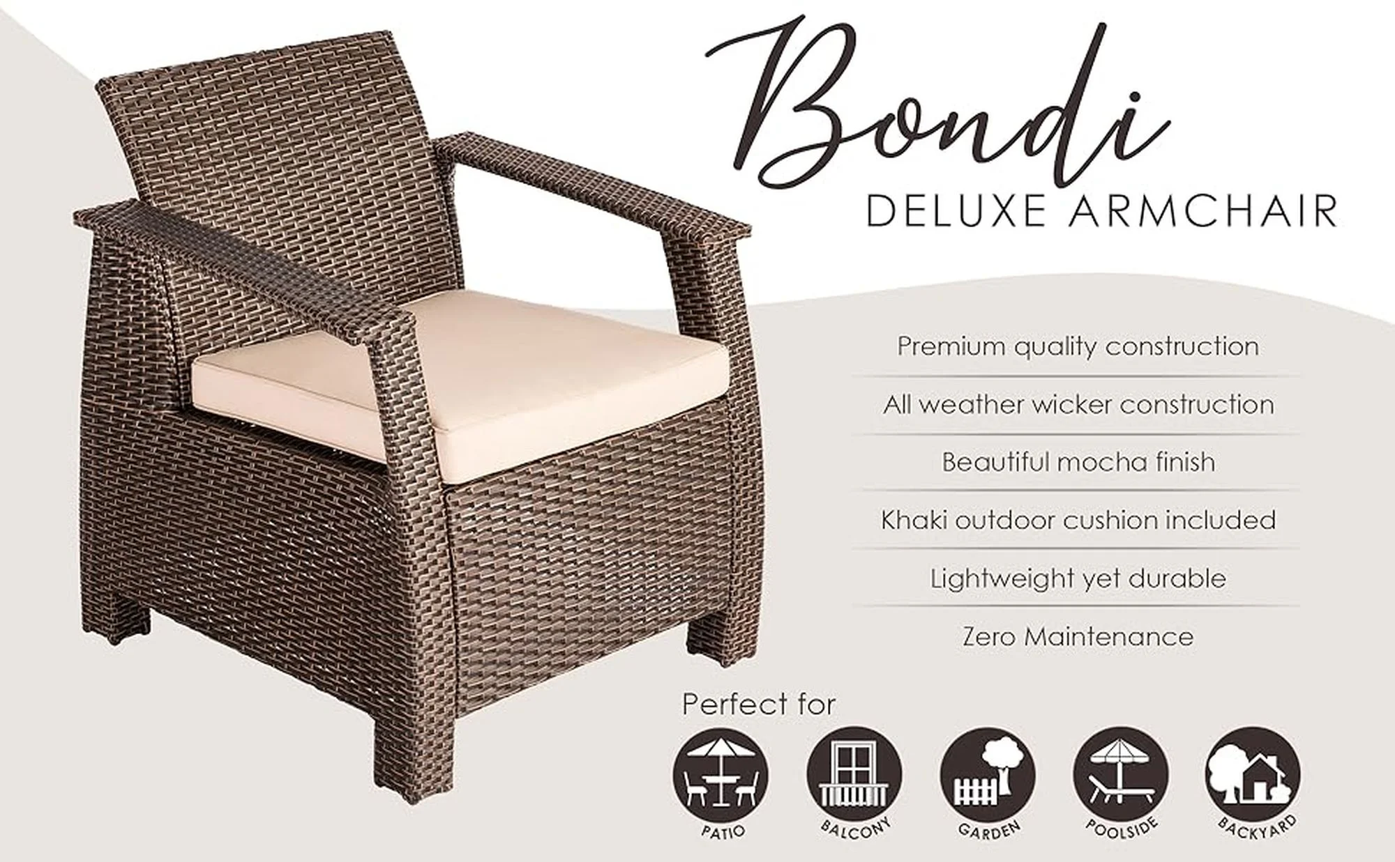 BONDI DELUXE ARMCHAIR IN MOCHA WICKER: The Bondi Deluxe Wicker Armchair is constructed of all-weather wicker and includes a comfortable khaki cushion. This lightweight yet durable armchair is perfect for enjoying an evening on the patio or relaxing poolside. The attractive mocha finish is the ideal accent for any patio. This wicker chair can be used all year round and provides a low-maintenance outdoor seating experience. All weather wicker construction | Beautiful mocha finish | Khaki outdoor cushion included | Low maintenance – just wipe with a damp cloth or gently launder cushion covers. Easy assembly | Lightweight for ease of mobility | Weight limit is 350 lbs. ASSEMBLED DIMENSIONS: Chair: 29″L x 29″W x 31″H, Weight: 24 lbs