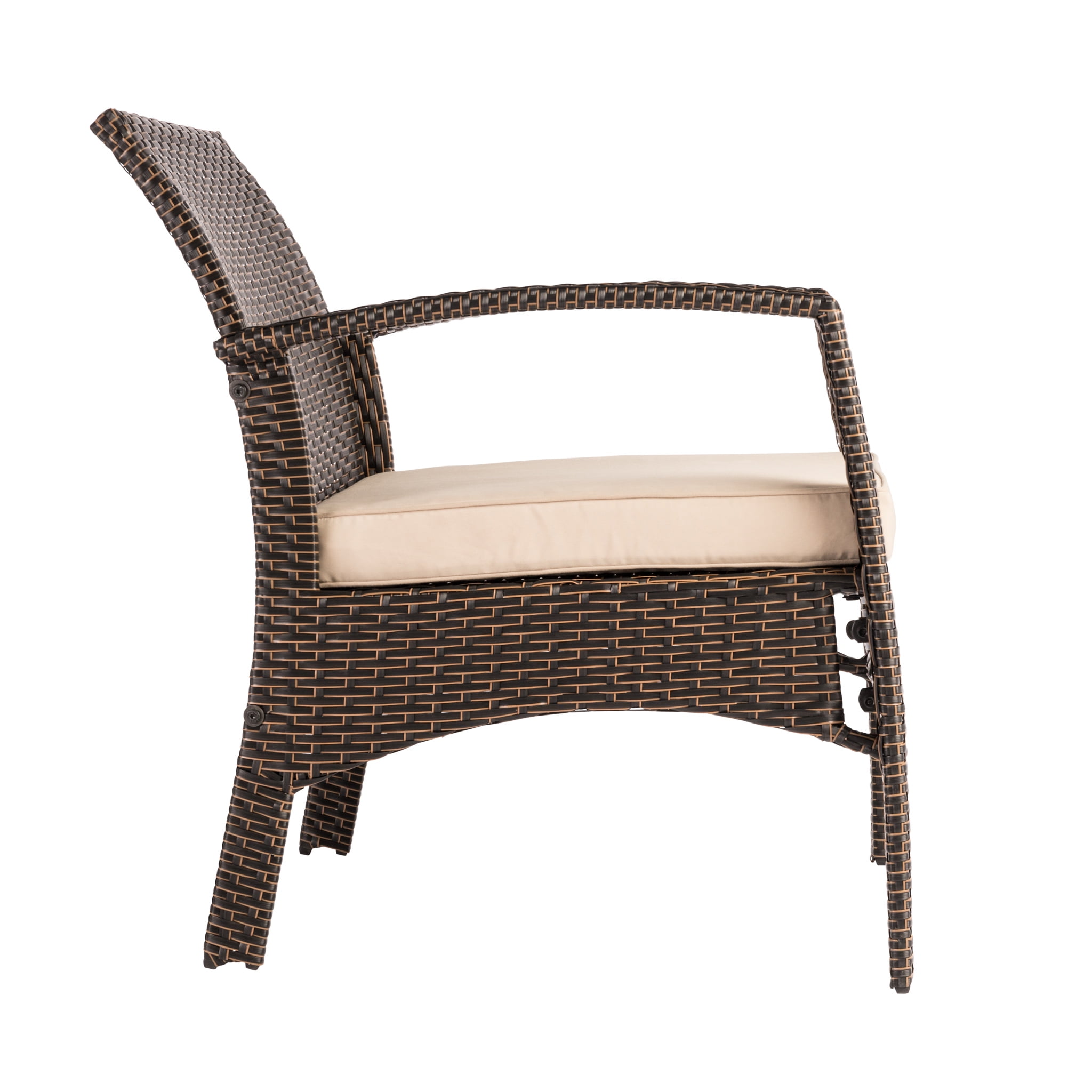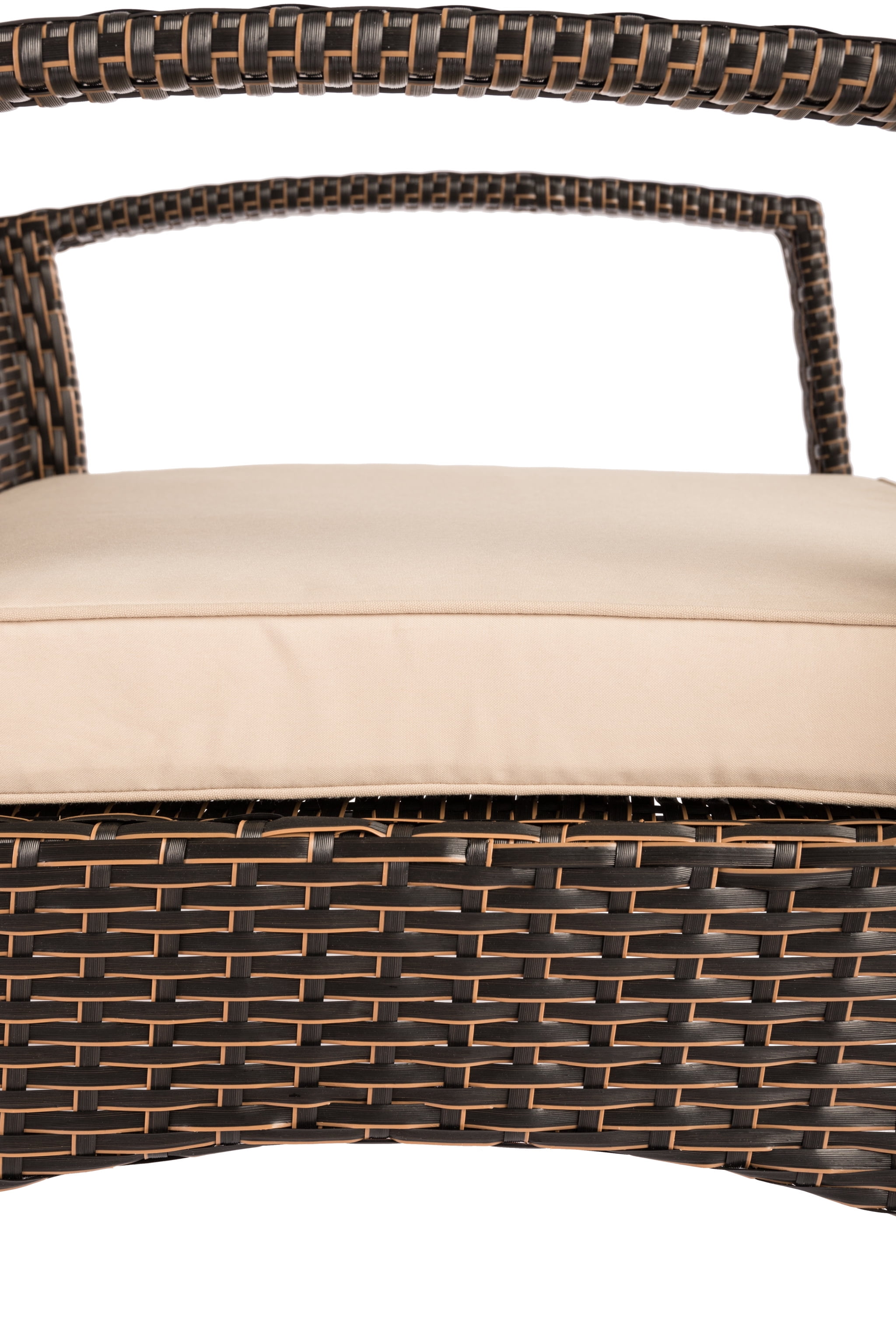 Dimensions: 28W x 26D x 29H in. All weather wicker resin construction Beautiful mocha finish Khaki outdoor cushion included Easy assembly Wipe with a damp cloth Lightweight for ease of mobility Weight limit is 350 lbs