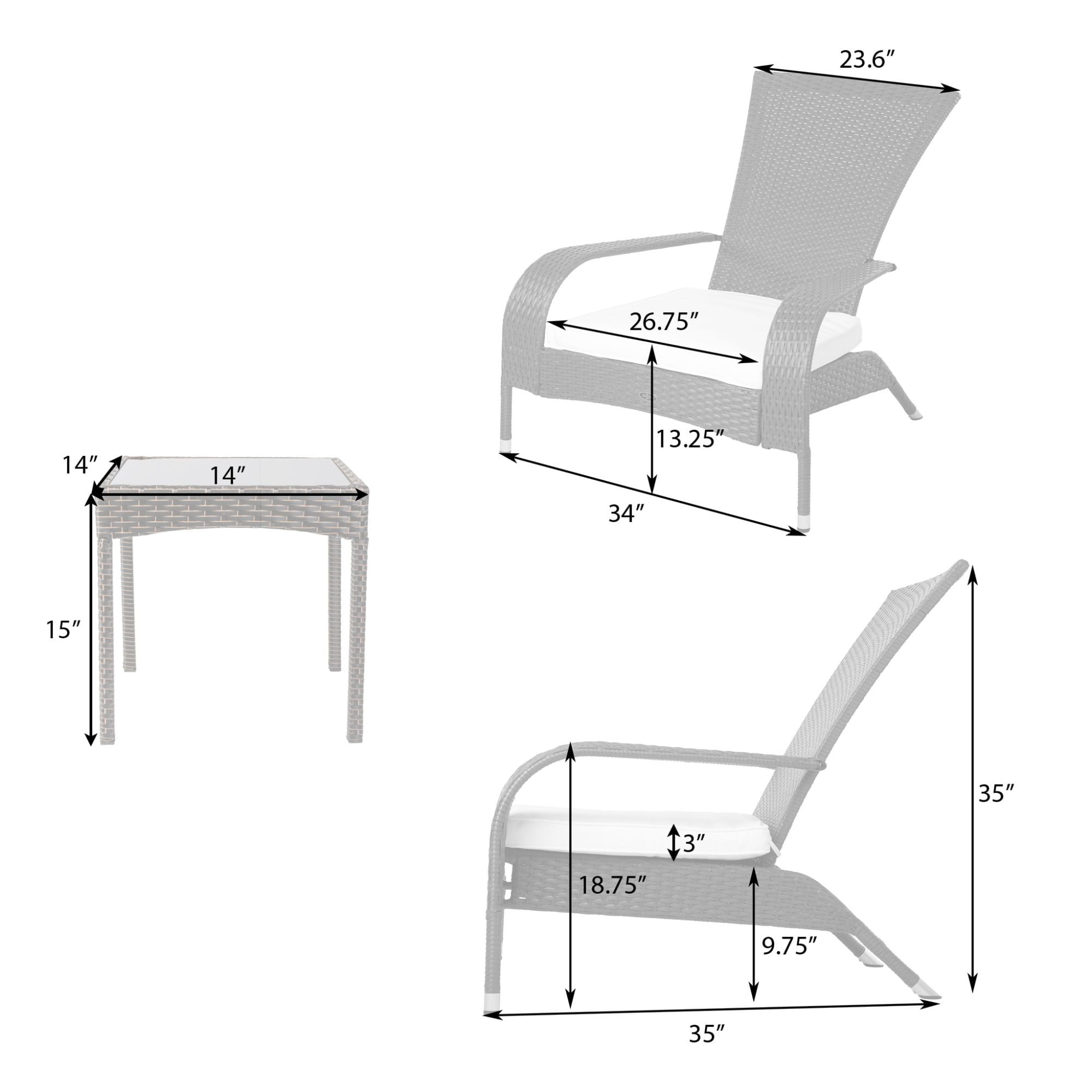 COCONINO WICKER CONVERSATION SET: The Coconino Wicker Conversation Set is constructed of all weather wicker and includes khaki cushions. The lightweight yet durable Adirondack style chairs and tinted glass-topped side table are perfect for enjoying an evening on the patio or relaxing poolside. The attractive mocha finish is the perfect accent for any patio. This wicker set can be used all year round and provides a maintenance-free outdoor seating experience. All-weather wicker construction | Beautiful mocha finish | Khaki outdoor cushion included. Zero maintenance | Easy assembly | Lightweight for ease of mobility | Weight limit per chair is 220 lbs. ASSEMBLED DIMENSIONS: Chair: 35″L x 34″W x 35″H, Weight: 15.5 lbs | Table: 14″L x 14″W x 15″H, Weight: 8.7 lbs