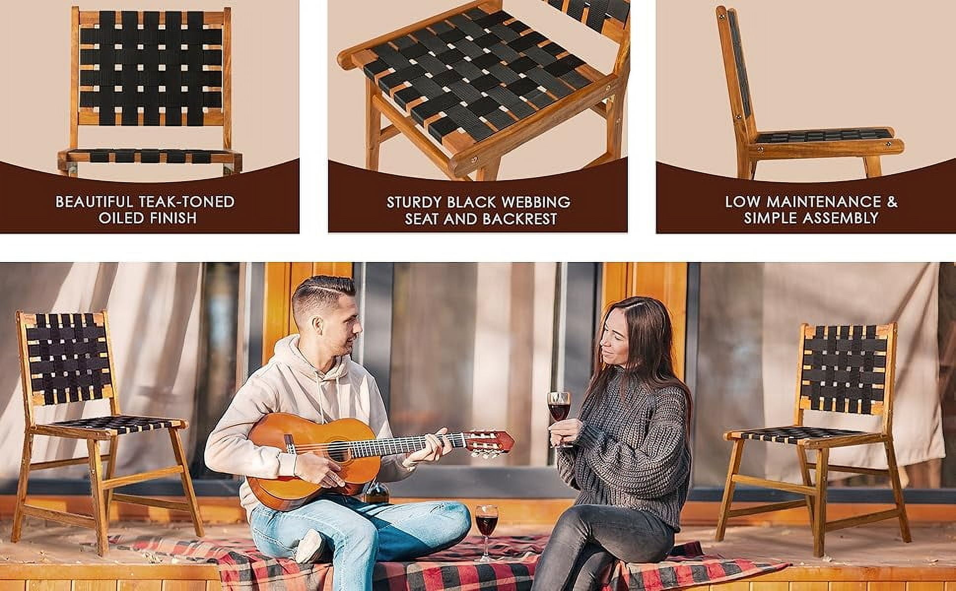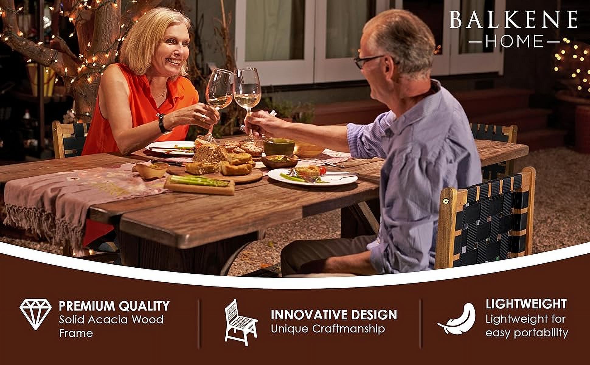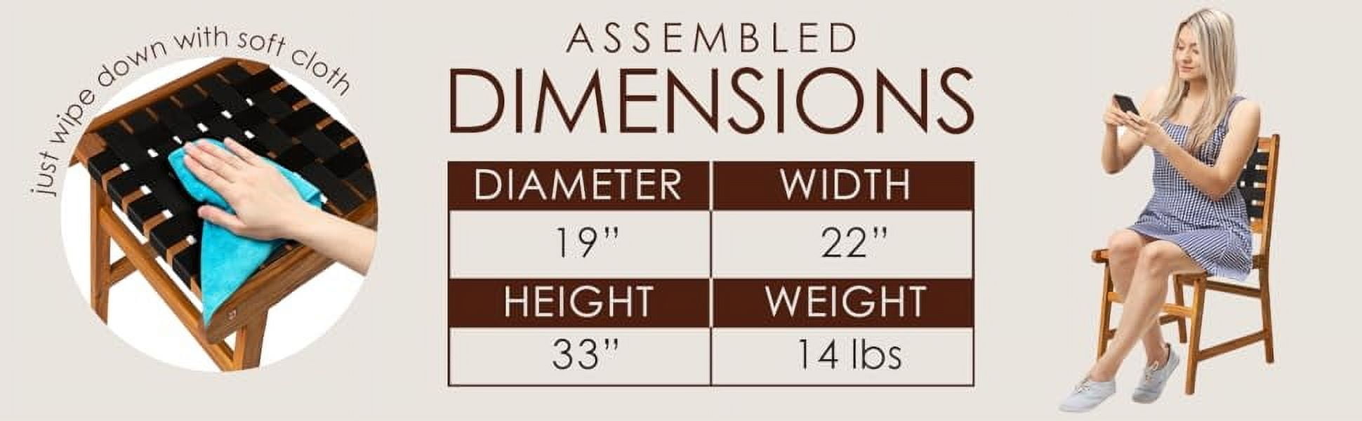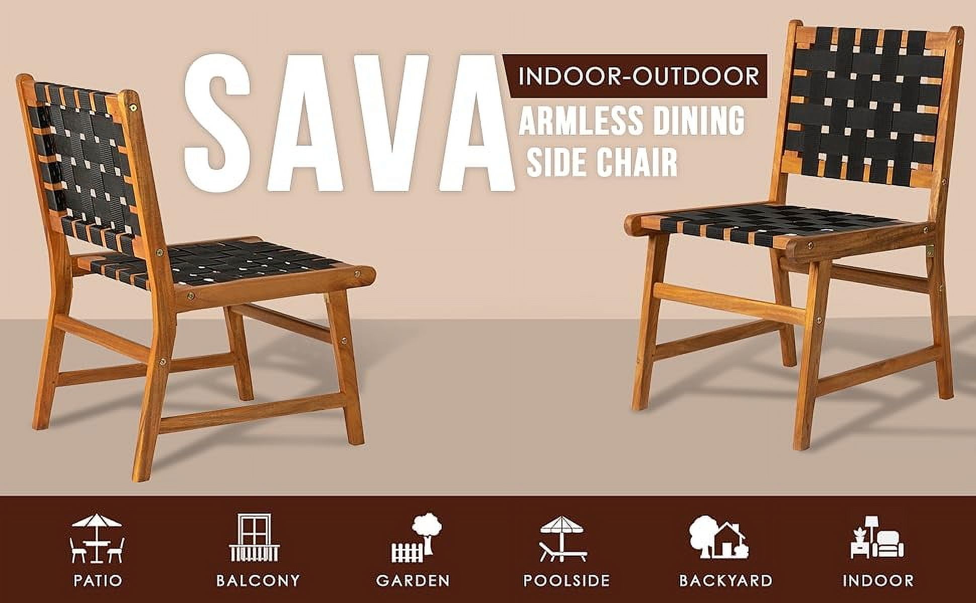BALKENE HOME 63710: The Sava Armless Dining Chair is midcentury-inspired modern seating with a solid acacia wood frame and woven webbing seat and back. SAVA INDOOR OUTDOOR ARMLESS DINING SIDE CHAIR IN BLACK WEBBING: The attractive teak-toned finish is the perfect accent for any patio or indoor dining area. The comfortable design is perfect for a relaxing meal alfresco or a modern dining set. SOLID ACACIA WOOD CONSTRUCTION: The Sava Dining Chair can be used all season long with basic care and maintenance, and may be easily stored away in the off-season thanks to its folding design. FEATURES: Sturdy black nylon webbing seat and backrest | Solid acacia wood construction | Beautiful teak toned oiled wood finish | Chair can be used indoors or out | Low maintenance: just wipe down with soft cloth | Simple assembly | Light weight for easy portability. ASSEMBLED DIMENSIONS: 21.5″W x 23″D x 36.25″H, Weight: 12 lbs | Seat: 18″H x 17.5″W x 13.5″D | Folded Dimensions (approx): 41″ x 21.5″ x 5.25″