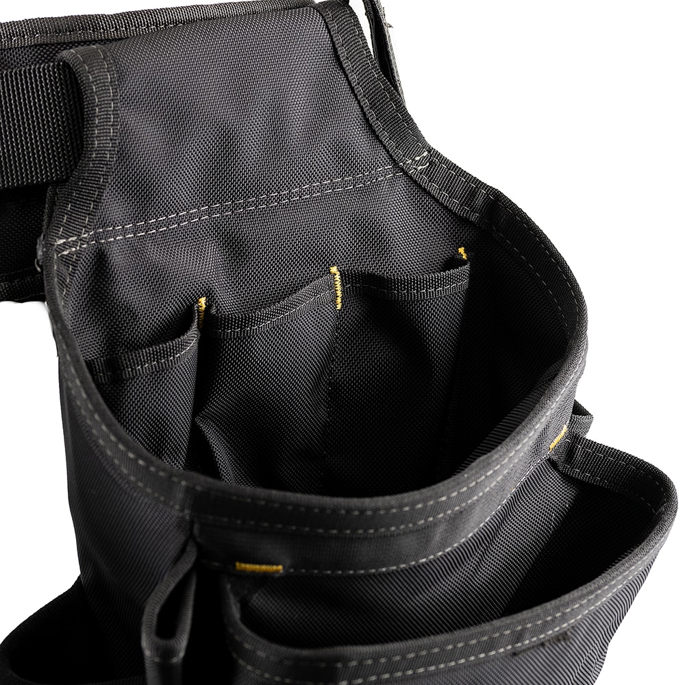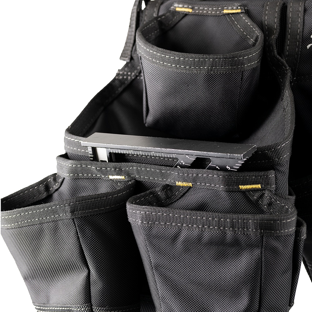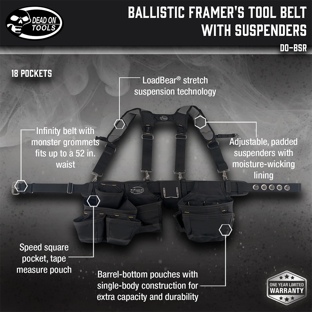 The Ballistic Framer’s Tool Bag Set is made with ballistic nylon, the toughest, longest-lasting fabric. Pouches and suspenders can be removed or adjusted for customized tool organization. Barrel-bottom, reinforced pouches allow extra carrying capacity. Tool bag set features one steel hammer holder and an additional loop for and an additional loop for hammers or other long-handled tools, cats-paw sleeves and a tape measure clip. Infinity belt can be adjusted up to a 52” waist using thick steel grommets. LoadBear®stretch suspension technology allows the weight of the tool belt to move comfortably with your body while at work. Suspenders have moisture-wicking padding and feature a cell phone pocket that fits most smart phones.