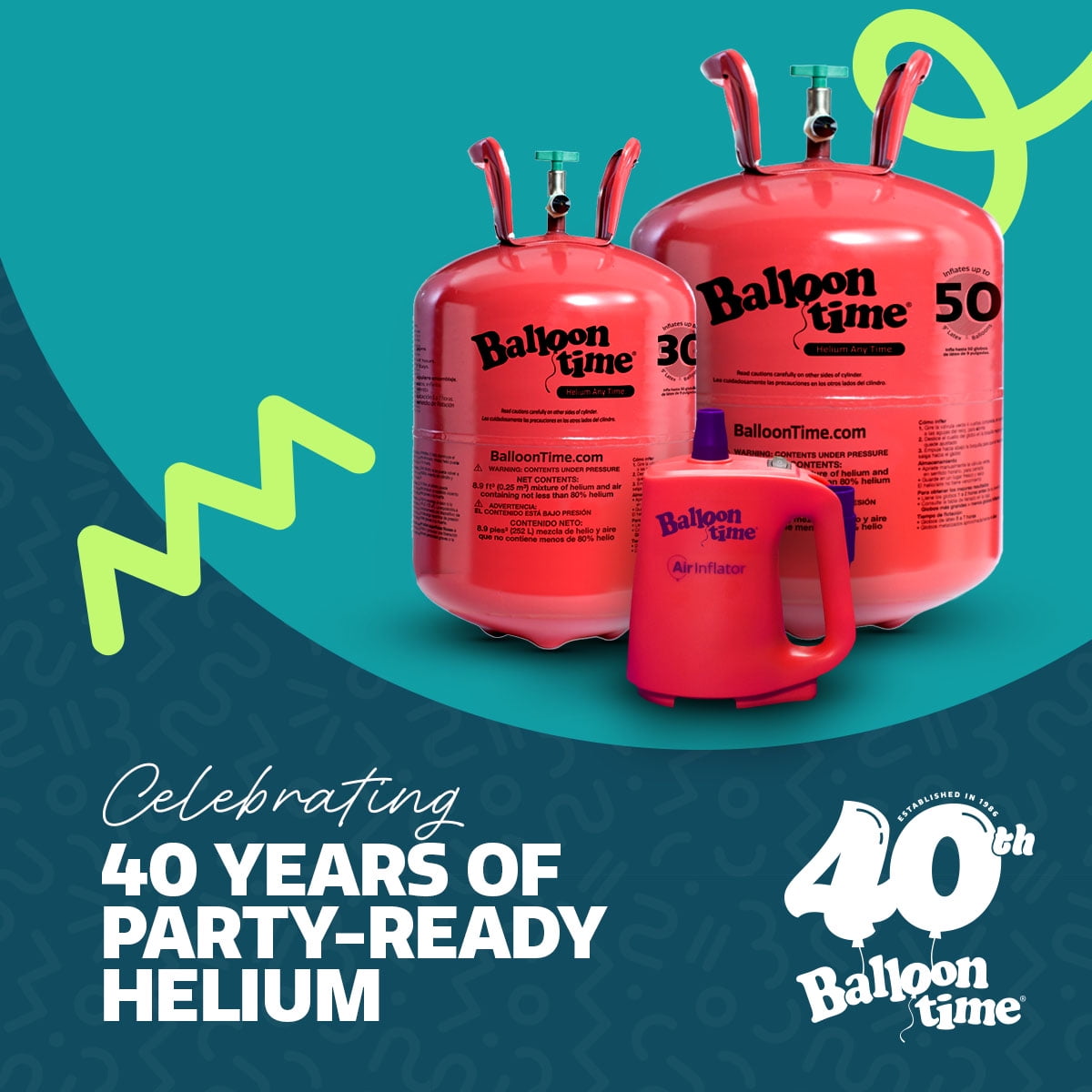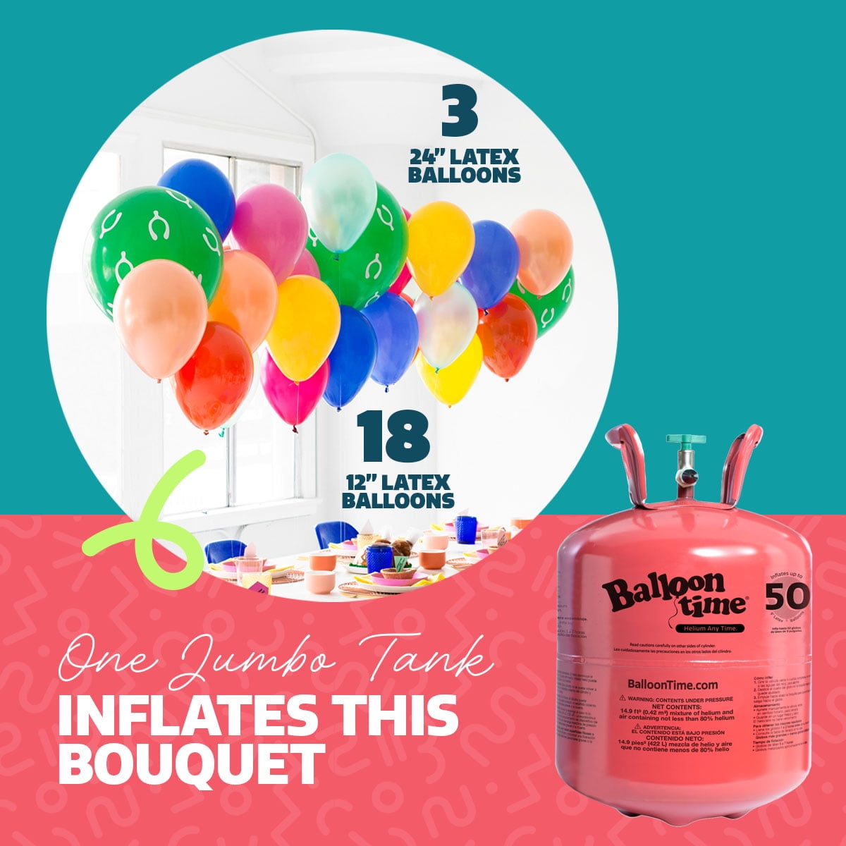 Helium kit includes a 14.9 ft³ helium/air mixture tank, 50 assorted-color 9″ latex balloons, and 1 spool of white ribbon (piece count: 52 total pieces) Portable and ready to use—no assembly required for quick, on-the-go celebrations Inflates up to 50 standard 9″ latex balloons (included); also compatible with foil balloons (sold separately) Perfect for birthdays, baby showers, holidays, graduations, and more—wherever the party takes you For best results, inflate balloons 1–2 hours before your event; average float time is 5–7 hours Easy inflation instructions: Rotate the green valve 4 full turns, place the balloon on the black nozzle, hold in place, and gently press down to release helium Shape matters! Fill latex balloons to resemble an egg (not a light bulb) for better performance and longer float time