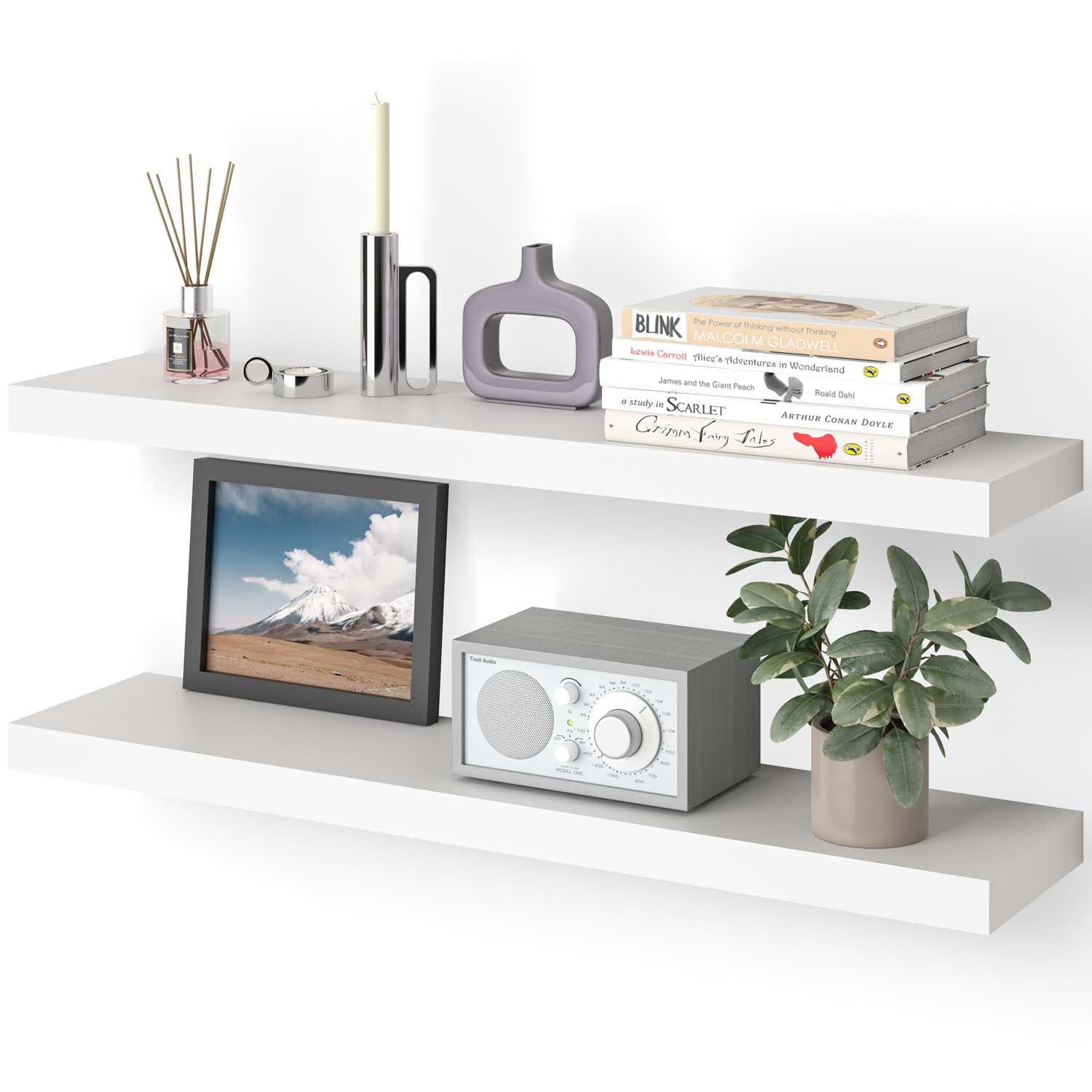 Set of 2 wooden floating shelves for wall to display books, toys and knick-knacks Hidden mounting metal brackets allow higher weight capacity and easy installation Use these shelves as a floating bookshelf, photo frame ledges, spice rack in kitchen and more With invisible mounting support these modern shelves look truly to be floating No assembly required. Easy-to-follow instructions and hanging hardware are included High quality mounting hardware allows 20 lb weight capacity per shelf Dimensions (Each Shelf): 35.5 x 8 x 1.5″ (WxDXH) Made of composite wood with metal hanging brackets