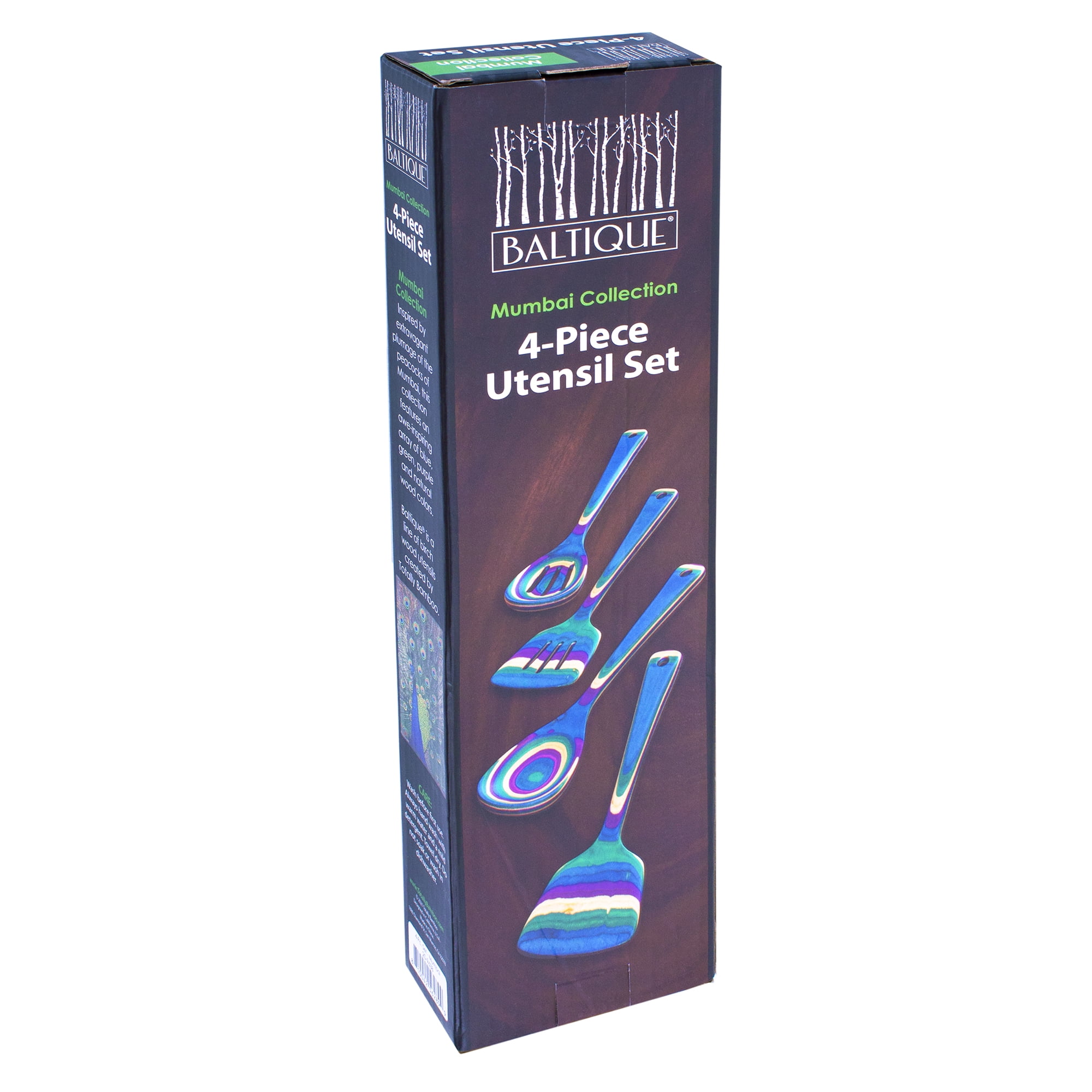 CRAFTED WITH COLOR: These gorgeous utensils feature an eye-catching blend of electric blue, vibrant green, royal purple and natural birch wood colors A VARIETY OF FUNCTIONAL TOOLS: 4 piece utensil set includes a Mixing Spoon, Slotted Spoon, Spatula and Slotted Spatula MASTERFUL MIXING SPOONS: At 12-1/2 inches long, these beautiful mixing spoons can reach even the deepest of cooking pots; they’re perfect for stirring up soups and sauces SPLENDID SPATULAS: These beautiful spatulas have ample length for flipping and turning food as well as for serving guests AN ESCAPE FROM ORDINARY UTENSILS: Our Mumbai collection takes inspiration for its vibrant color array from the extravagant plumage of India’s national bird, the peacock