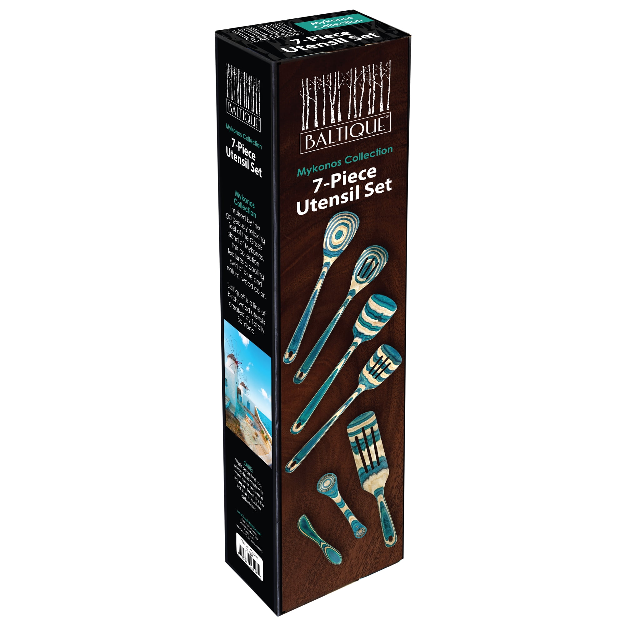 CRAFTED WITH COLOR: These gorgeous utensils feature a cooling blend of light blue and natural wood colors A VARIETY OF FUNCTIONAL TOOLS: 7 piece utensil set includes a Mixing Spoon, Slotted Spoon, Spatula, Slotted Spatula, Spurtle, 2-in-1 Measuring Spoon and Spreading Knife SERVE WITH STYLE: Add a splash of color to your next dining event that’s sure to draw attention from guests AN ESCAPE FROM ORDINARY UTENSILS: Our Mykonos Collection takes inspiration from the cooling blue water and lightly colored buildings of the Greek vacation destination EASY CARE: Simply hand wash or wipe with a damp cloth; do not soak in water or wash in the dishwasher
