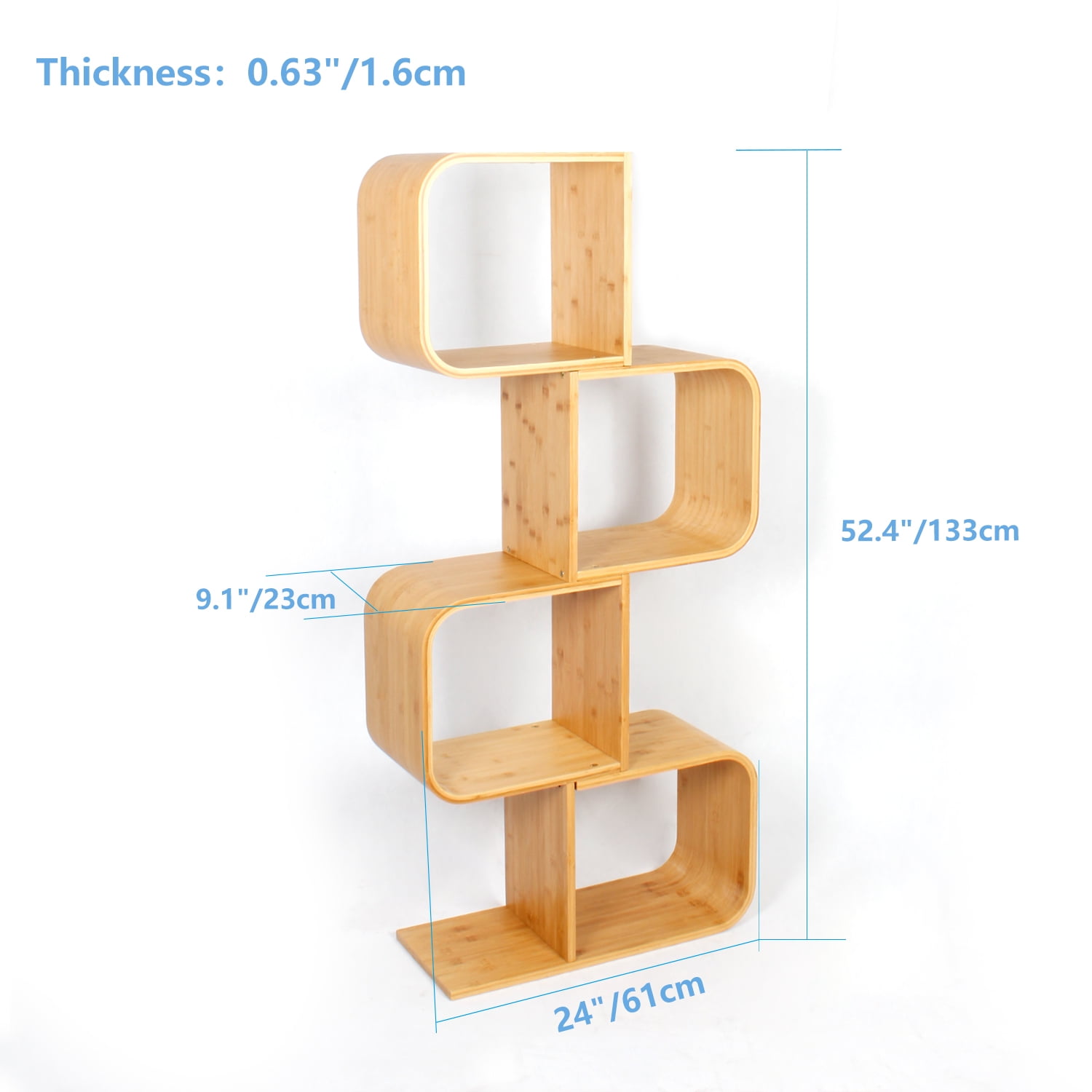 SPECIFICATIONS Material: Bamboo Wood Thickness of material: 0.63″/1.6cm Dimensions of the footprint.: 24″ x 9.1″ (L x W) 4-Tier Bamboo S-Shaped Bookshelf: Full height -52.4″/133cm 5-Tier Bamboo S-Shaped Bookshelf: Full height -65.4″/168cm Unique and Artistic Design The S-shaped storage shelf has a modern and stylish feel. Unique fashionable shape, rounded smooth and smooth lines, healthy natural bamboo material, artistic bookshelf can reflect your elegant taste, add beauty to your room decoration while making your mood better. Multifunctional S-shaped Bookcase With elegant appearance, it is not only a good storage bookcase, but also a high class decoration for your house. It can also be used as a curtain divider for space, and the extremely creative idea is the separate “C” shaped storage bracket can be used as a coffee table. It is suitable for your living room, bedroom, office, hallway, study, etc. If you have any questions before or after purchase, please contact us and we are ready to help.