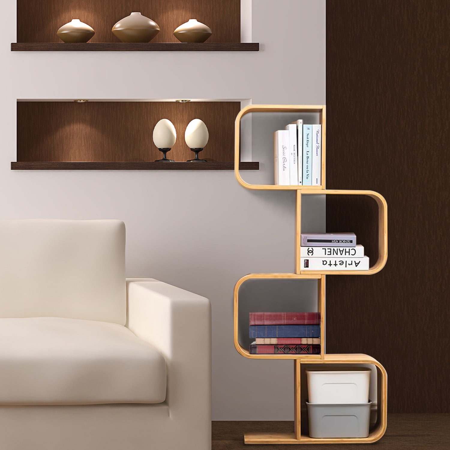 [Creative S-shaped Bookshelf]: The decorative geometric bookcase has a modern style S-shape design that makes it possible to store books, CDs, vases, ornaments and other things while it can decorate the room well, it can easily display collections and has an open design. [Multifunctional Organizer]: This cube storage cabinet can be used in many places, because it is not only a collection display shelf, but also a bookshelf, and can be disassembled into 1-Tier book shelf as a small coffee table. [Simple and stylish]: Elegant rounded corners and modern structure blend with any decorative style. It fits perfectly in any corner of a living room, study, bedroom, balcony, school, office or library. [Large Capacity]: With a large capacity but small footprint and wide, sturdy panels, this bookcase is ideal for storing and displaying things like favorite collectibles, books, potted plants, and more. It also has fixtures (Oxford cloth wall anchors) that add stability to the bookcase and reduce the risk of tipping over. [Reliable Materials]: Elegant bookshelf made of natural bamboo, bending process and environmentally friendly paint. Instructions and tools are included in the package, and it only takes about 30 minutes to assemble this bookcase.