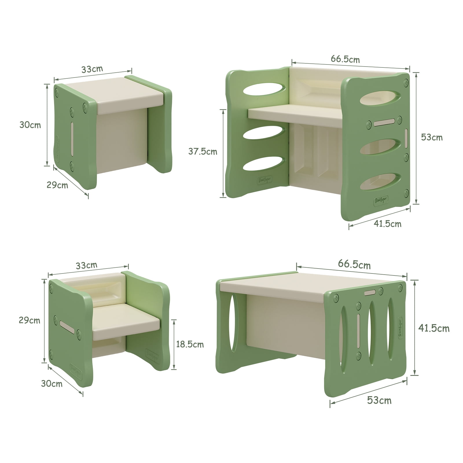 【Multi-purpose Design】 Multi-purpose Design to meet Your Different needs. The kids table & chair set can also be used as a sofa, activity table and a studying desk and more. Kids can eat, write and play on the table. It’s suitable for different scenes of daily life 【Sturdy & Stable Structure】 Thickened HDPE material can ensure long service life and high load-bearing capacity. The stable structure of this toddler play table can ensure the safety of children. The rounded edges and smooth surface protect your kid’s delicate skin 【3 in 1 Kids’ Chair】 This chair offers you three ways to use it. Use it on one side for smaller toddlers with a 4.2″H seat, then turn the chair upside down as your kids grow for a 5.5″H seat. The third way is to turn the cube chair on its head side for use as a stool that can hold adults. It is interesting and interactive 【Space-Saving Design】 Two chairs can be stored under the table when not in use. The table with the handle is easy to carry. Can be moved to other places easily. Perfect for small space 【Easy to Assemble】No professional installation required. Our package comes with tool. Please read the instructions before installation 【Easy to Clean】 Don’t need to deliberately clean this toddler table and chair set, just occasionally wipe it with a damp cloth
