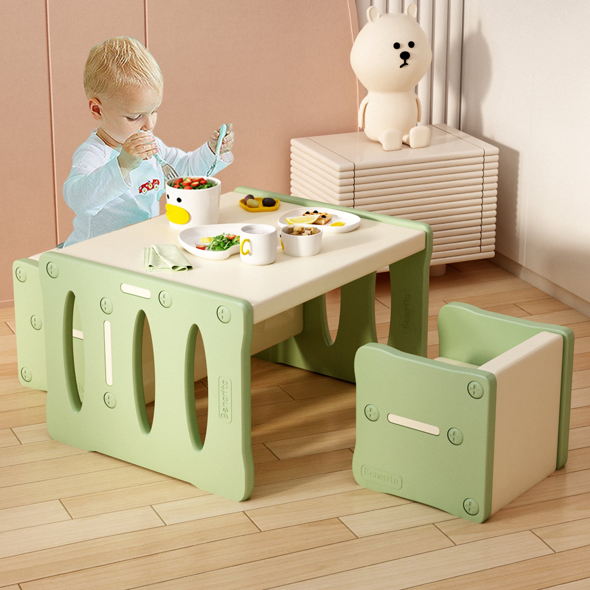 Banasuper Toddler table and chair set is sure to keep your children happily occupied. All pieces are made from thickened HDPE material ,and have smooth edges and a streamlined appearance. We just love how versatile and multifunctional this kids table and chair set is: Use it as a desk- style table with two chairs, or flip the desk over – it becomes a high-backed bench – and turn the chairs on their sides to create two tables. The fun never ends! Designed for everyday use in daycares and preschools, perfect for the home . What’s more, all three components are relatively light in weight, so it’s easy for you or your baby to configure or move from room-to-room. Easy assembly is required. This chair offers you three ways to use it. ????Use it on one side for smaller toddlers with a 4.2″H seat ????Then turn the chair upside down as your kids grow for a 5.5″H seat. ????The third way is to turn the cube chair on its side for use as a stool that can hold adults.